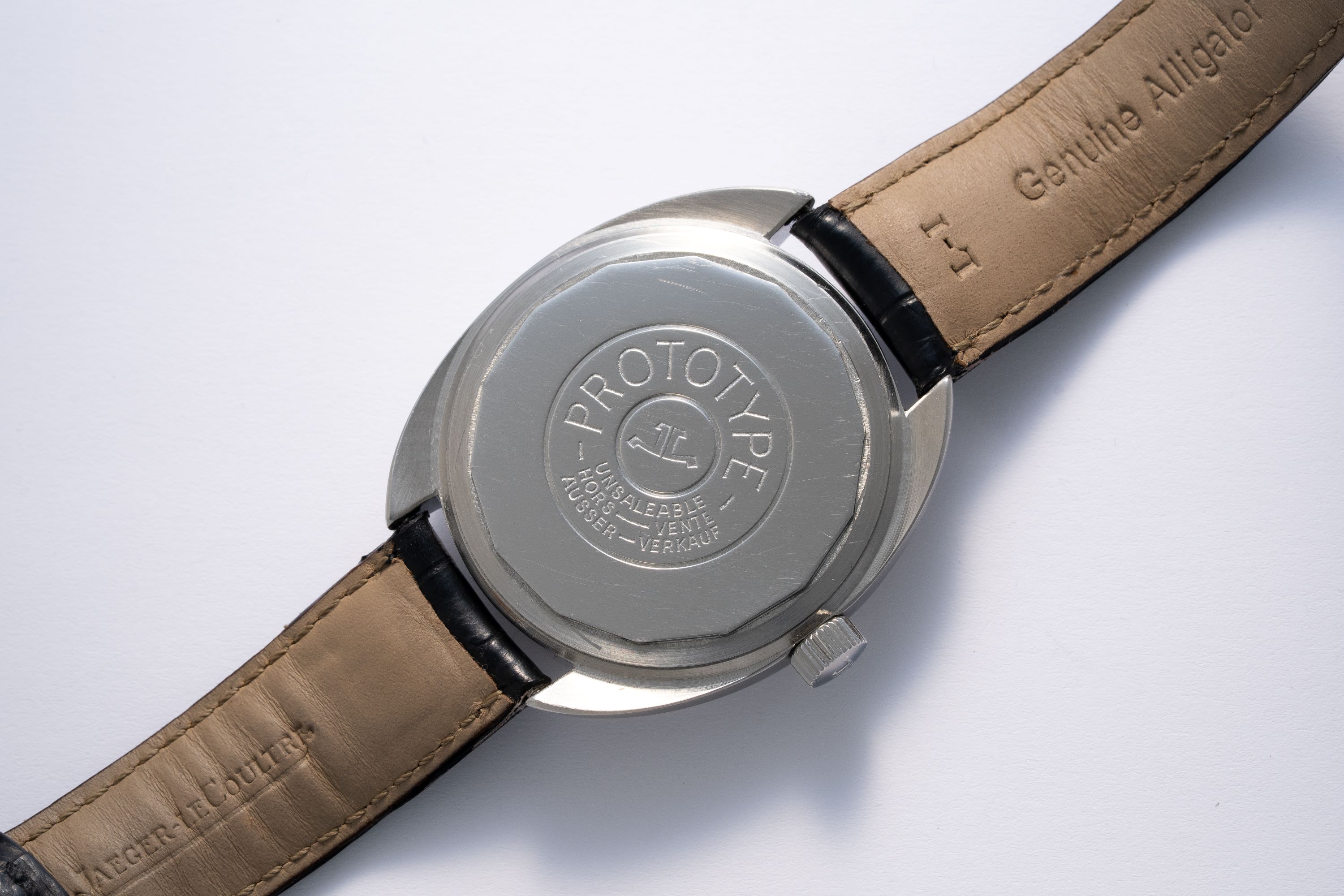 CaseCushion case in stainless steel with crown at 3 o'clock, engraved 'Prototype Unsaleable' on the caseback