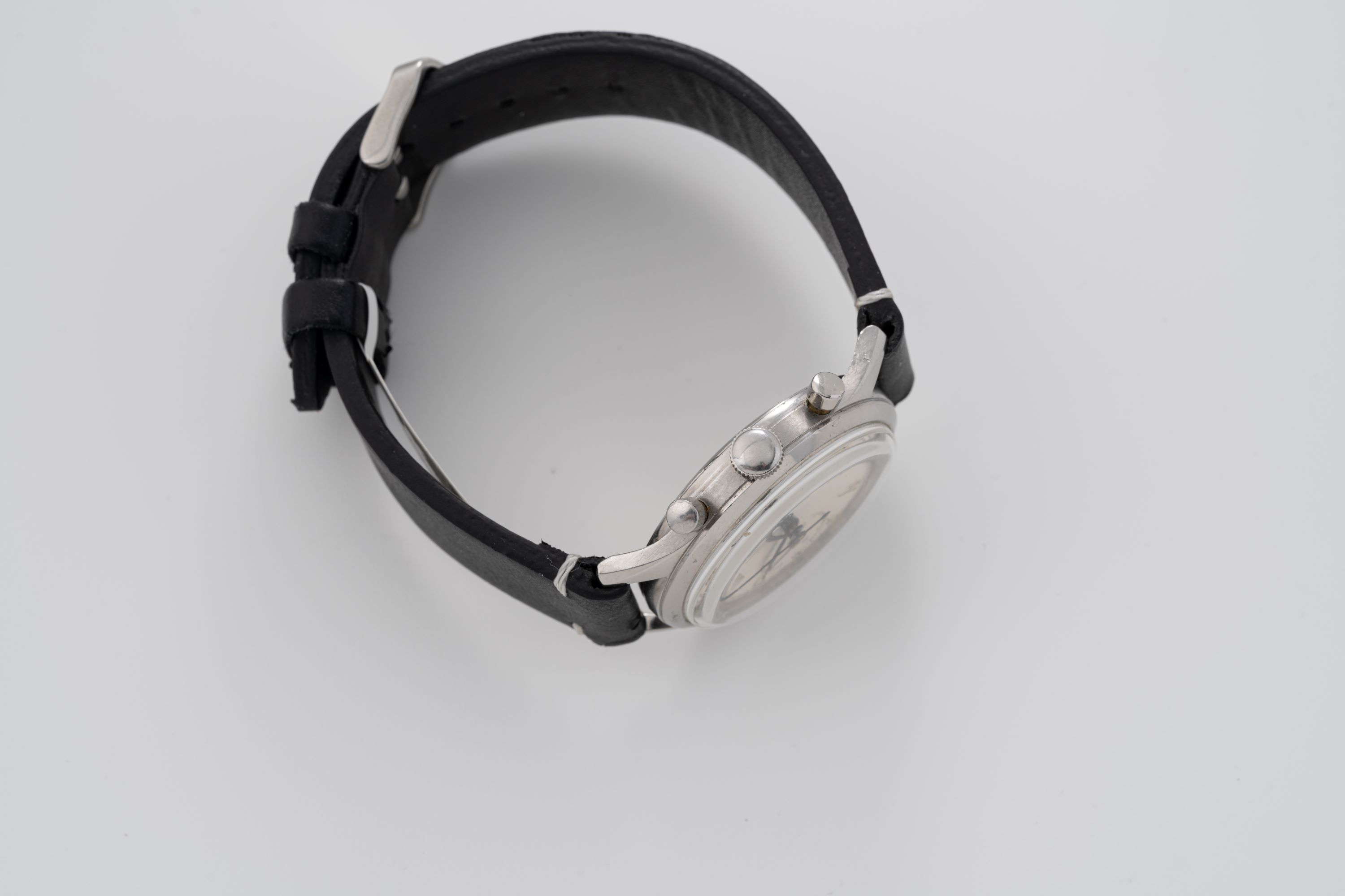 CaseRound case in stainless steel with chronograph pushers at 2 and 4 o'clock, winding crown at 3 o'clock, solid caseback