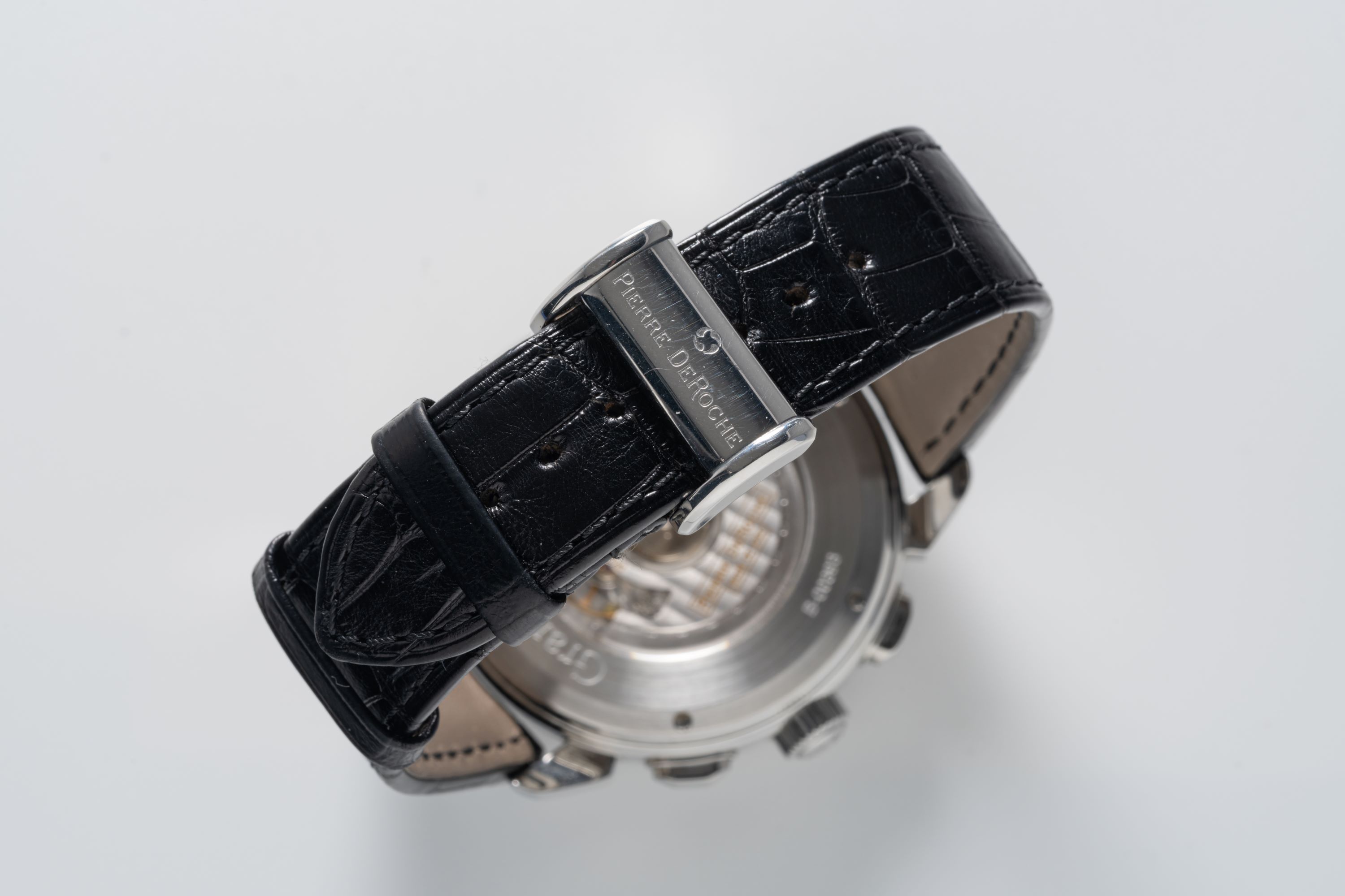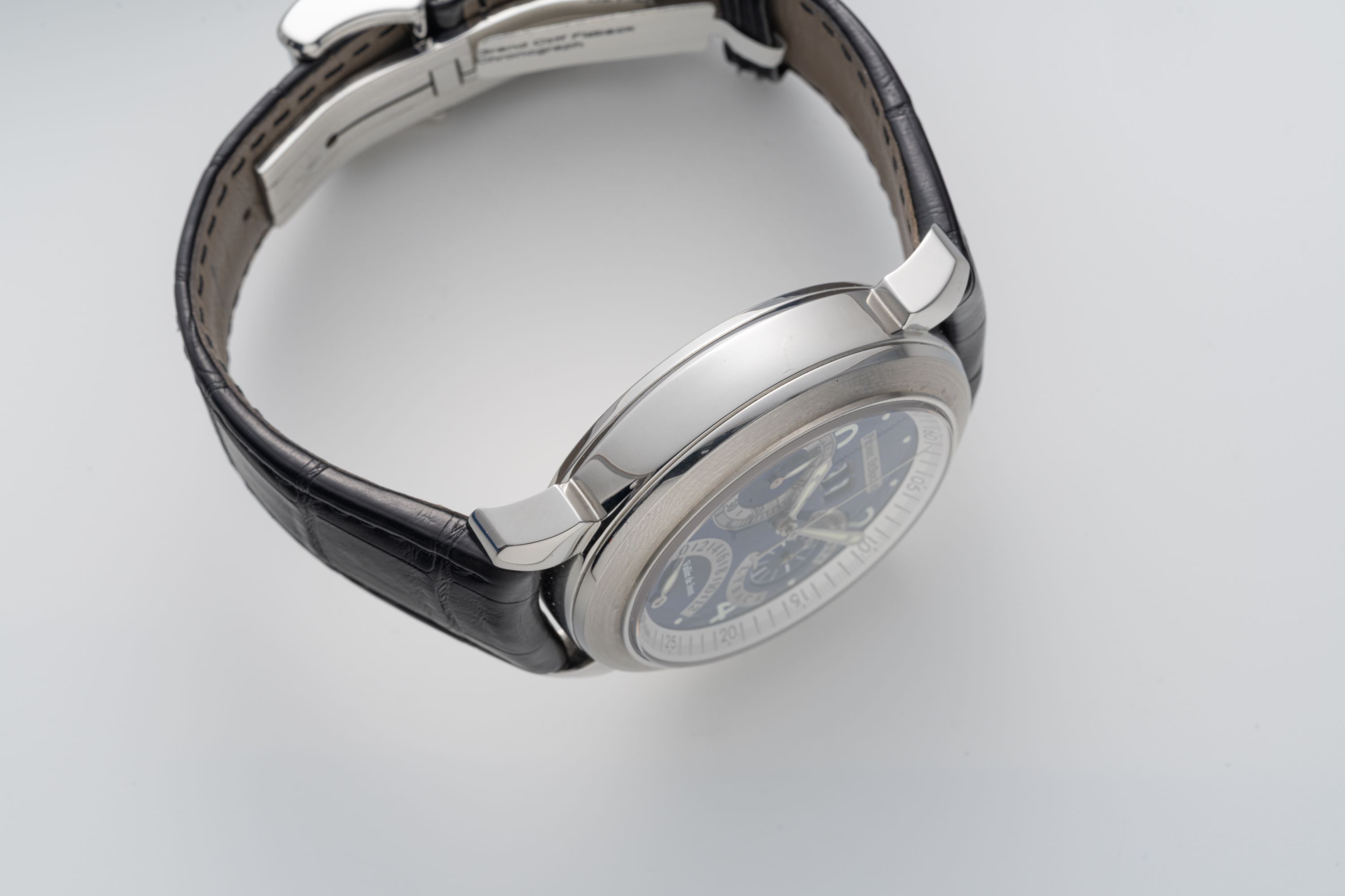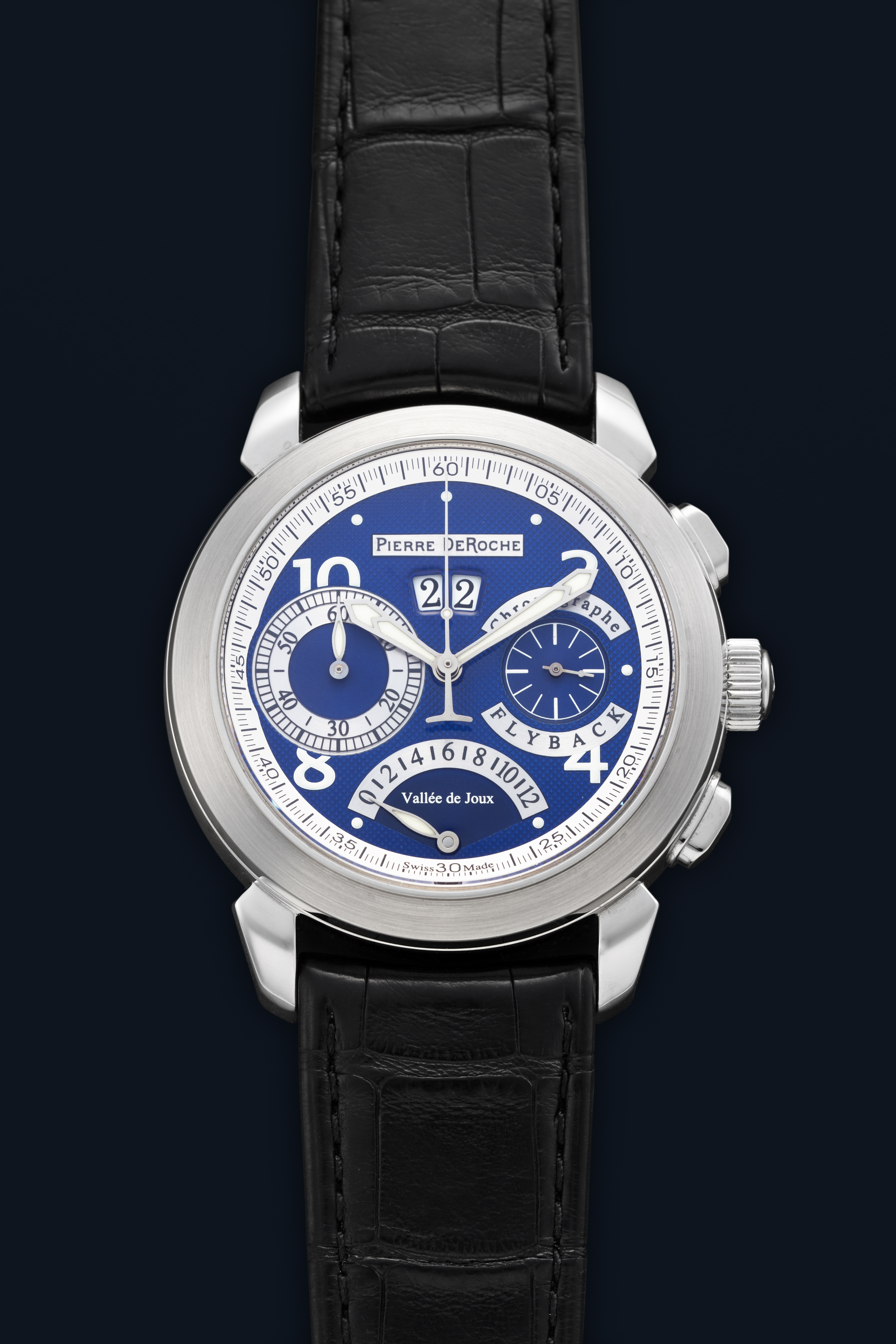 DialBlue guilloche dial with silver accents, luminous numerals, luminous hands, retrograde 12 hour chronograph counter at 6 o'clock, 60 minute chronograph counter at 9 o'clock, small seconds at 3 o'clock, big date at 12 o'clock, signed 'Pierre De Roche' at 12 o'clock