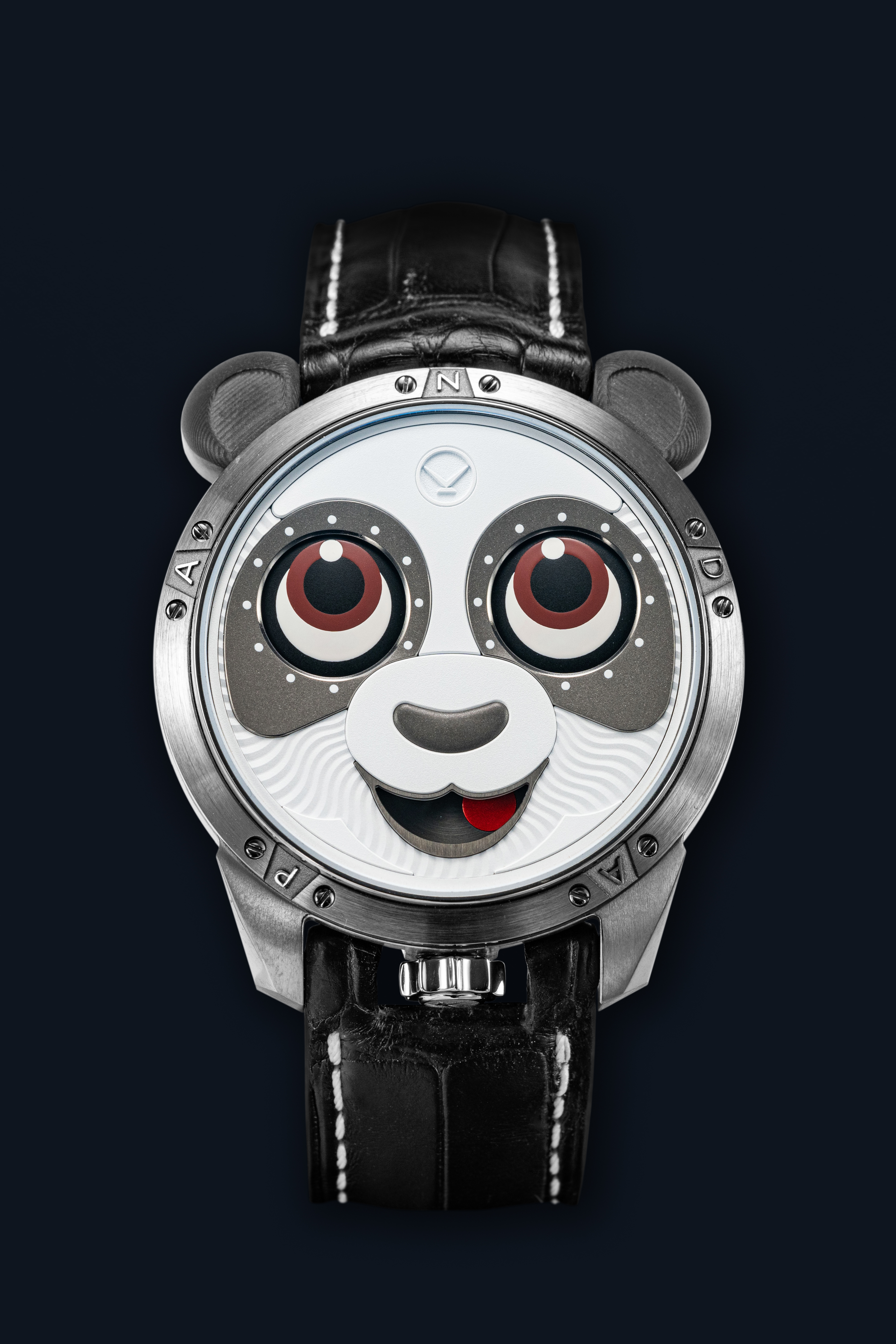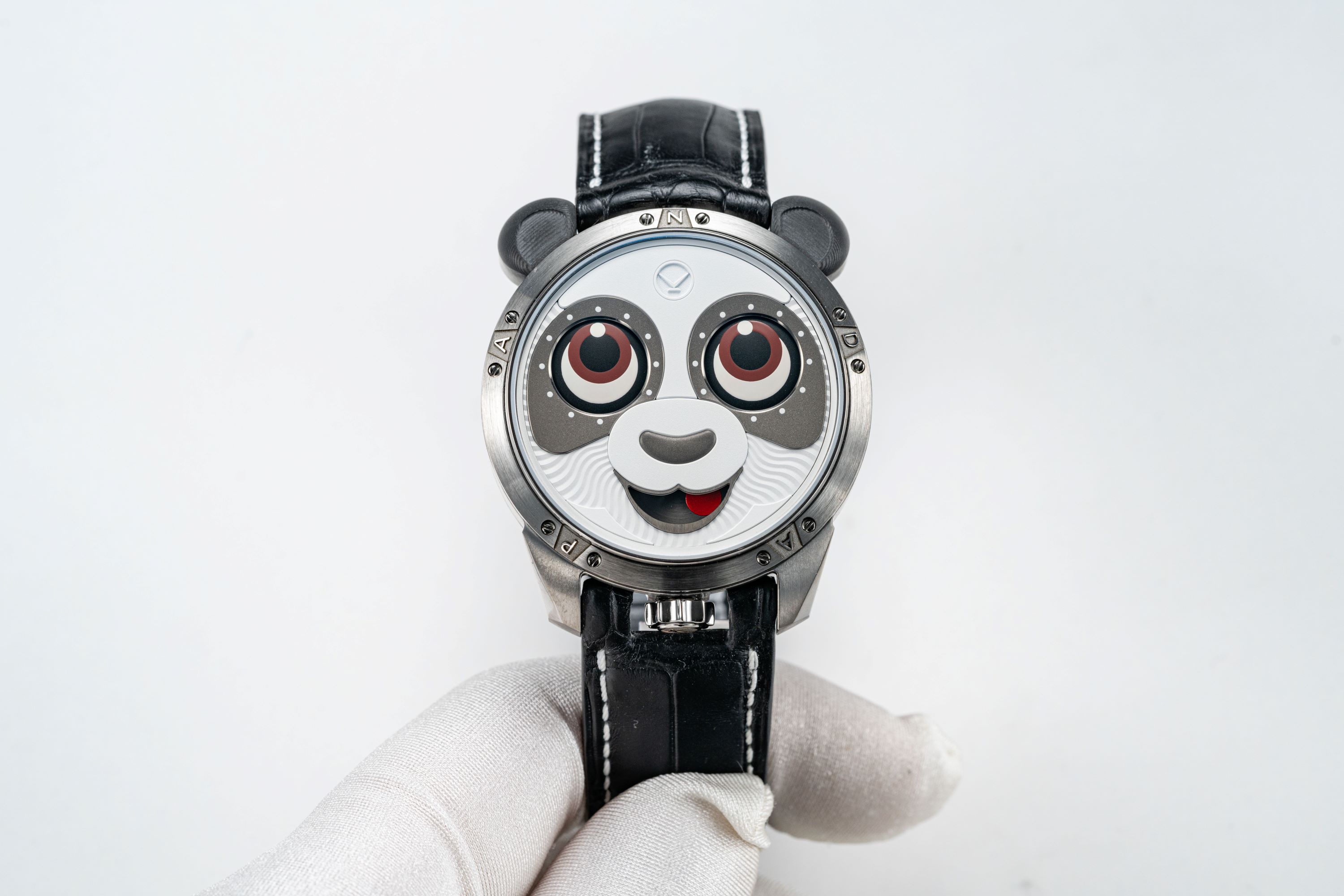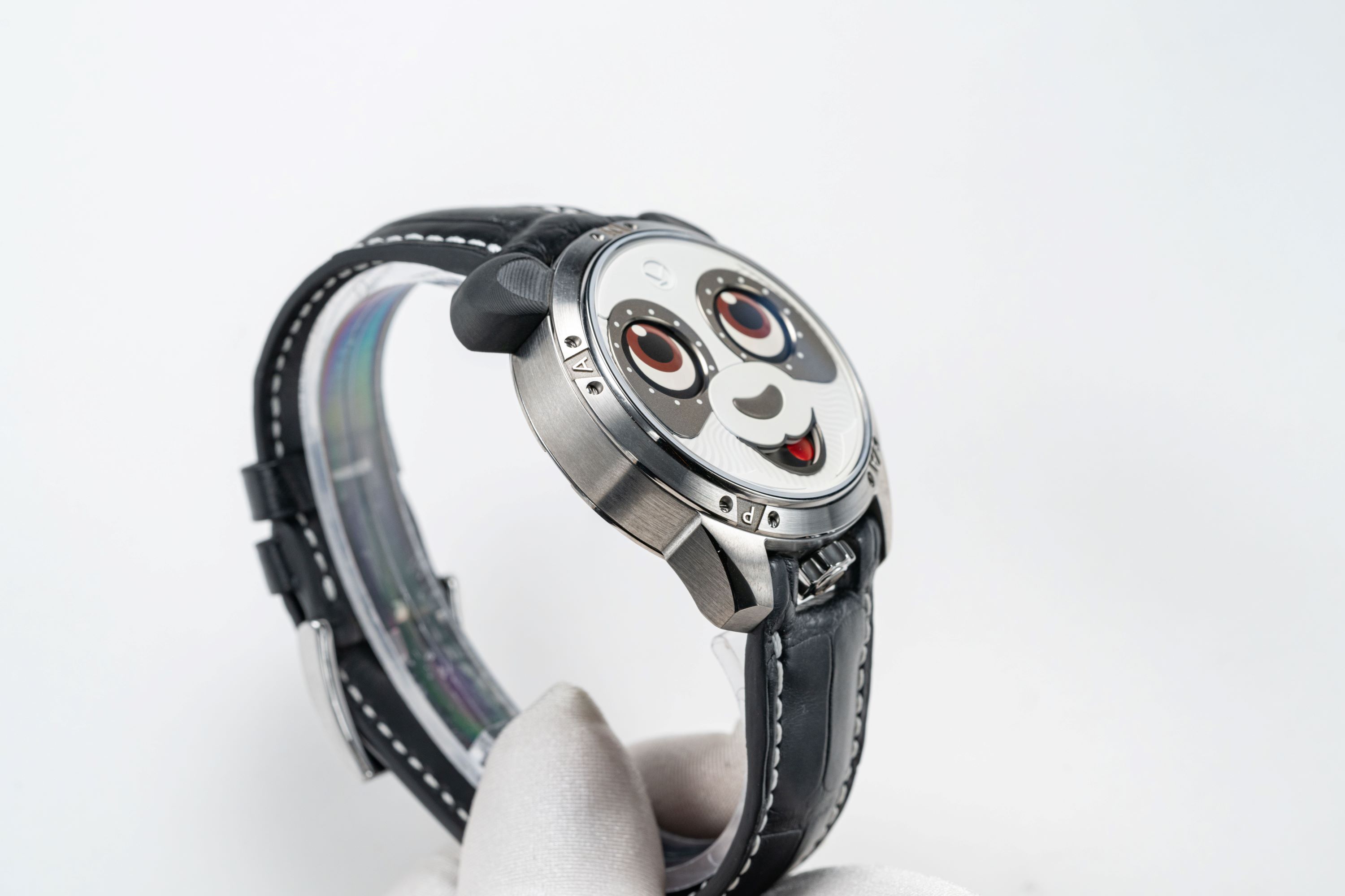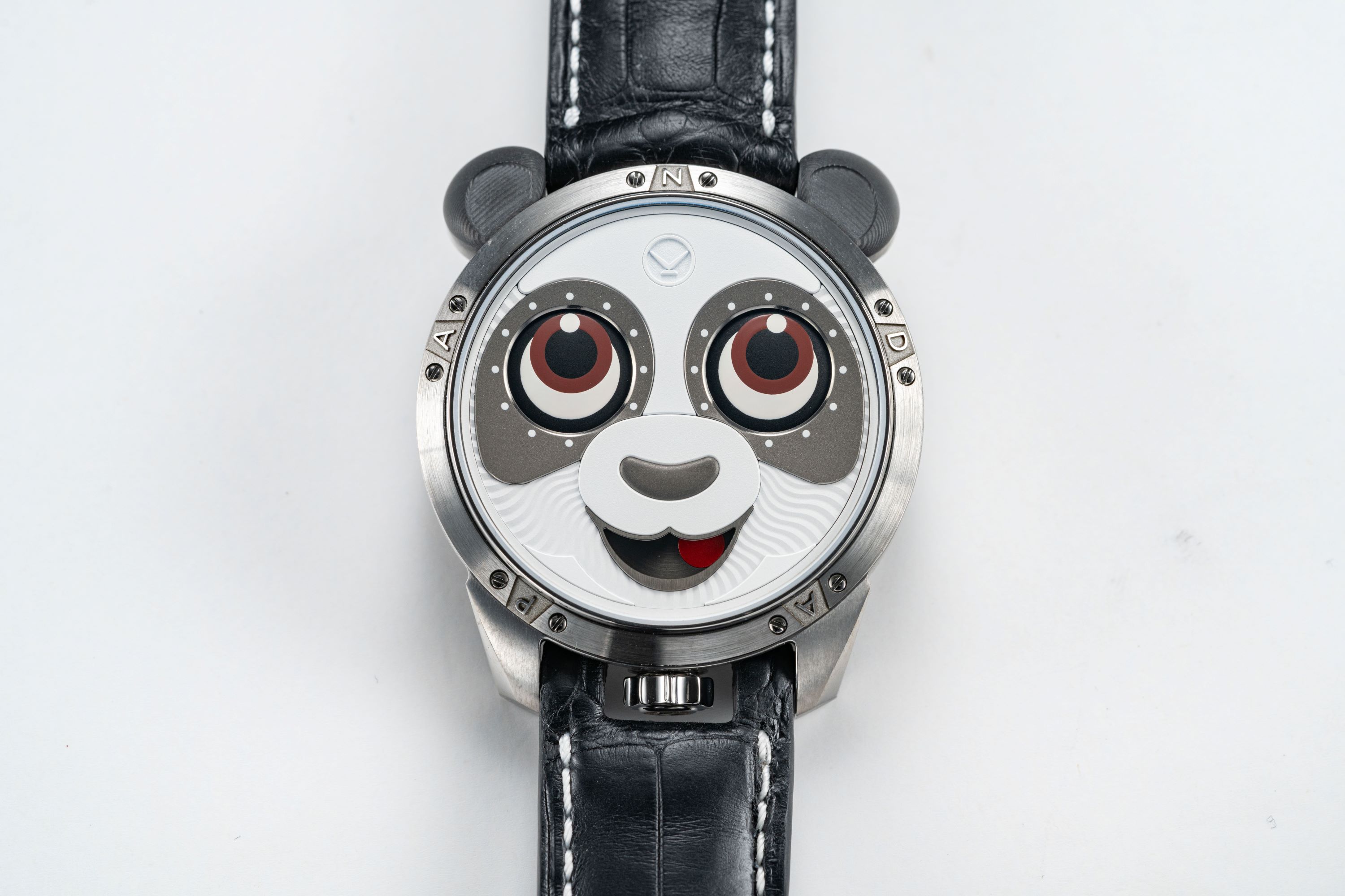 As always, Konstantin Chaykin pays close attention to the design and fine finishing of the dial. Creating the panda’s face  required a unique combination of decorative techniques. To give it softness, different grades of sandblasting were  applied to the white and black areas of the dial, while the black nose was given a smooth convex shape. The wavy, soft  texture of the fur is conveyed through a combination of sandblasting and radial wavy guilloché relief, the same  decoration Konstantin used on the dial of the first “Joker” watch. As with the Minions models, in the “Panda” he  avoided placing numerals around the character’s eyes, opting instead for small round indices.