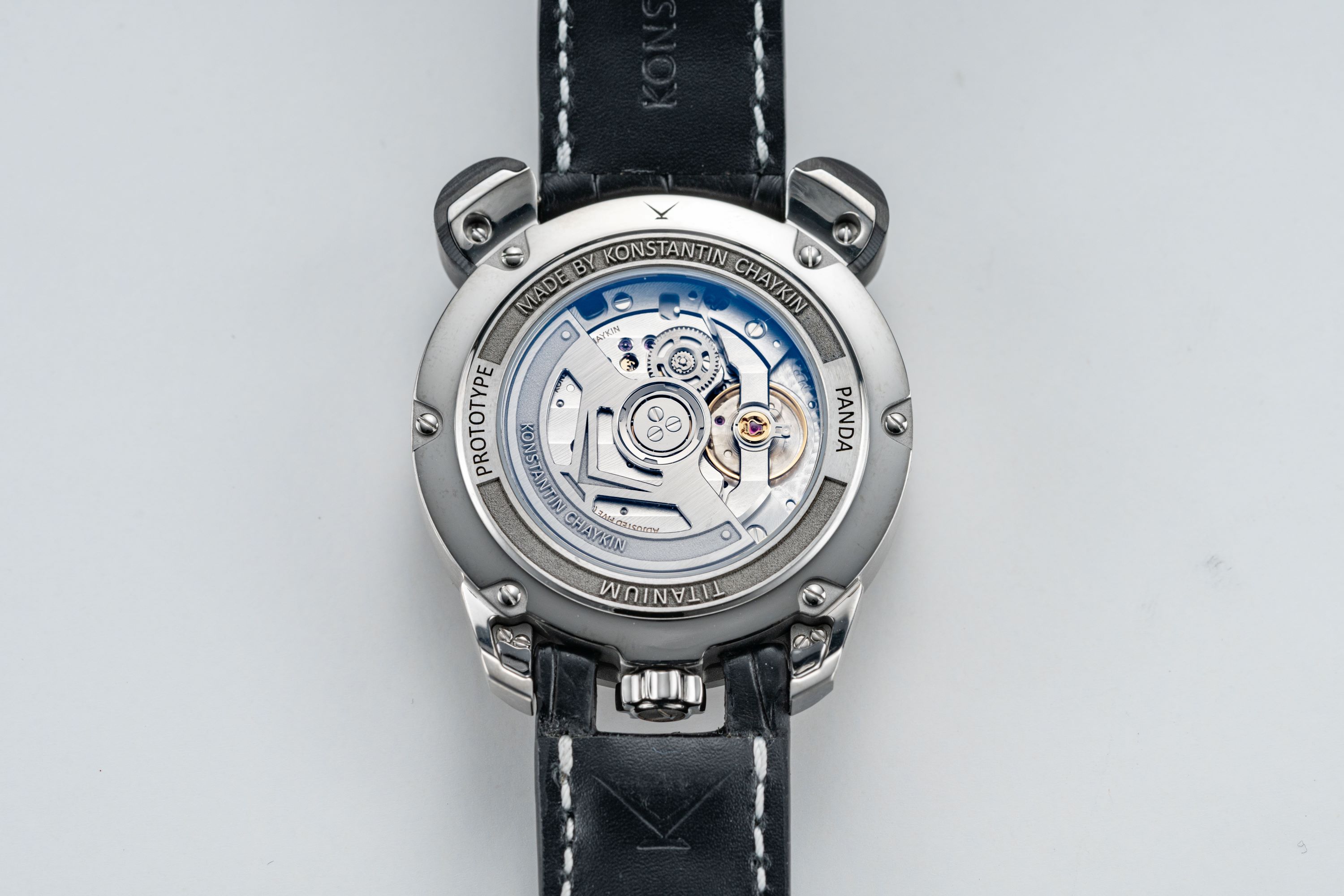 The “Panda” watch features the signature Joker-indication system. The eyes serve as disc indicators of hours and  minutes, while the moon-phase display takes the form of a smiling mouth – the DNA of the collection is unmistakable.  For the case, Konstantin Chaykin chose titanium: lightweight, durable, corrosion-resistant, and hypoallergenic. The case  finishing combines traditional techniques such as vertical and circular brushing, polishing, and sandblasting.