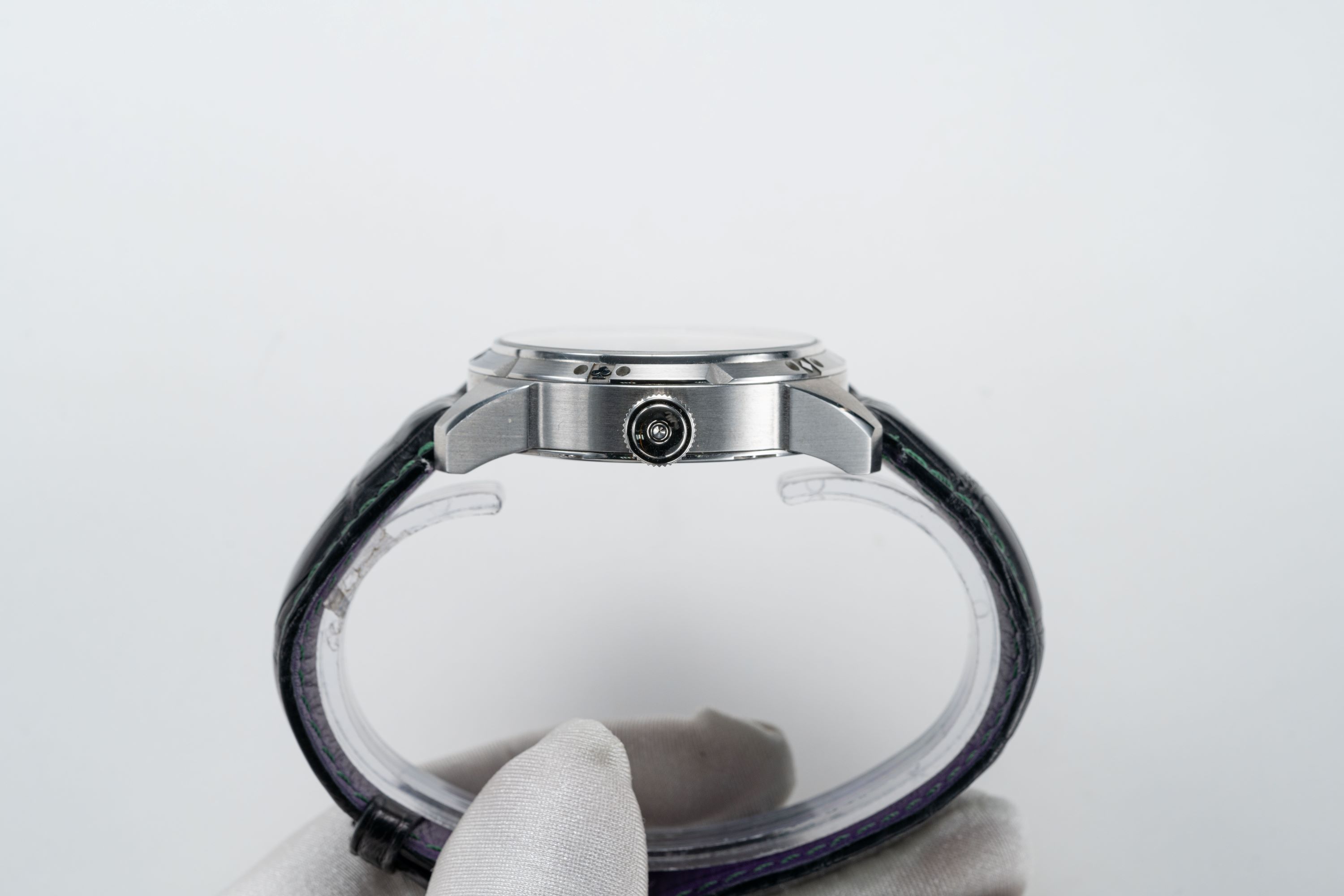 The lot presented features the classic palette of the original Joker: a white dial with green accents. The decoration includes “grain de riz” guilloché for the background and “pavé de Paris” guilloché. The transparent caseback does not conceal the high-quality finishing of the automatic calibre, which includes Côtes de Genève and hand-polished bevels.