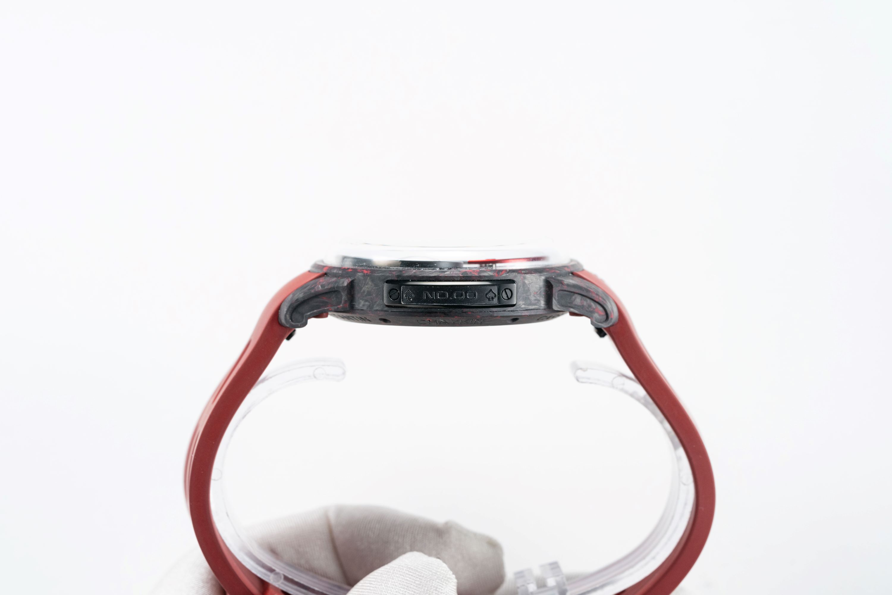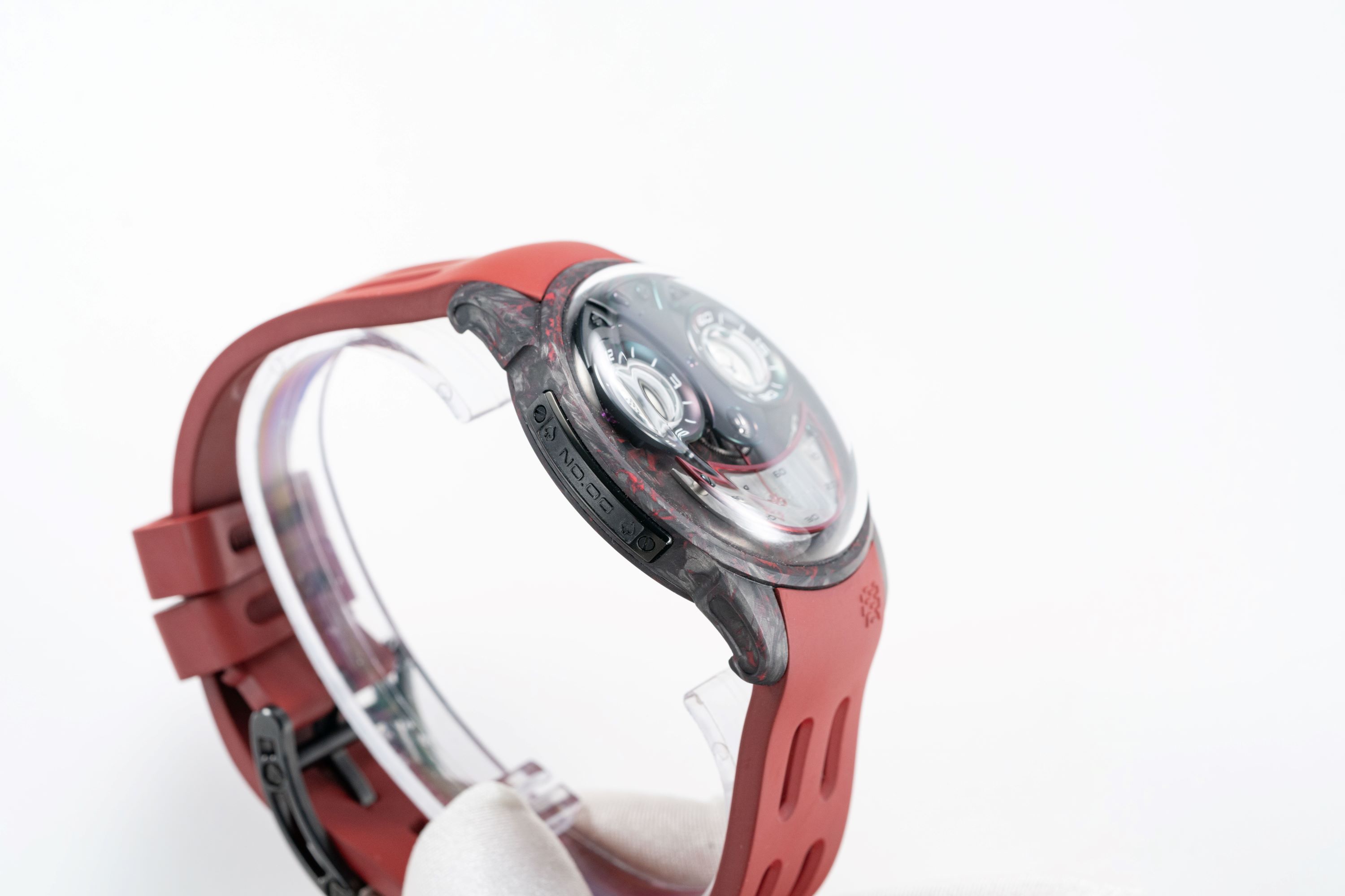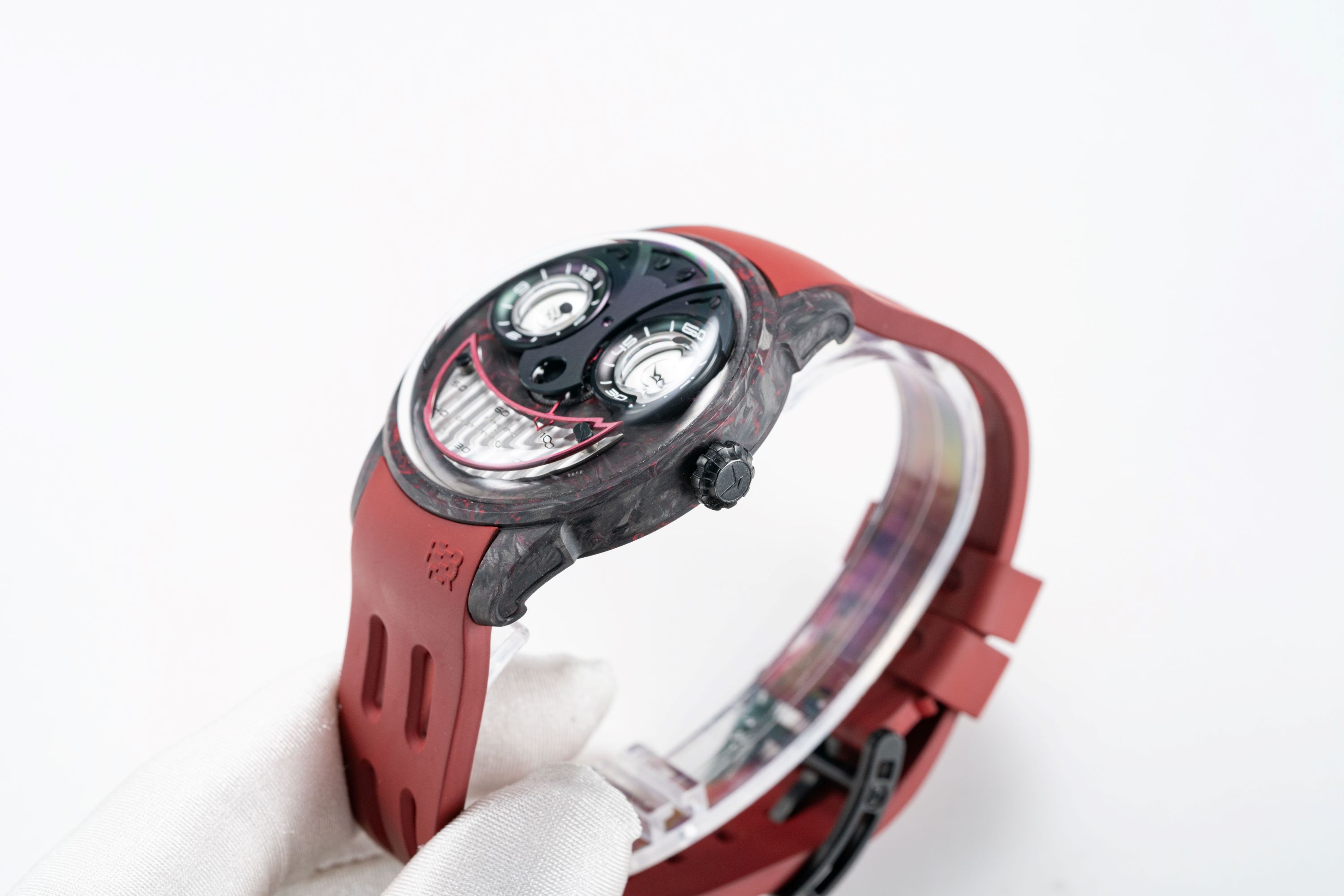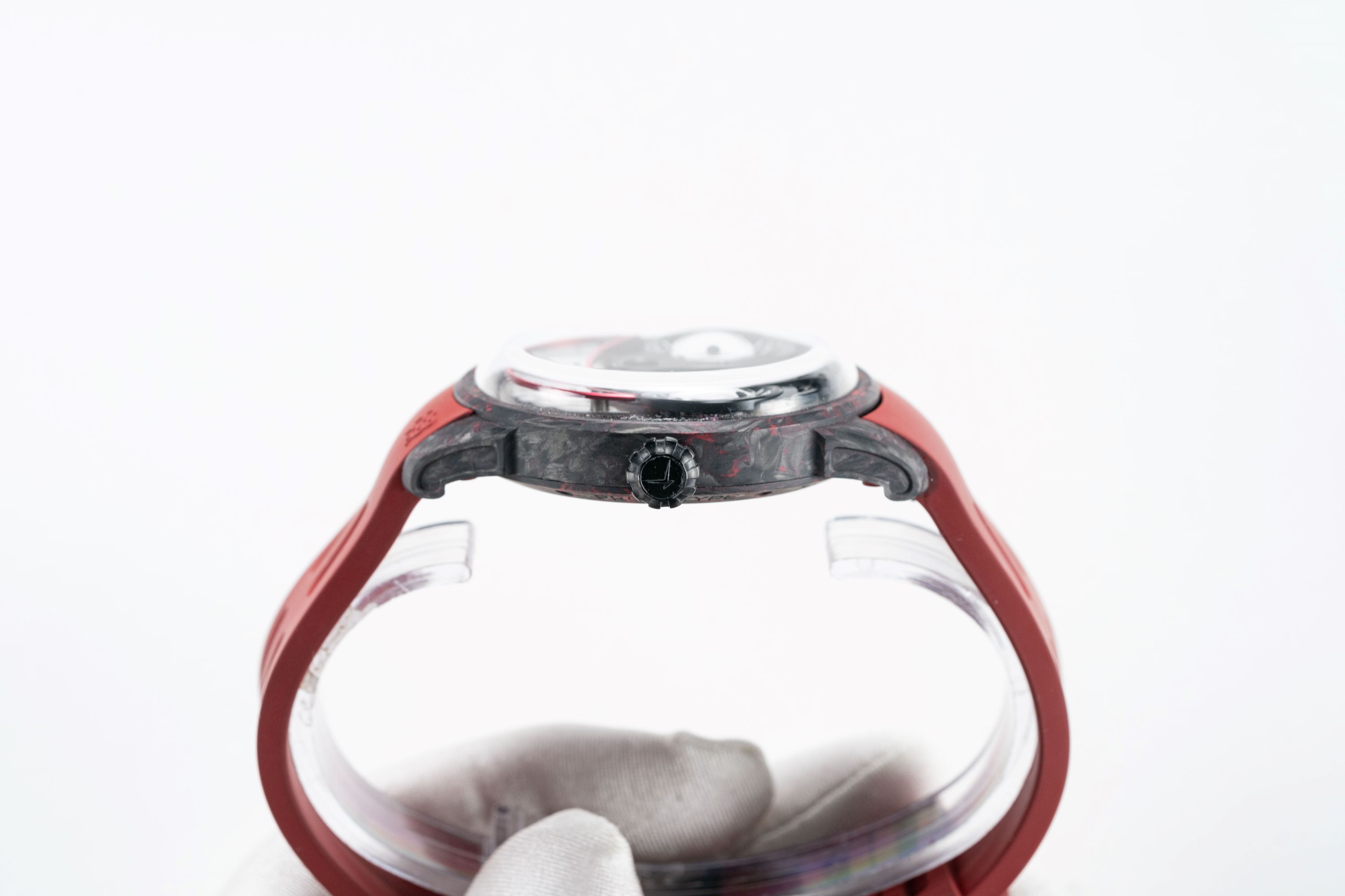 CaseManufactured of textured grey-black carbon fiber composite with red spots; sapphire exhibition caseback; winding crown in black-coated stainless steel. Domed sapphire crystal with internal anti-reflective coating