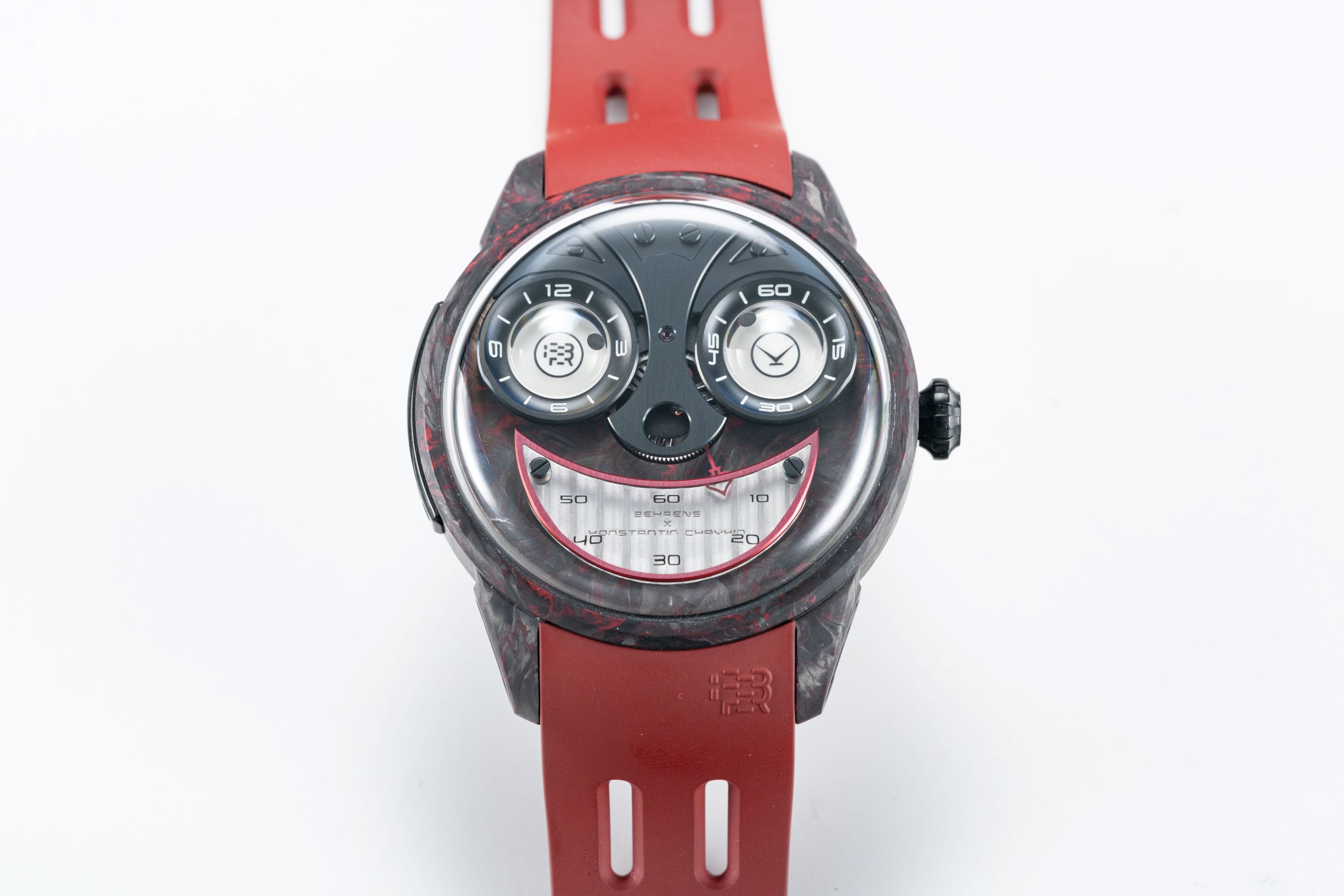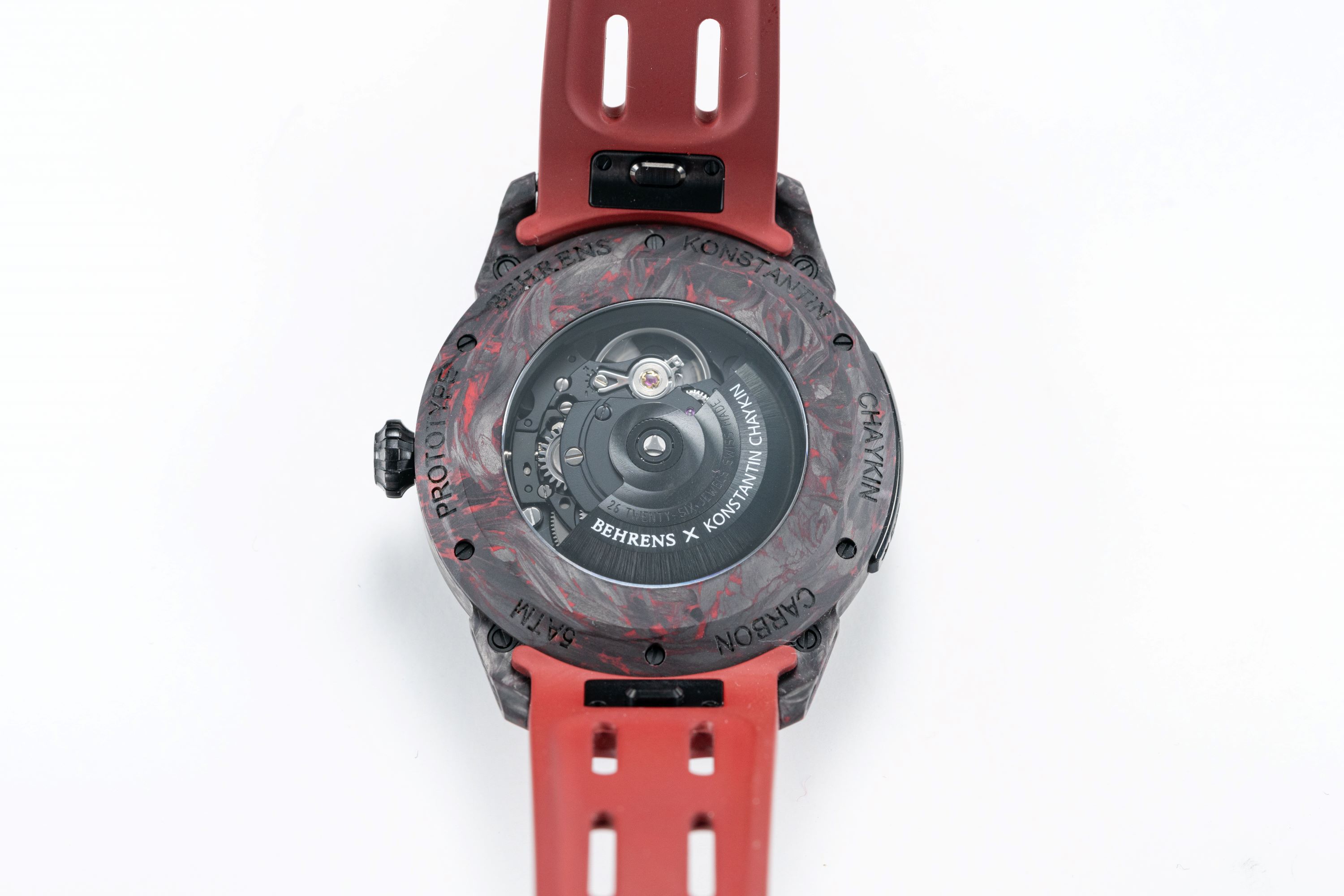 The Wristmon comes in a 42 mm case crafted from textured grey-black carbon fiber composite with red spots. In this joint project, Chaykin drew inspiration from the features of his signature Joker, while Behrens turned to an object of traditional Chinese material culture – the hand mill shi mo.