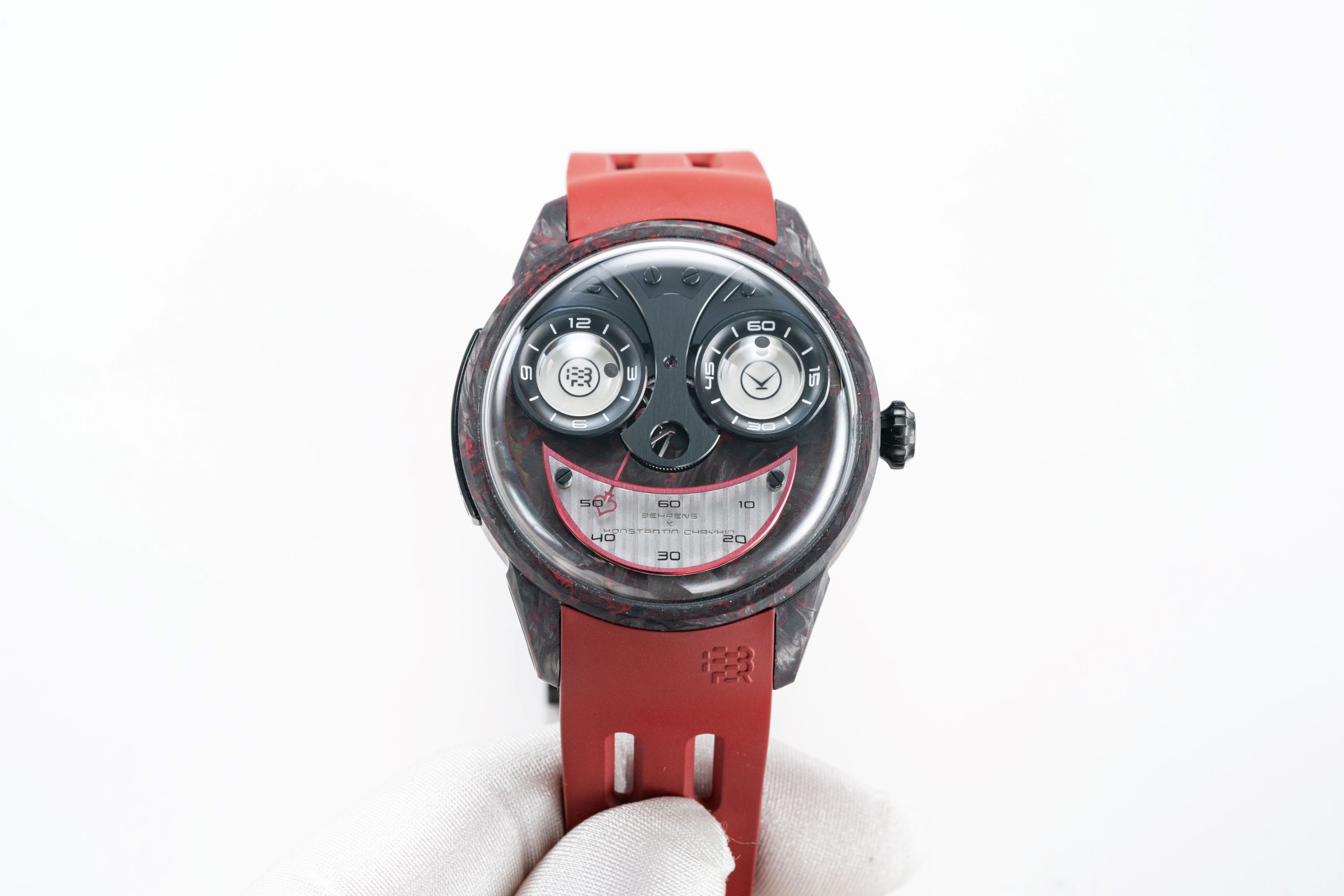 DialBrushed, chamfered, polished and black-coated parts; bottom plate in textured grey-black carbon fiber composite with red spots; luminescent coating on the hour and minute displays (eyes of the character)