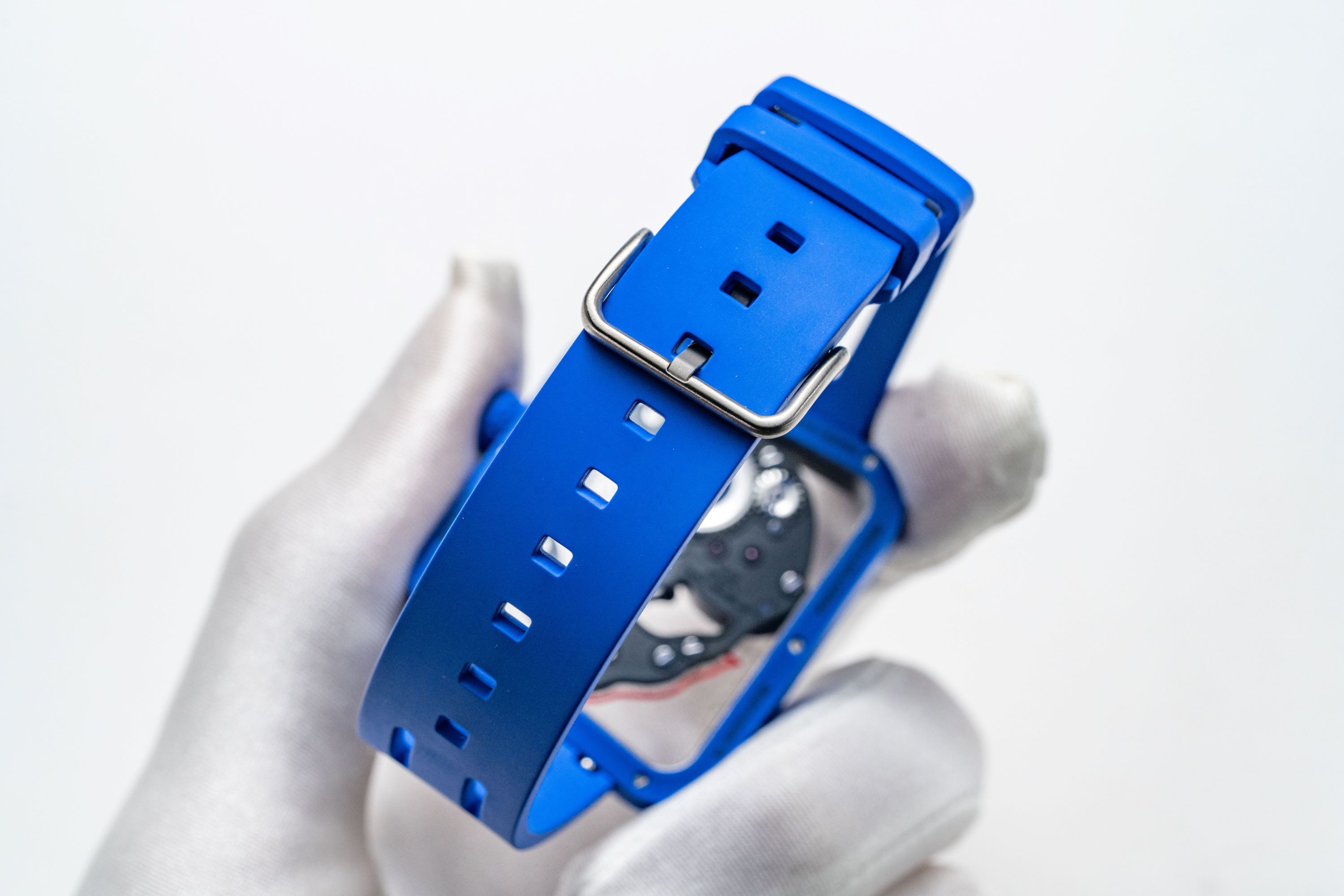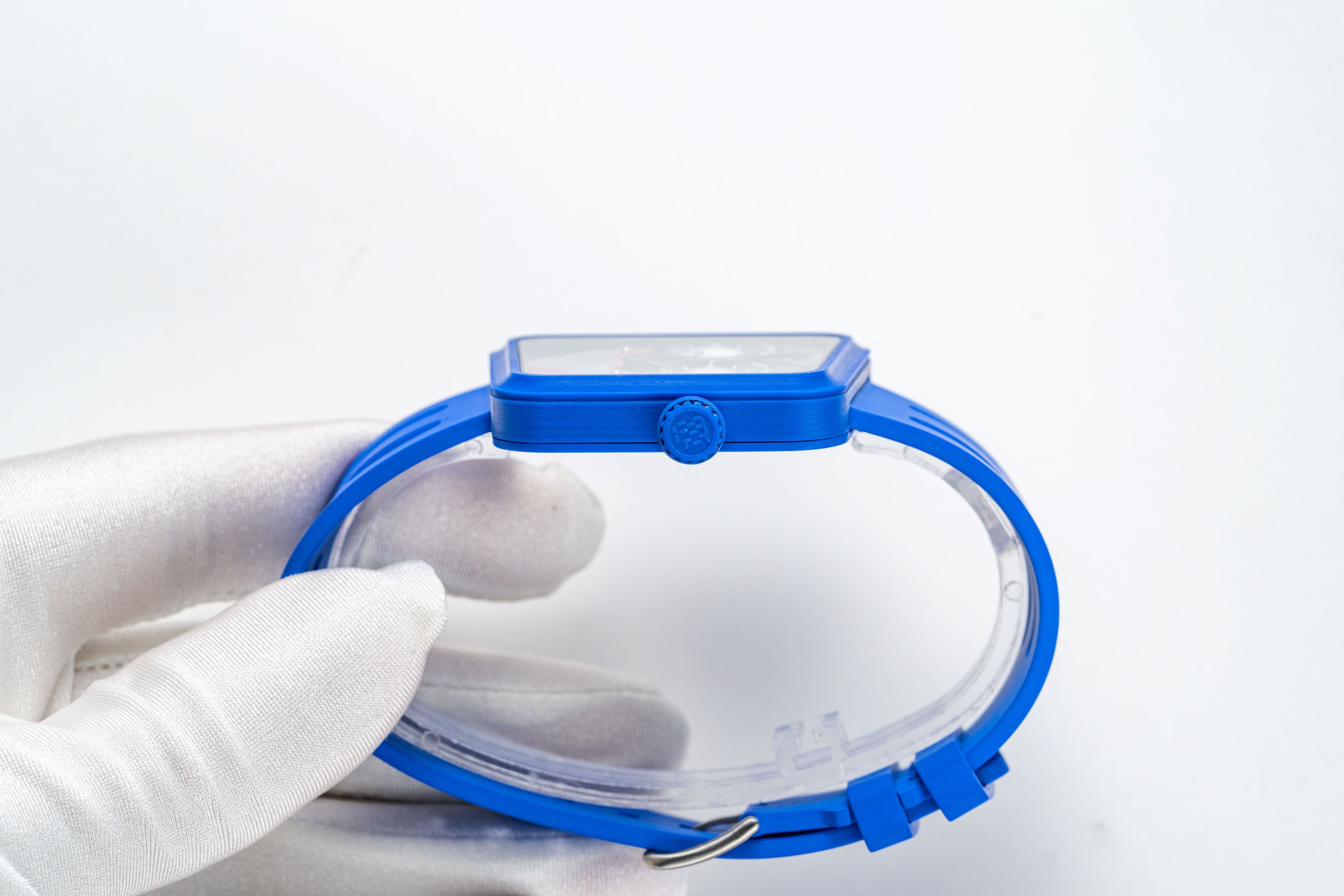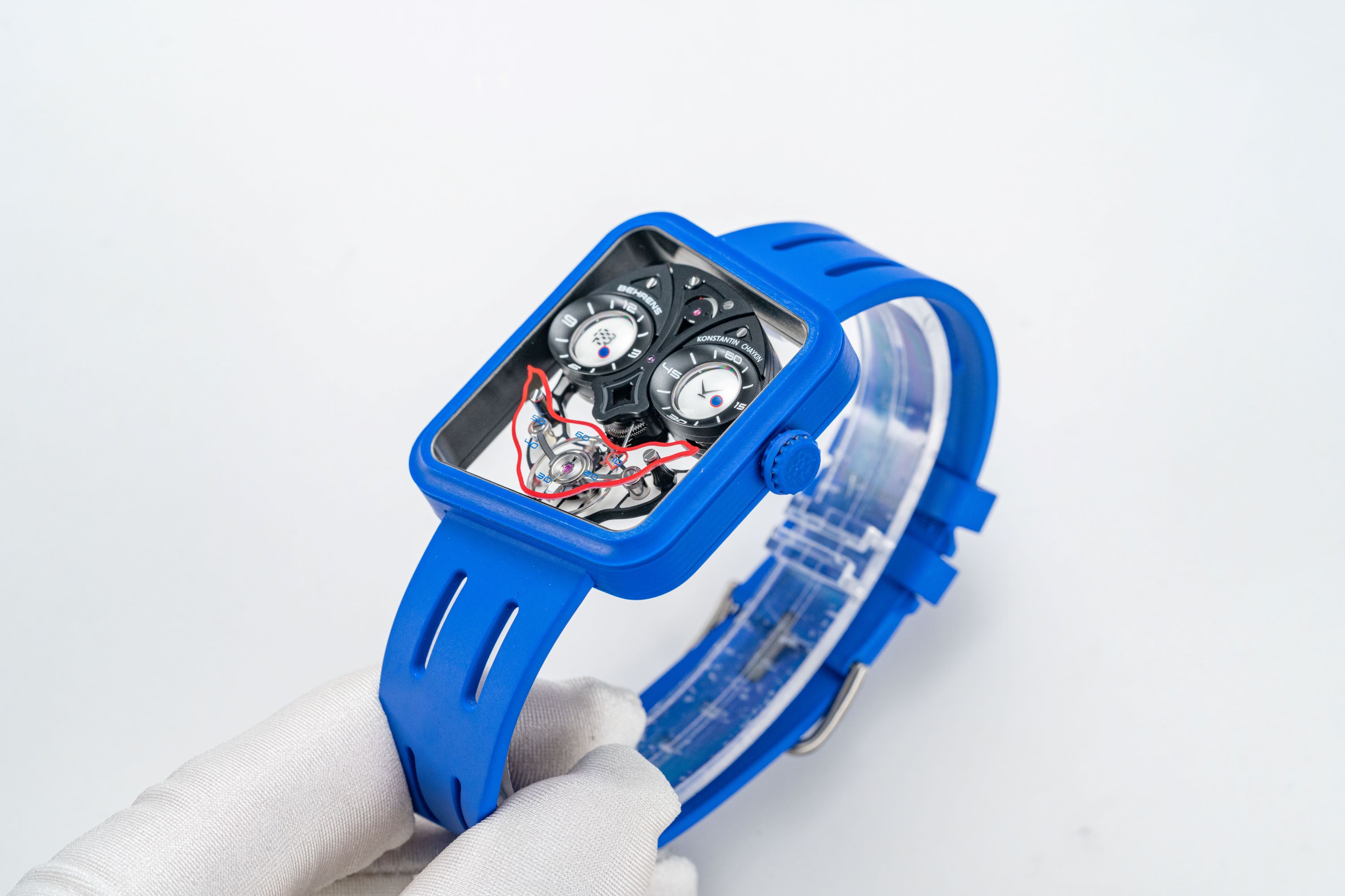 The design also references Chinese culture of the Eastern Han dynasty era, specifically the figure of the smiling “Storyteller Potter beating a drum.” The model features an asymmetrical case made of deep blue SPSCF carbon composite. Its skeletonized design makes the ingenious “smile” even more striking. Inside its mouth accentuated by a vibrant red outline moves a heart-shaped seconds hand, while the “eyes” indicate hours and minutes, and the power reserve of the manufacturer's calibre is shown at 12 o’clock.