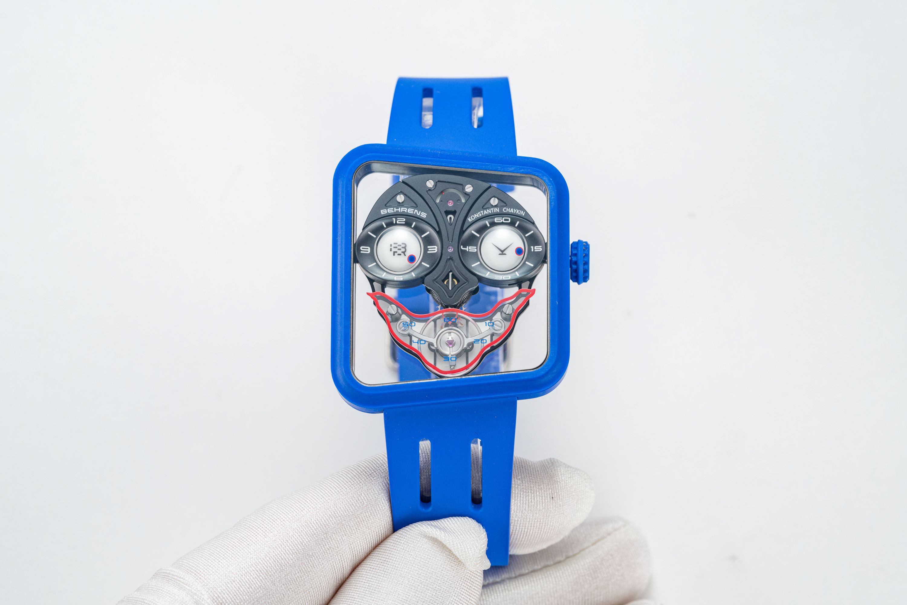 DialWith a large skeleton design, the watch exhibits a cleverly witty smiley face, its mouth accentuated by a vibrant red outline, and a red heart-shaped seconds hand that incorporates Behrens' patented stone mill mechanism, moving in a unique and playful path reminiscent of millstone rotation. The two eyes display the hours and minutes respectively, while a power reserve indicator is positioned at 12 o'clock.