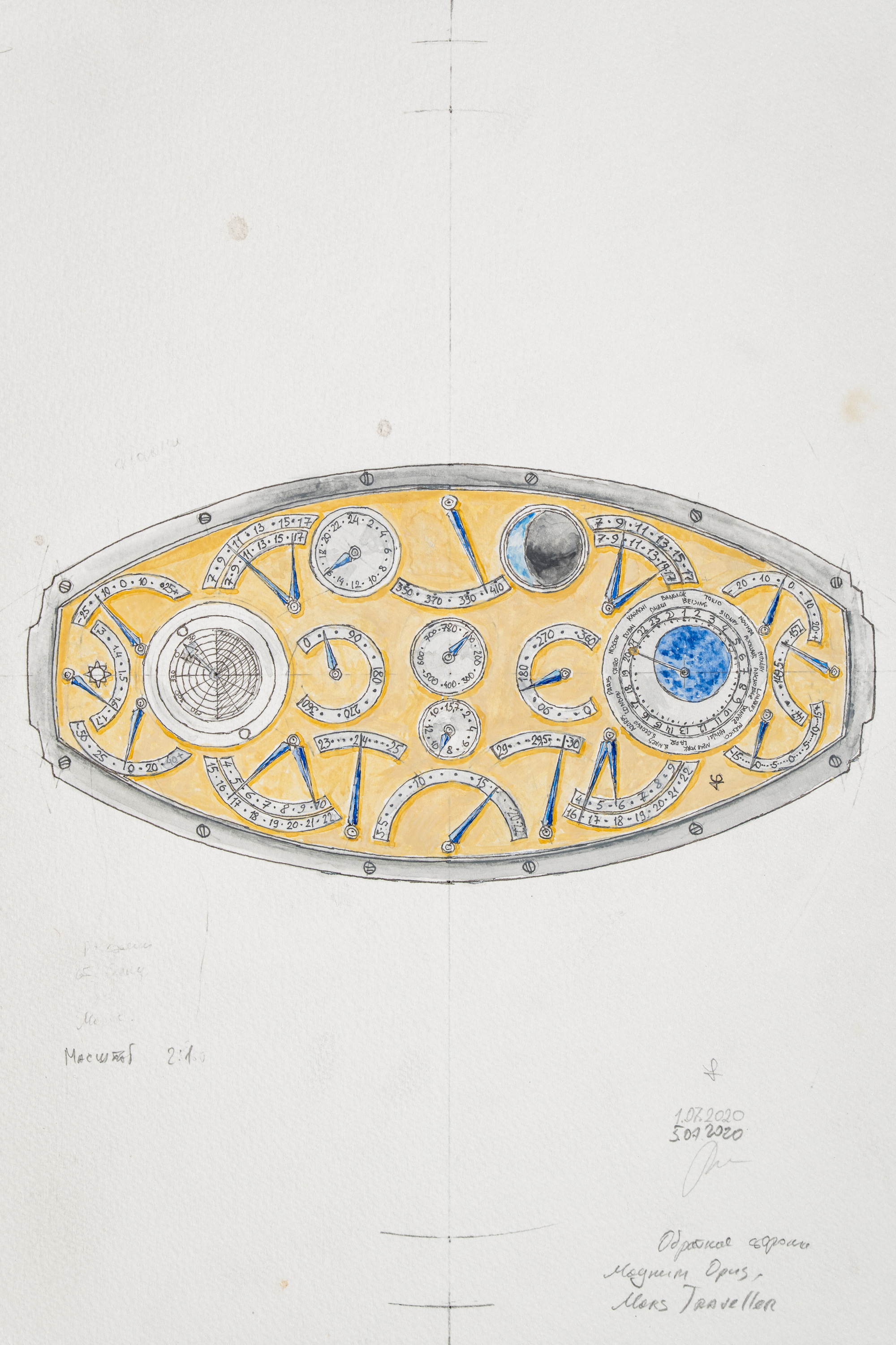 This artistically rendered sketch shows the reverse side of the Magnum Opus Mars Traveller watch – conceived by Konstantin Chaykin as the pinnacle of his “Mars Time” programme, dedicated to creating new space- and Mars-related complications for mechanical watches. For the Magnum Opus Mars Traveller, Chaykin set out to include the greatest possible number of complications.