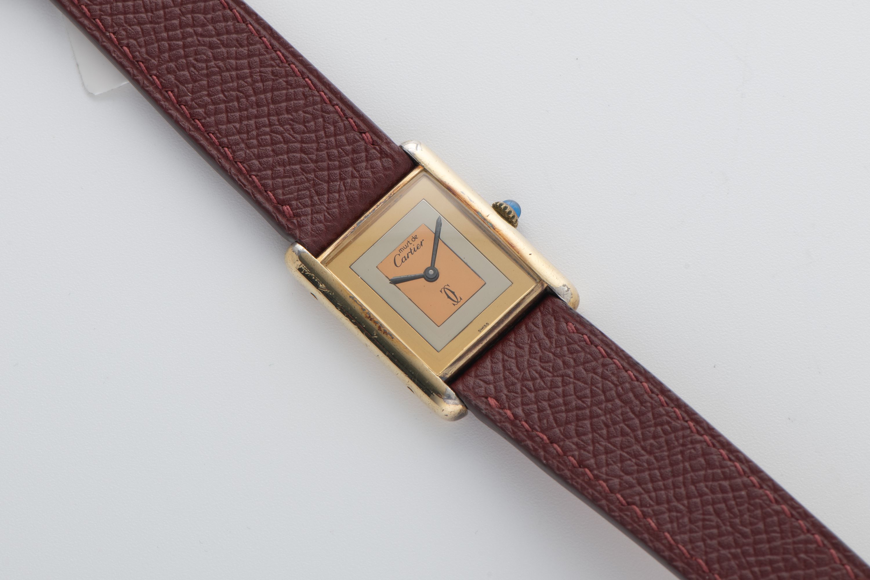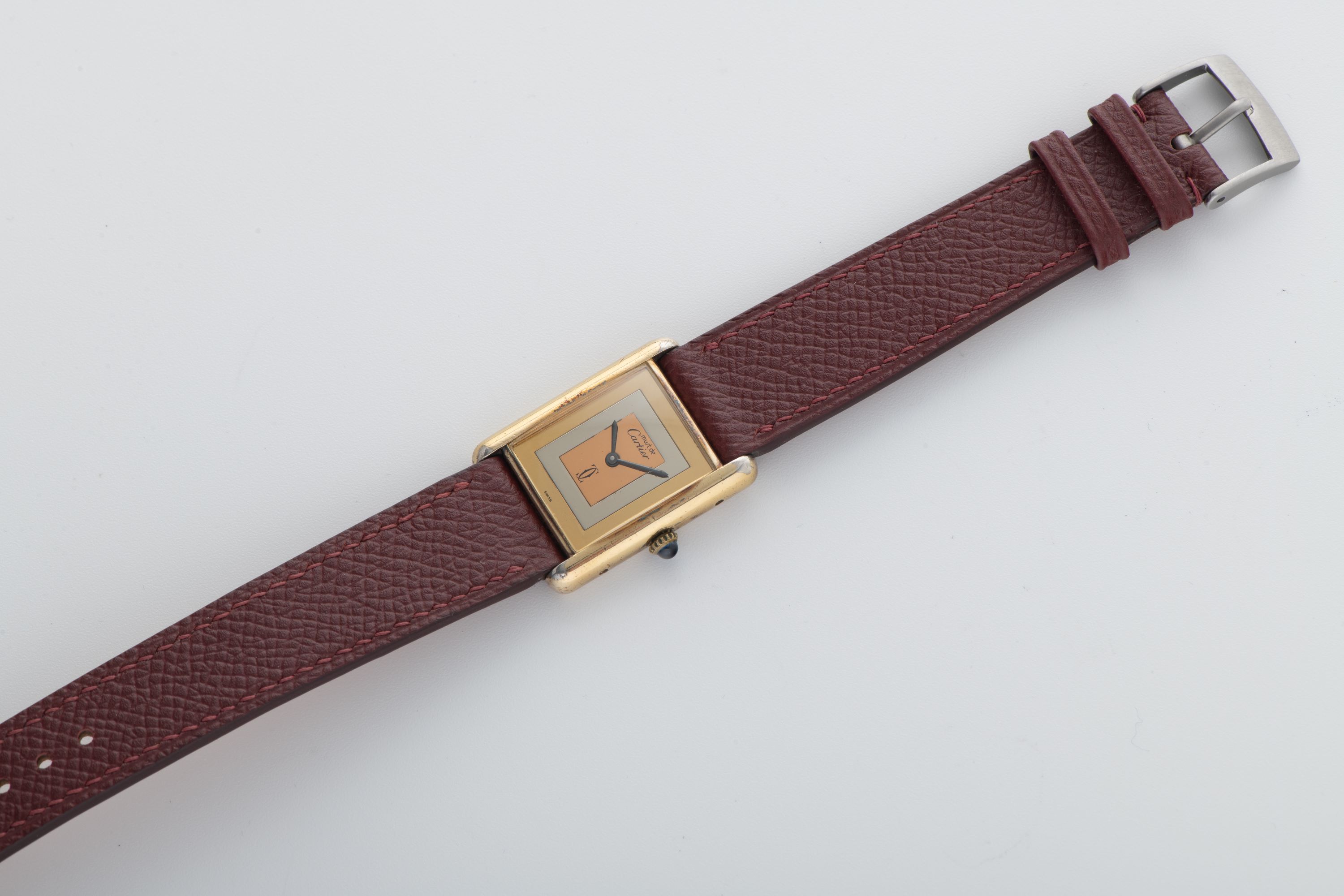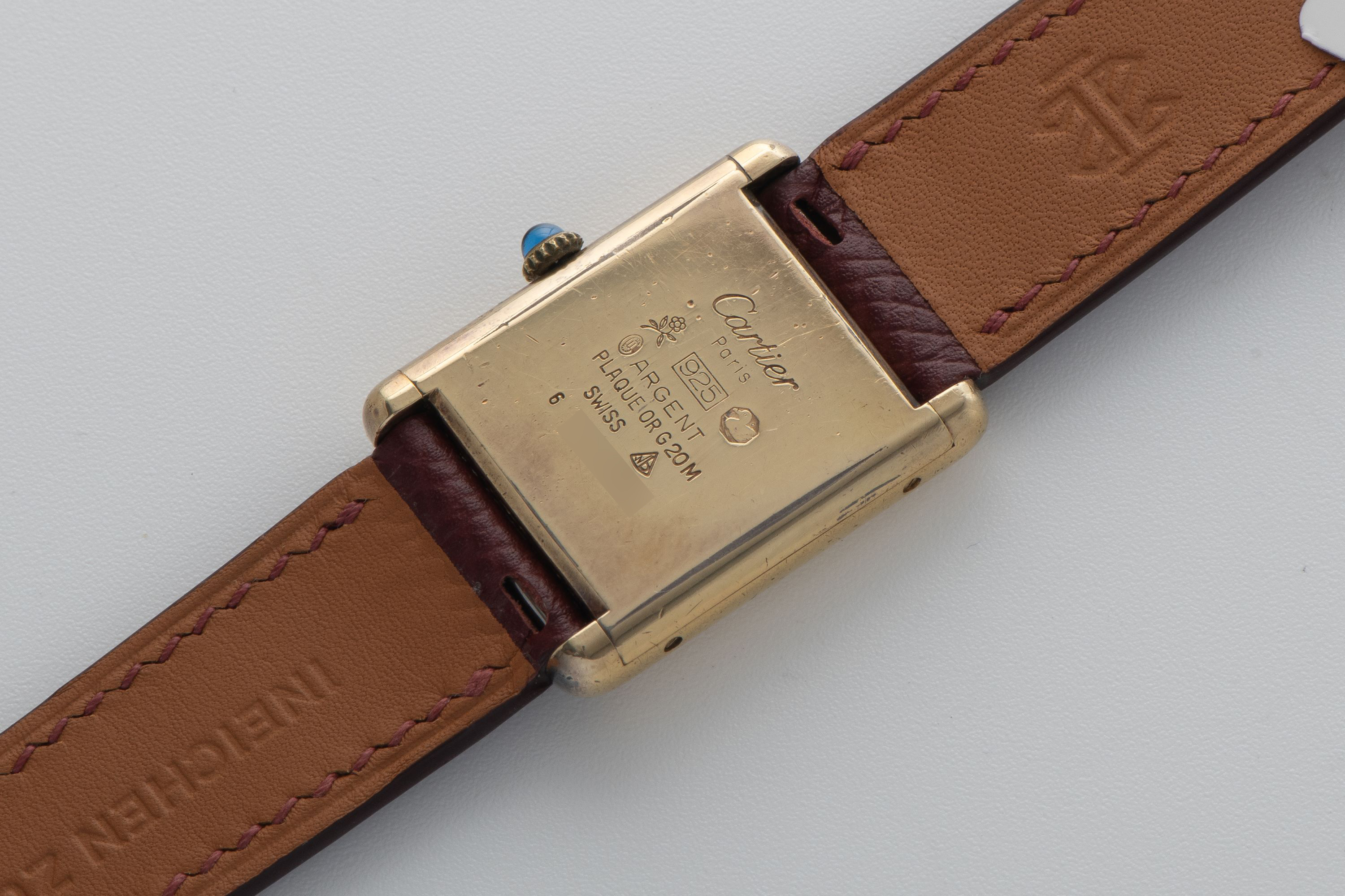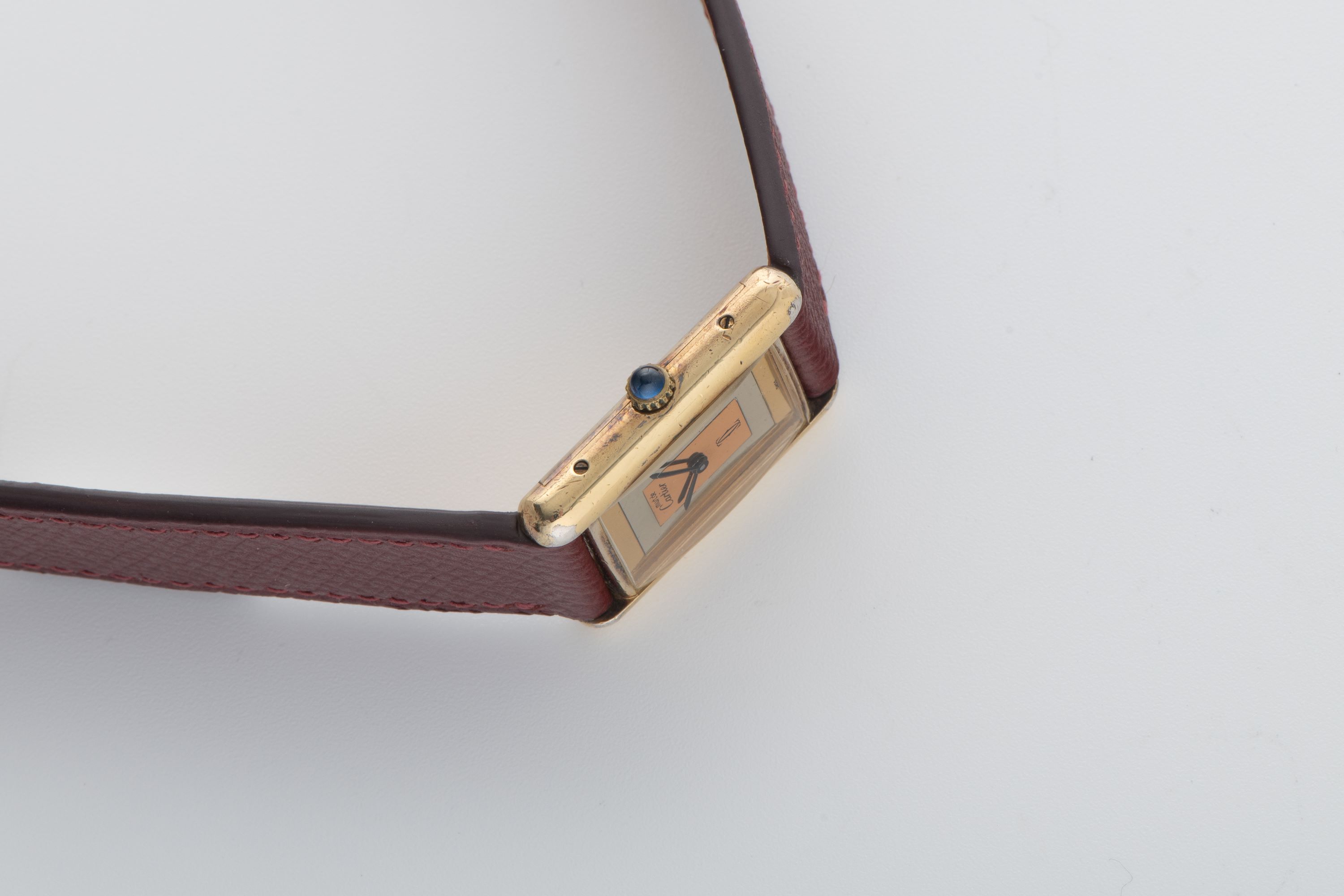 CaseRectangular case in gold-plated silver 925, polished, fixed bezel in gold-plated silver 925, polished, snap-on caseback in gold-plated silver 925, with engraved ‘Cartier Paris 925 Argent Place Or G 20 M Swiss’ inscription, and stamped case number, crown at 3 o’clock with blue stone cabochon
