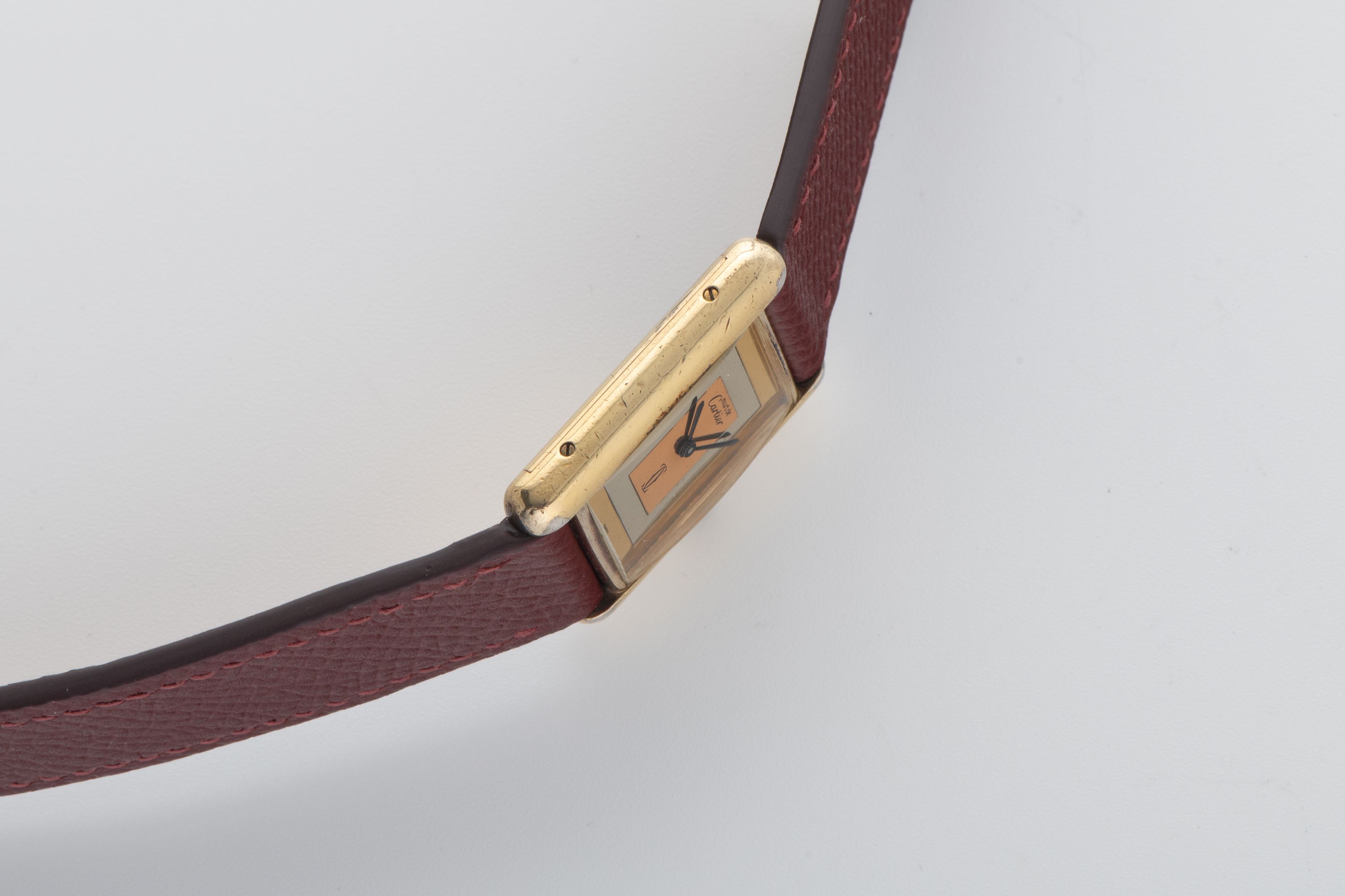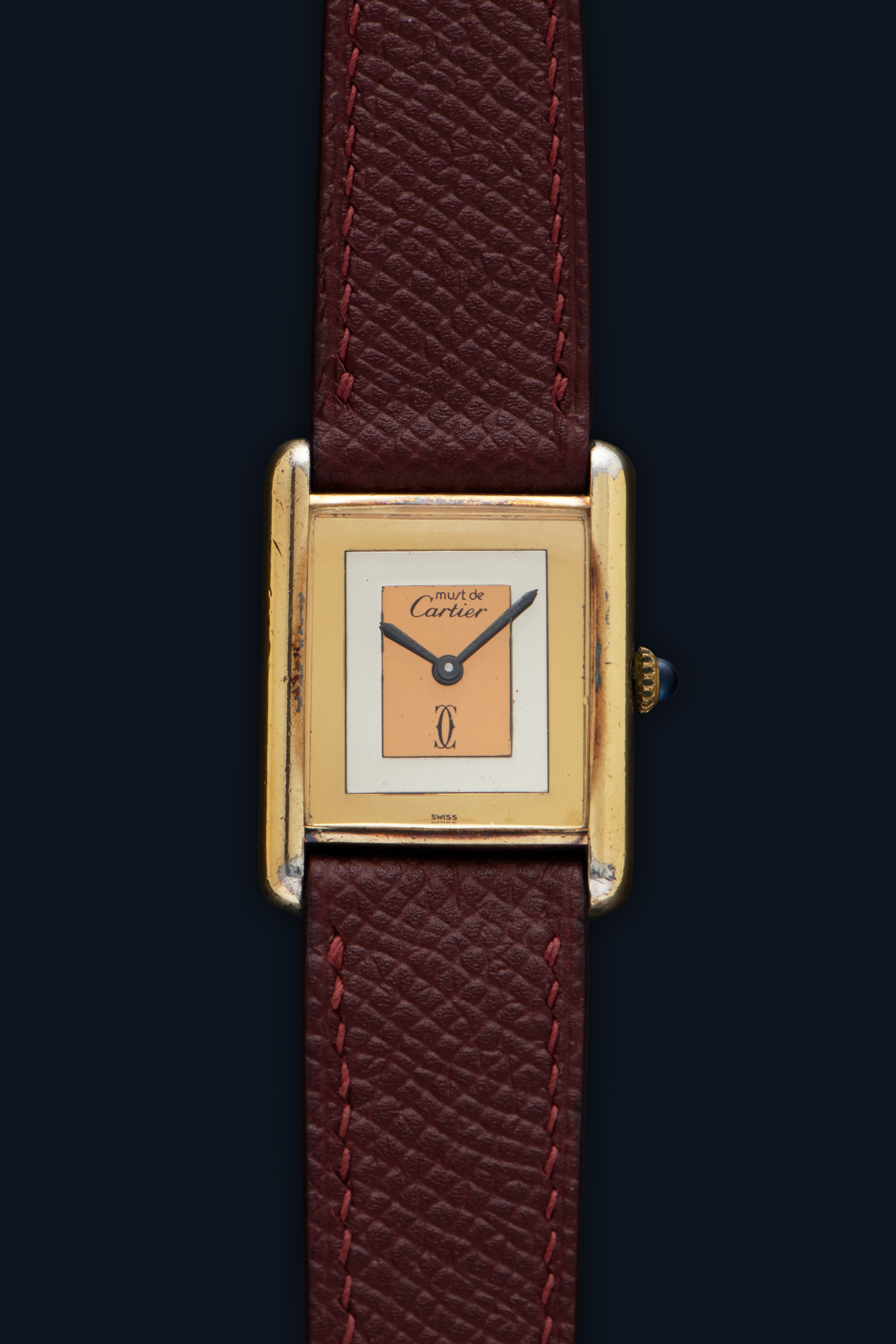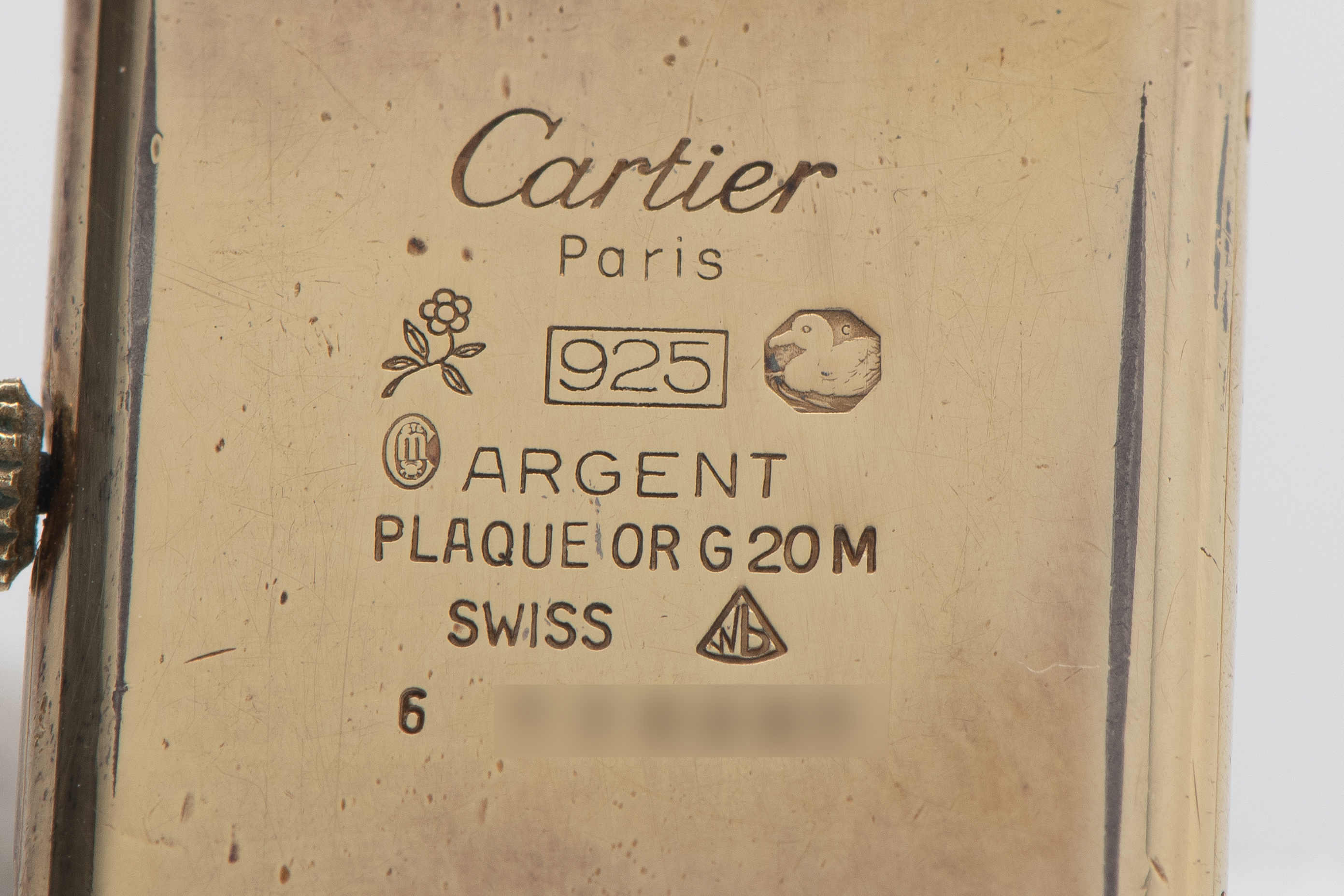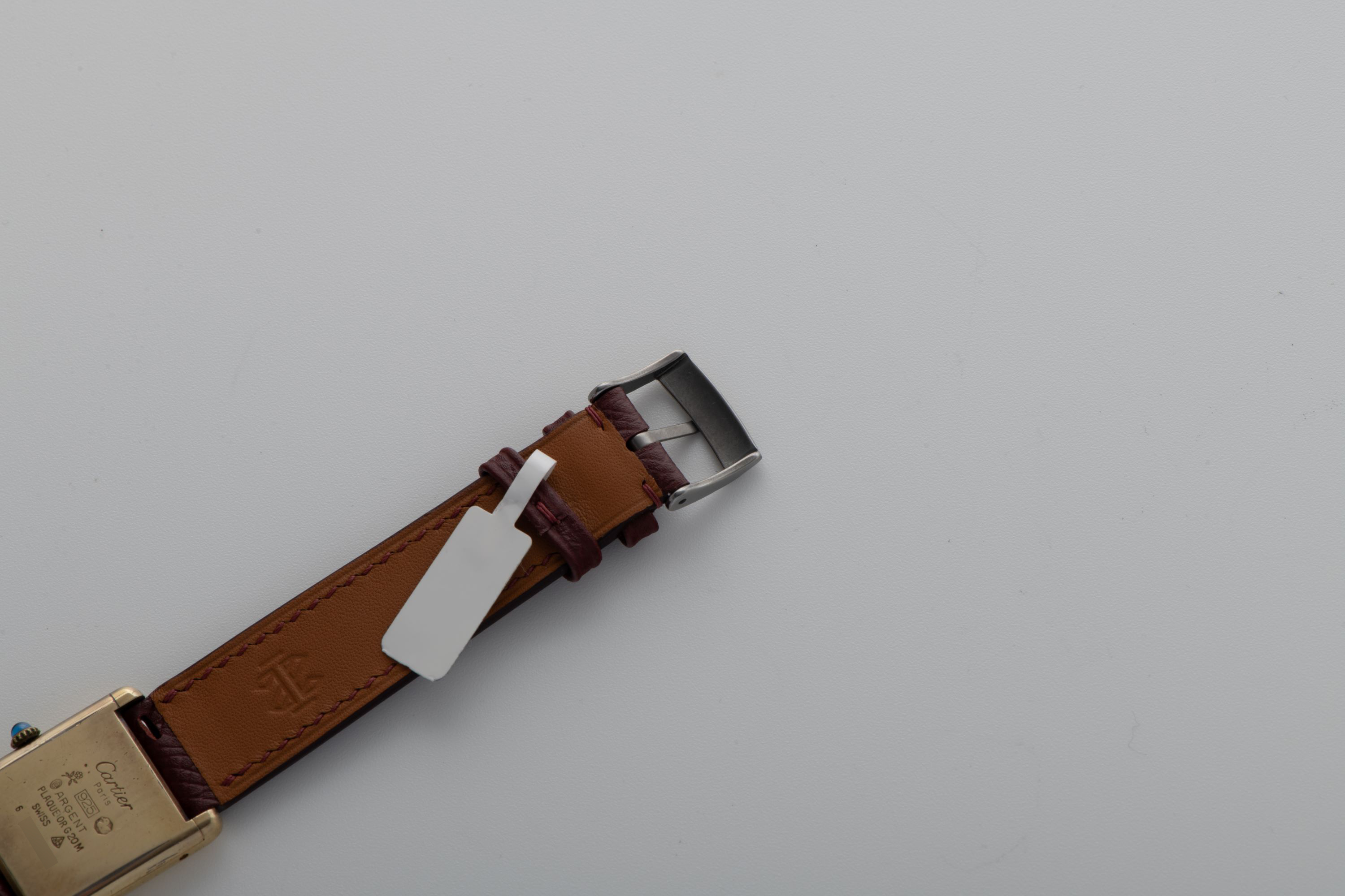 CaseRectangular case in gold-plated silver 925, polished, fixed bezel in gold-plated silver 925, polished, snap-on caseback in gold-plated silver 925, with engraved ‘Cartier Paris 925 Argent Place Or G 20 M Swiss’ inscription, and stamped case number, crown at 3 o’clock with blue stone cabochon