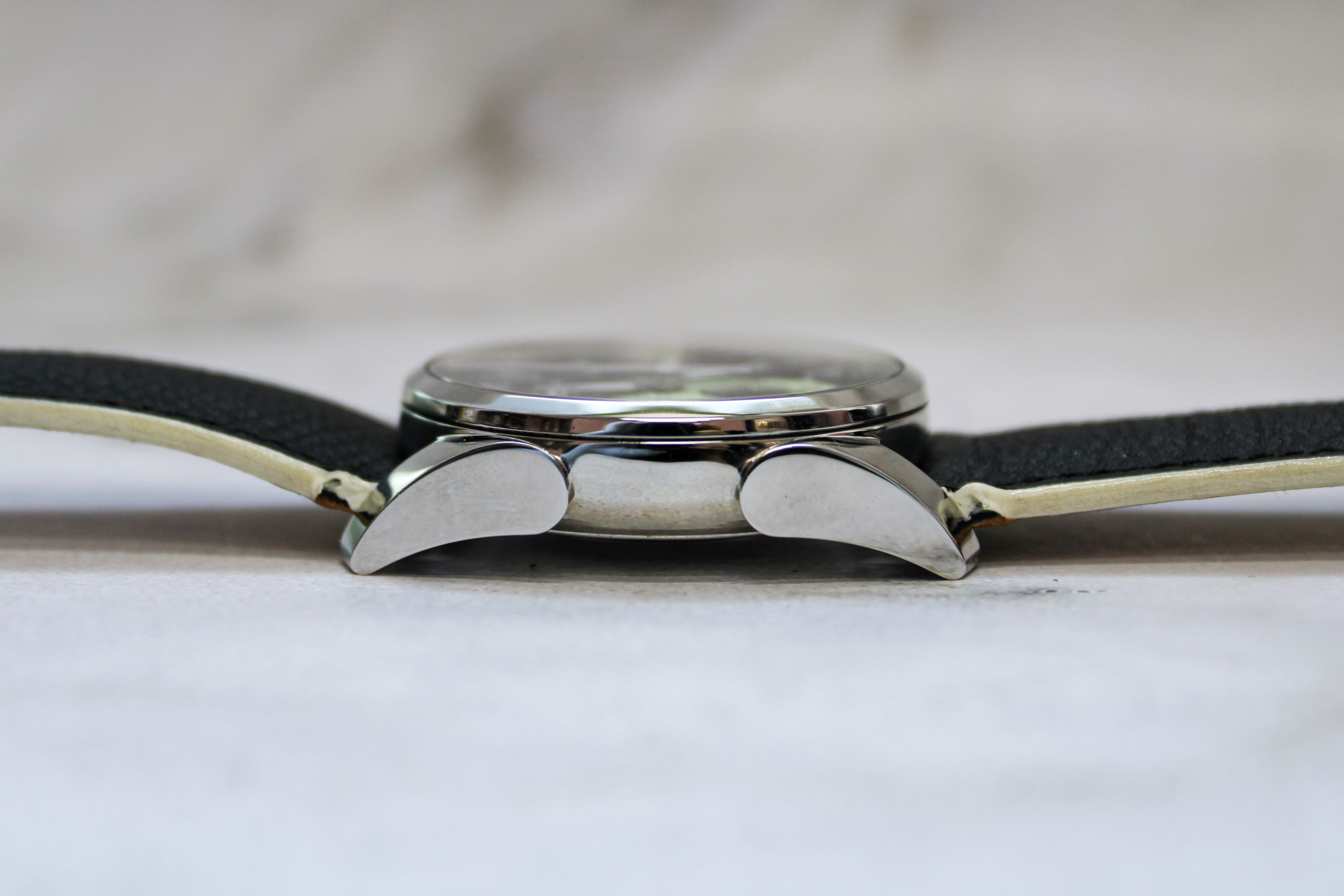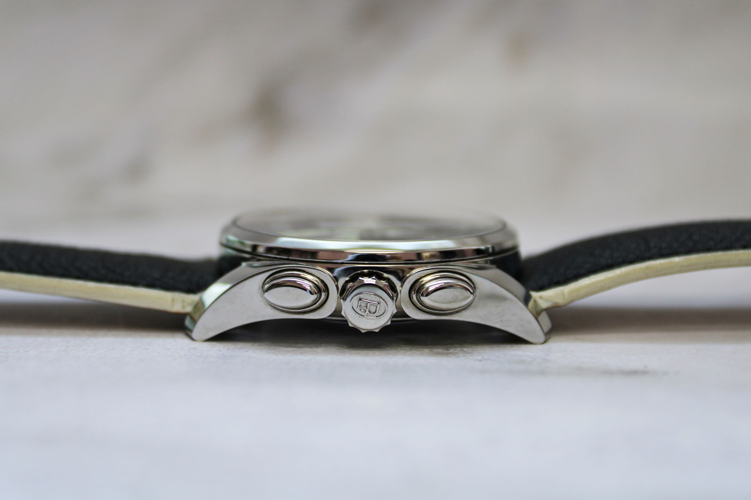 CaseRound case in stainless steel, exhibition caseback, winding crown at 3 o’clock, chronograph pushers at 2 and 4 o’clock