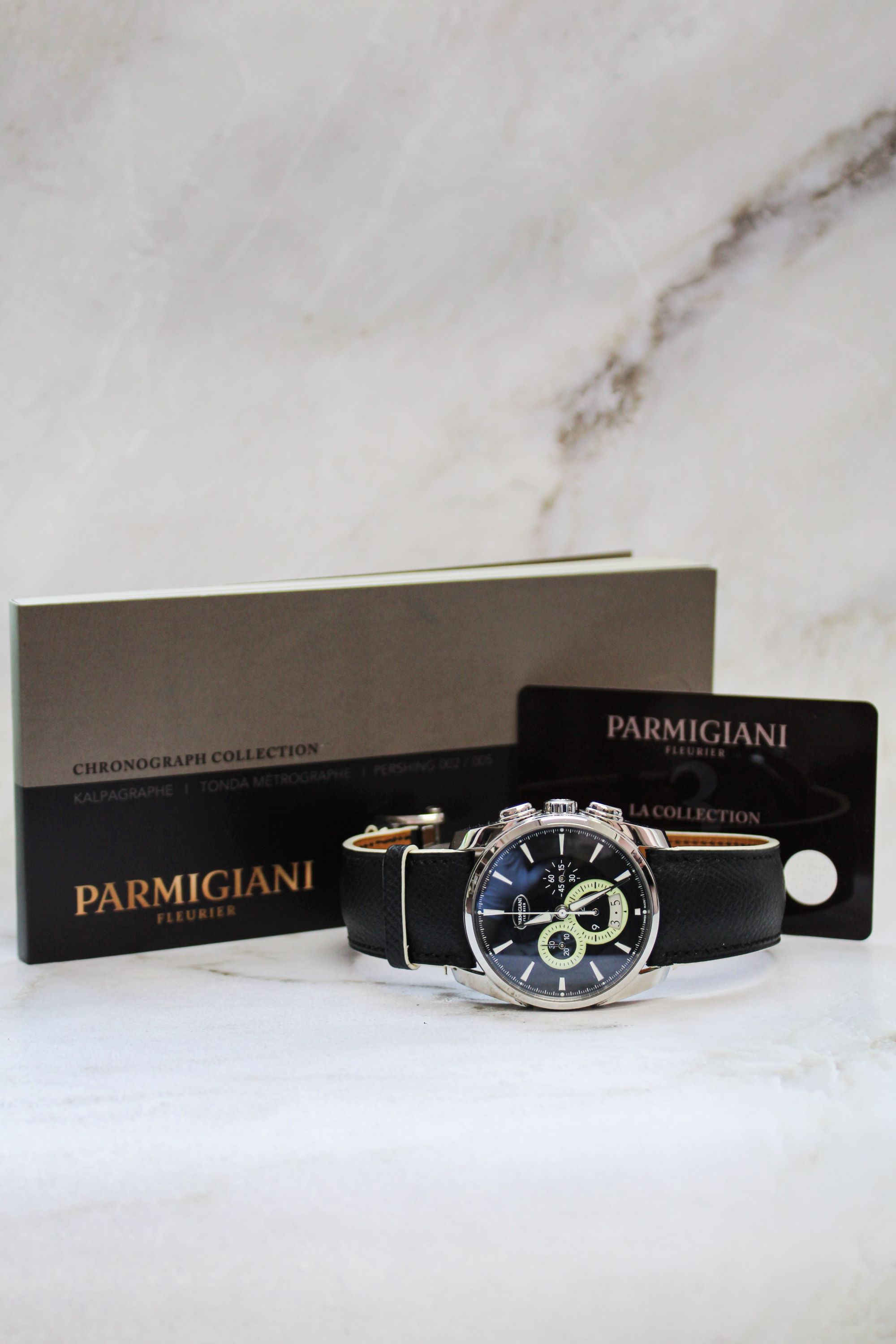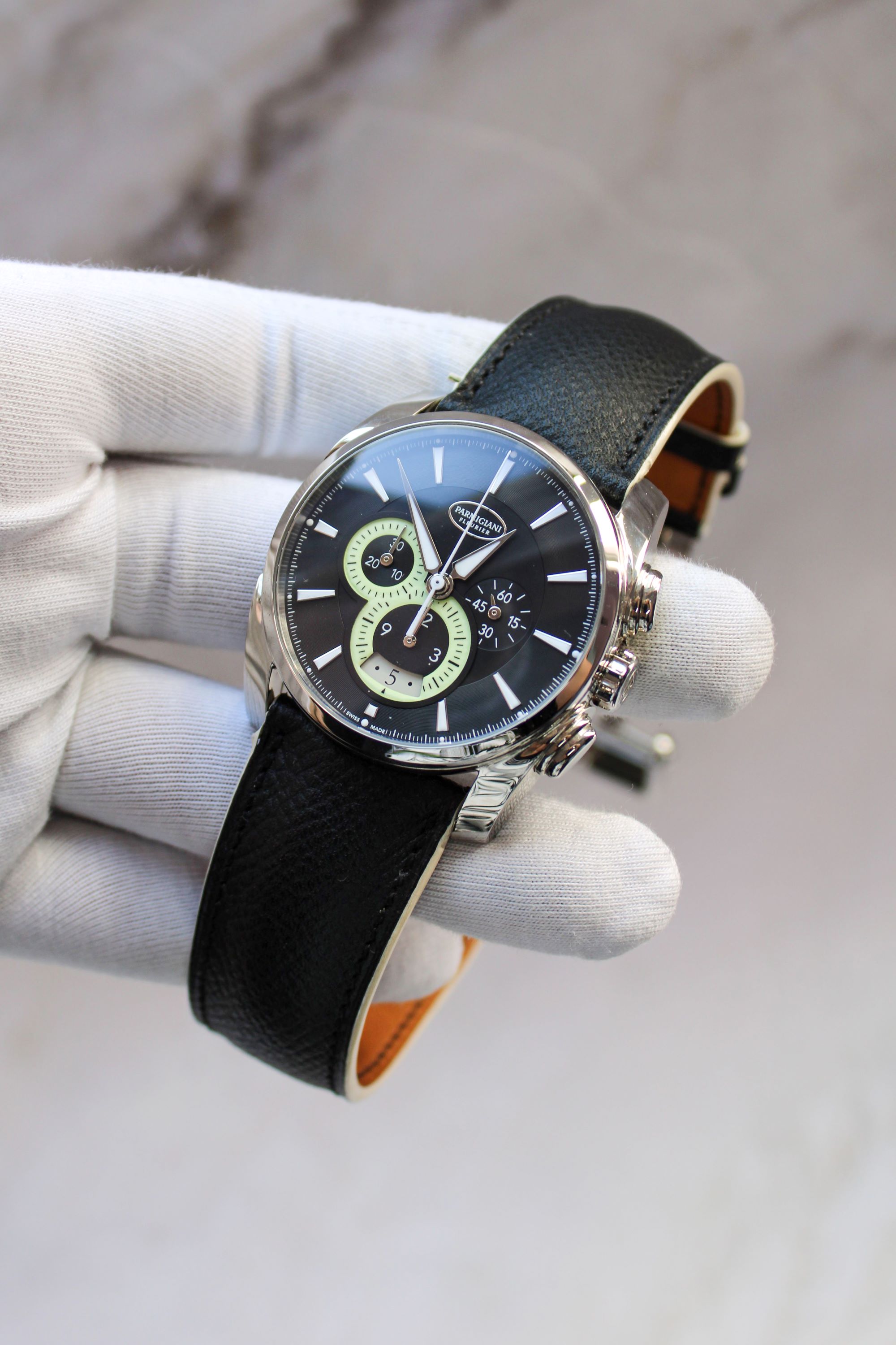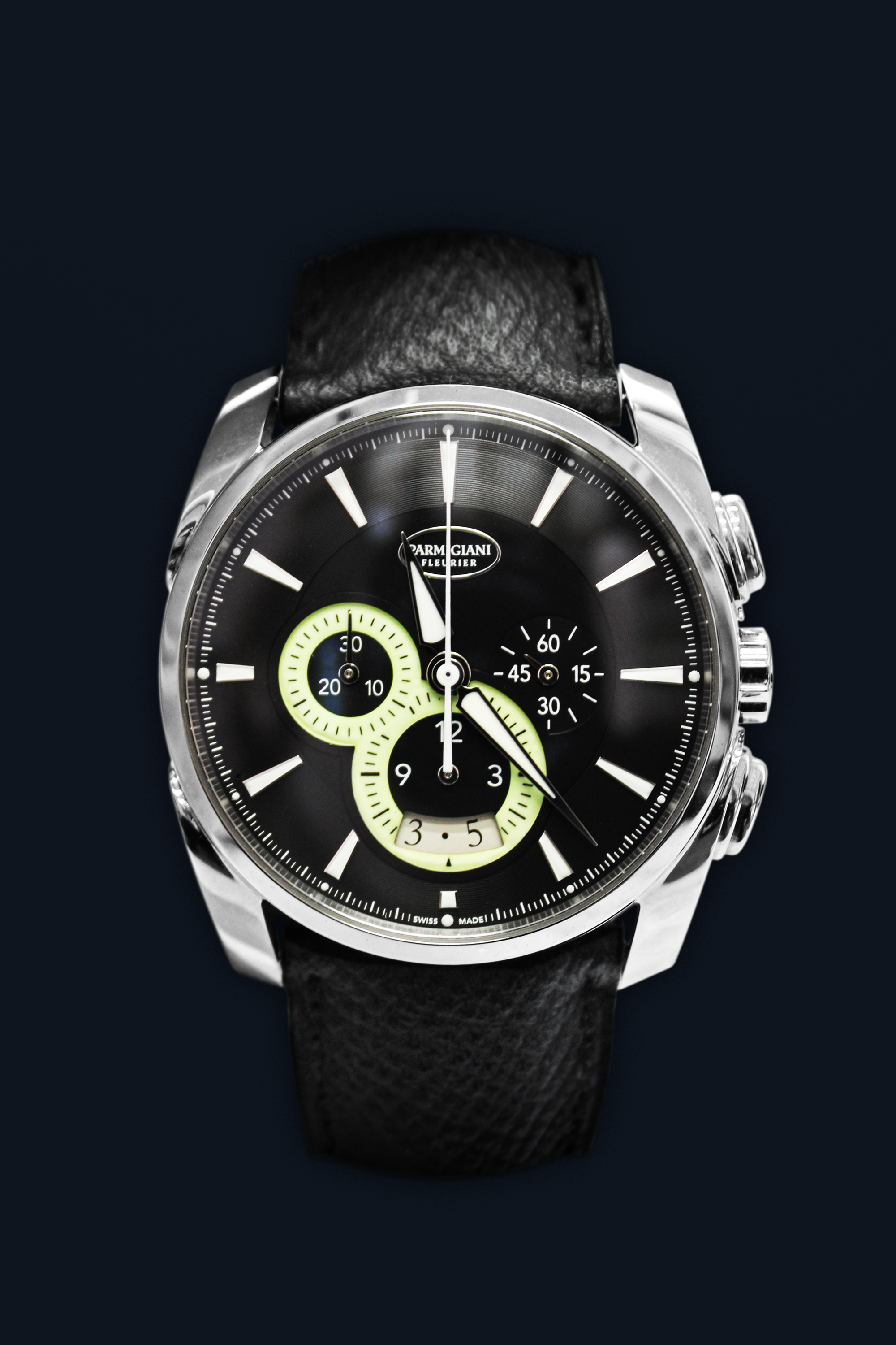 DialBlack dial, signed “Parmigiani Fleurier”, applied luminous indexes, luminous “alpha” hour and minute hands, small seconds at 3 o’clock, date at 6 o’clock, light green counters: 30-minute at 9 o’clock 12-hour and 6 o’clock