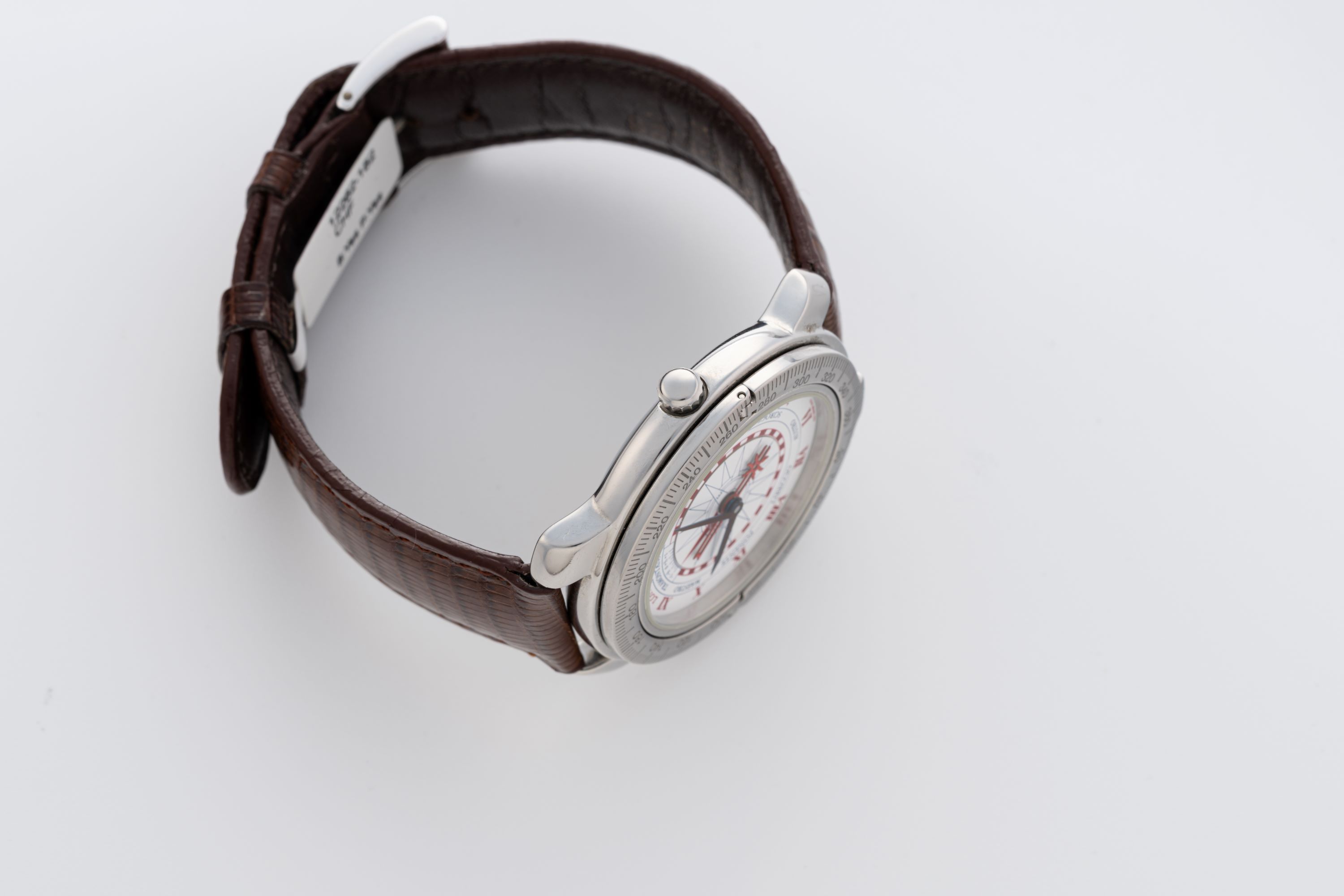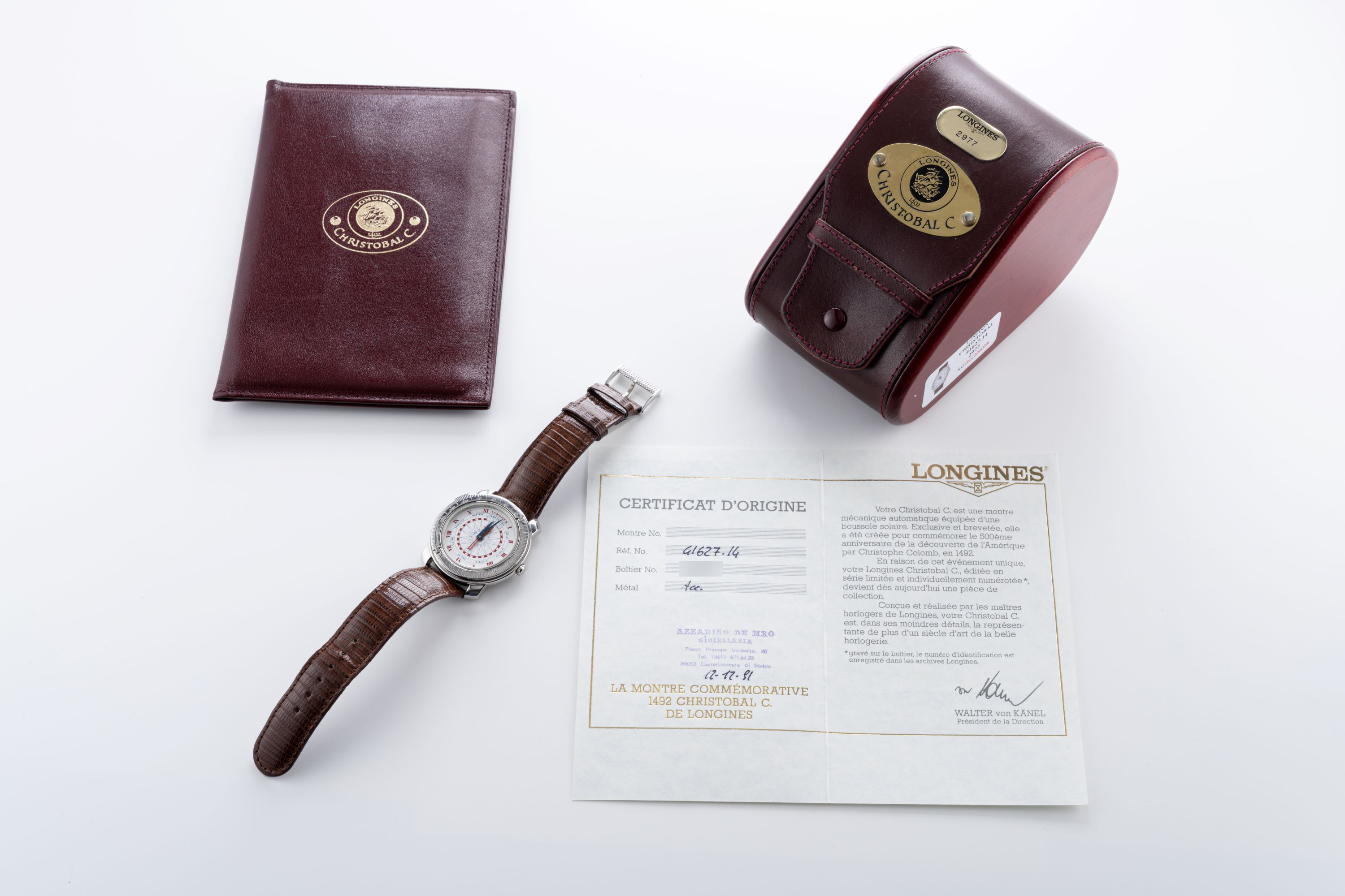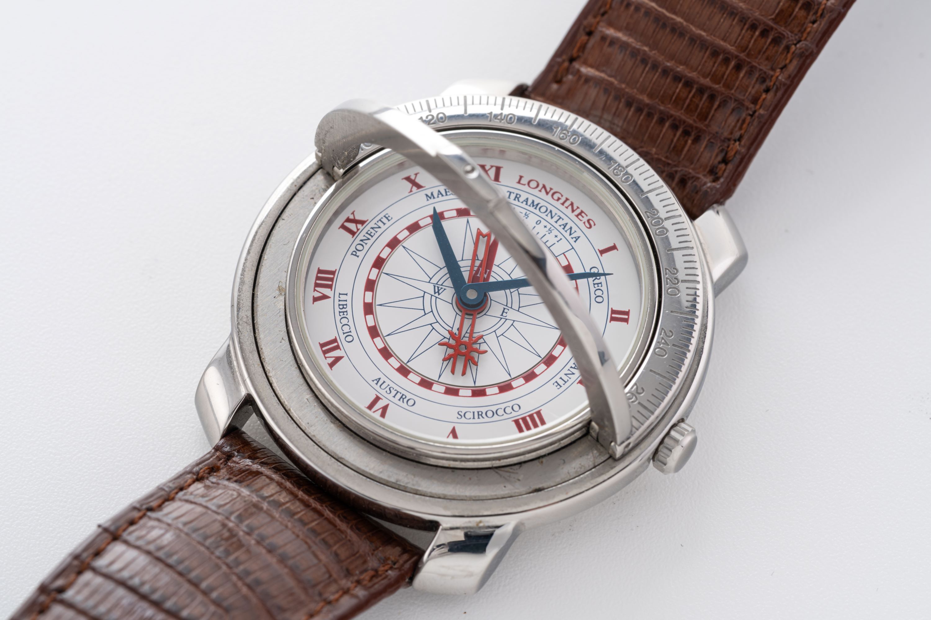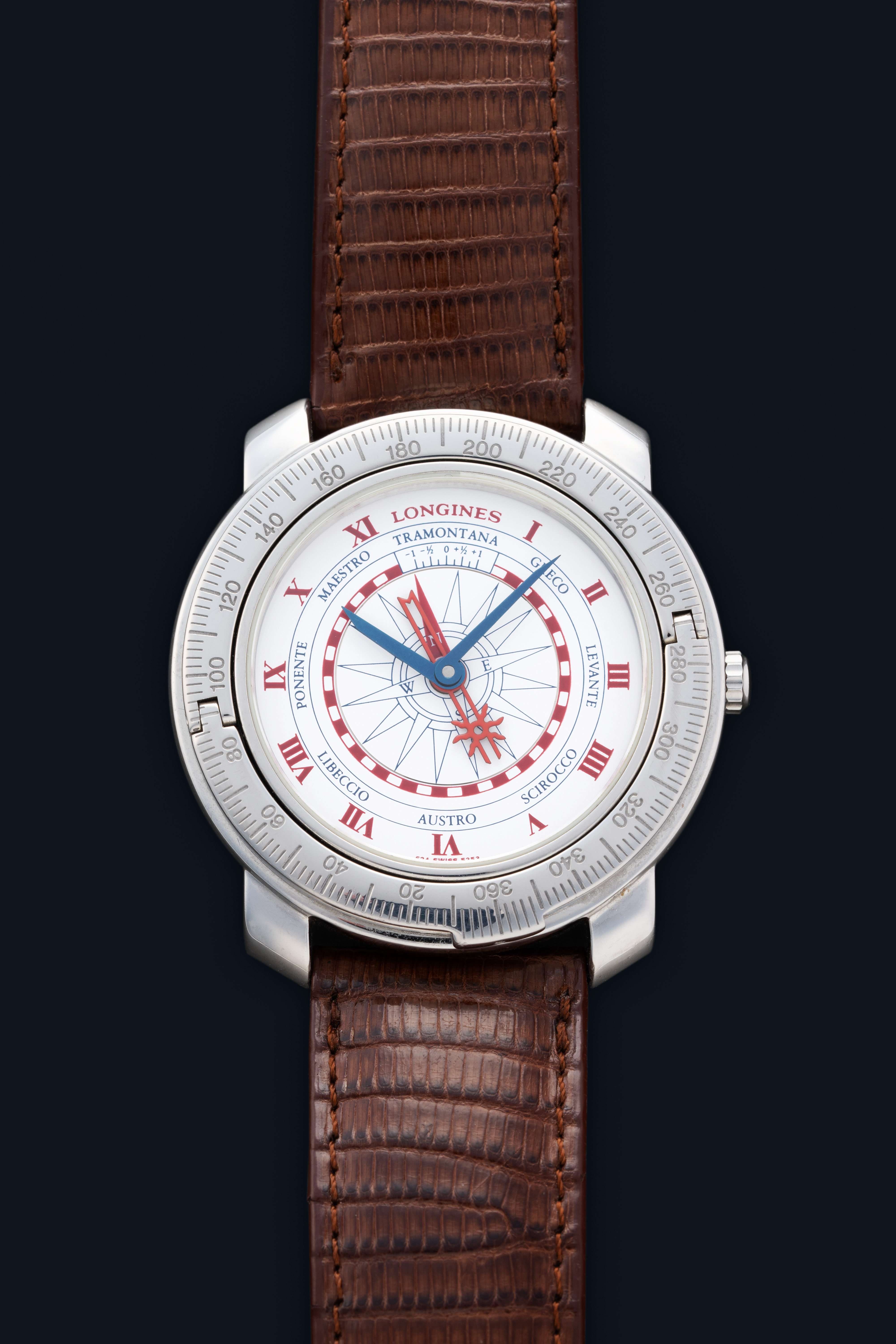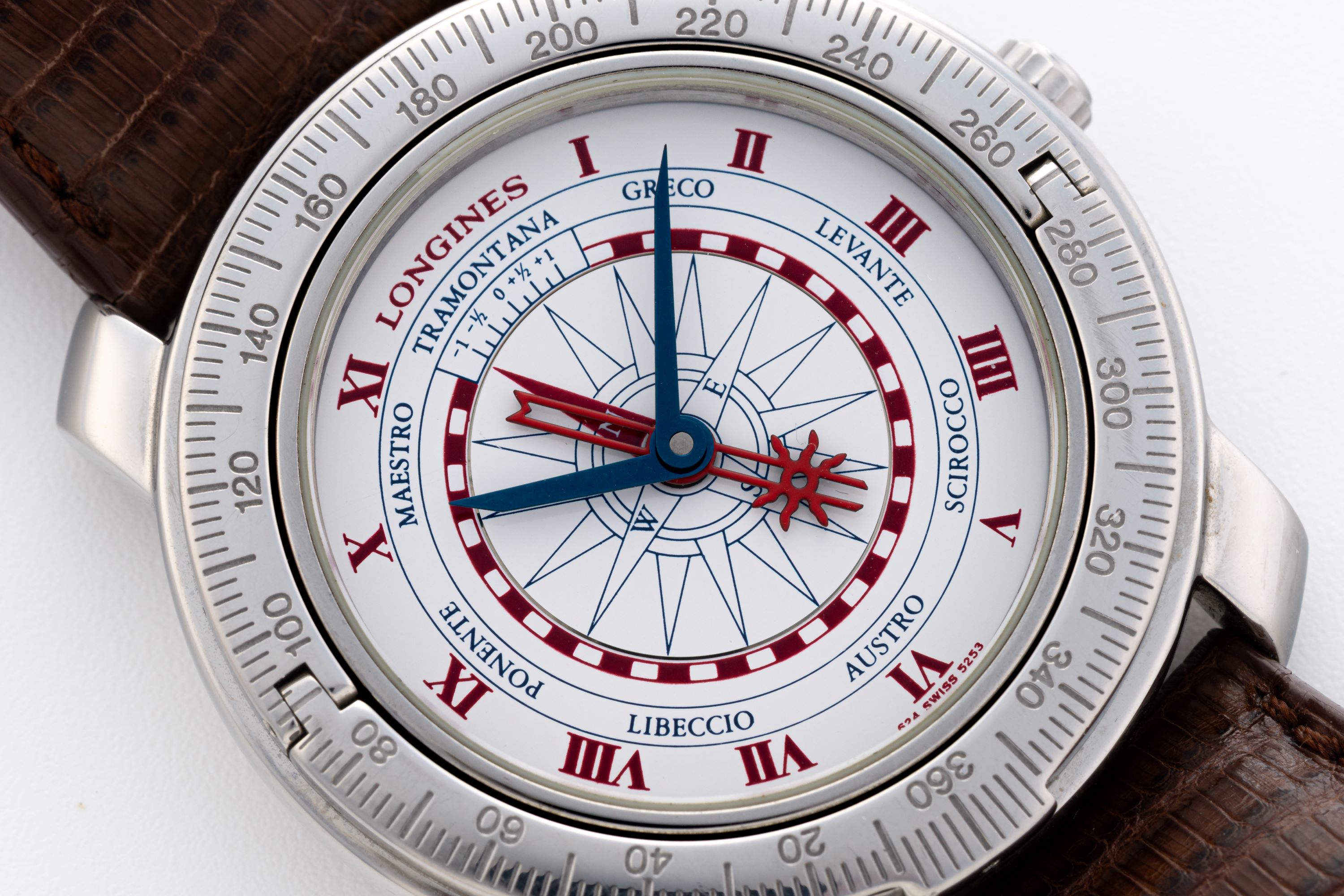 DialWhite dial with blue and red accents, orientation scales, heat-blued hour and minute hands, signed 'Longines' at 12 o'clock