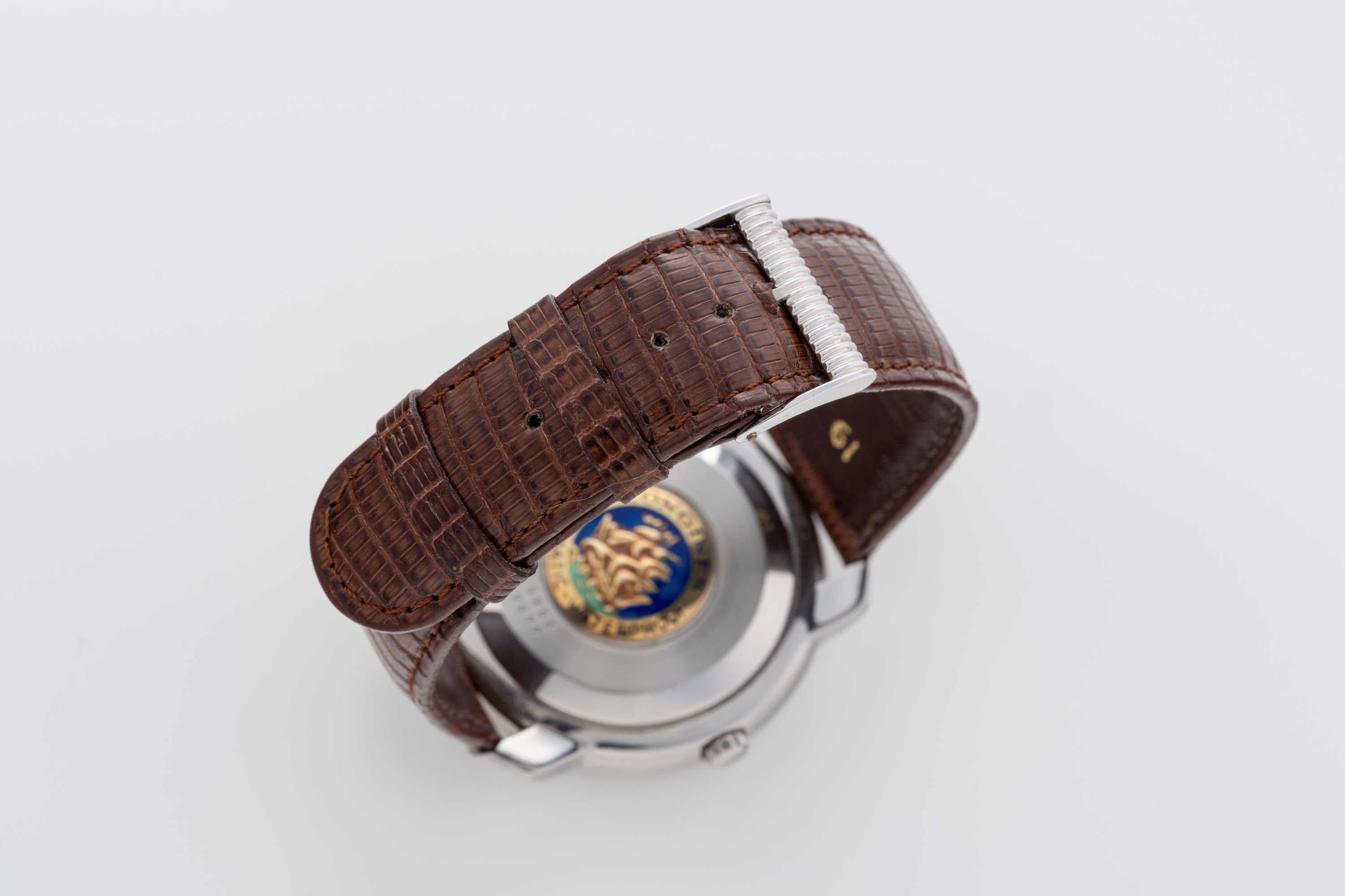 CaseRound case in stainless steel with crown at 3 o'clock, fold-up compass bezel, solid caseback with enamel inlays