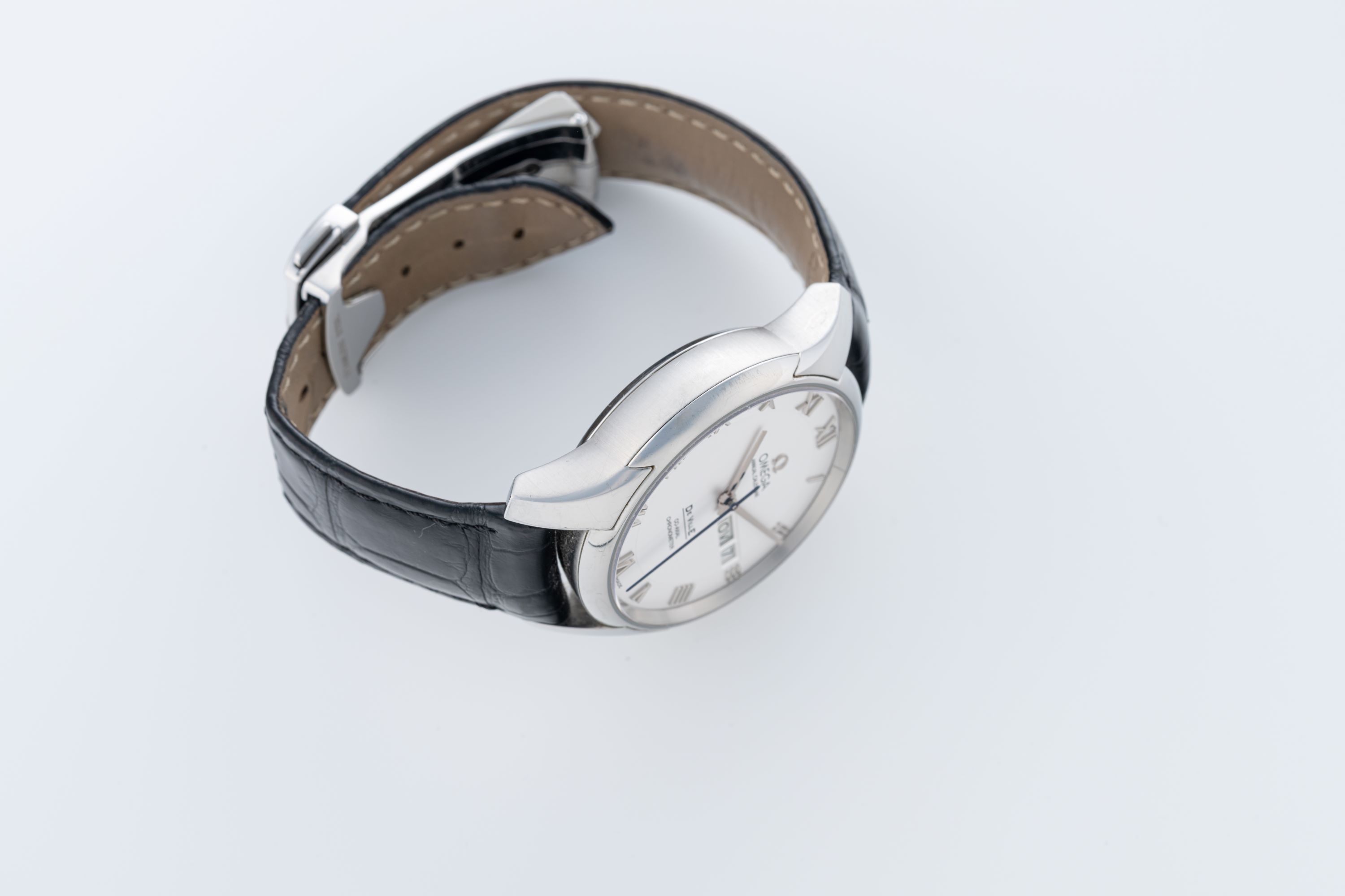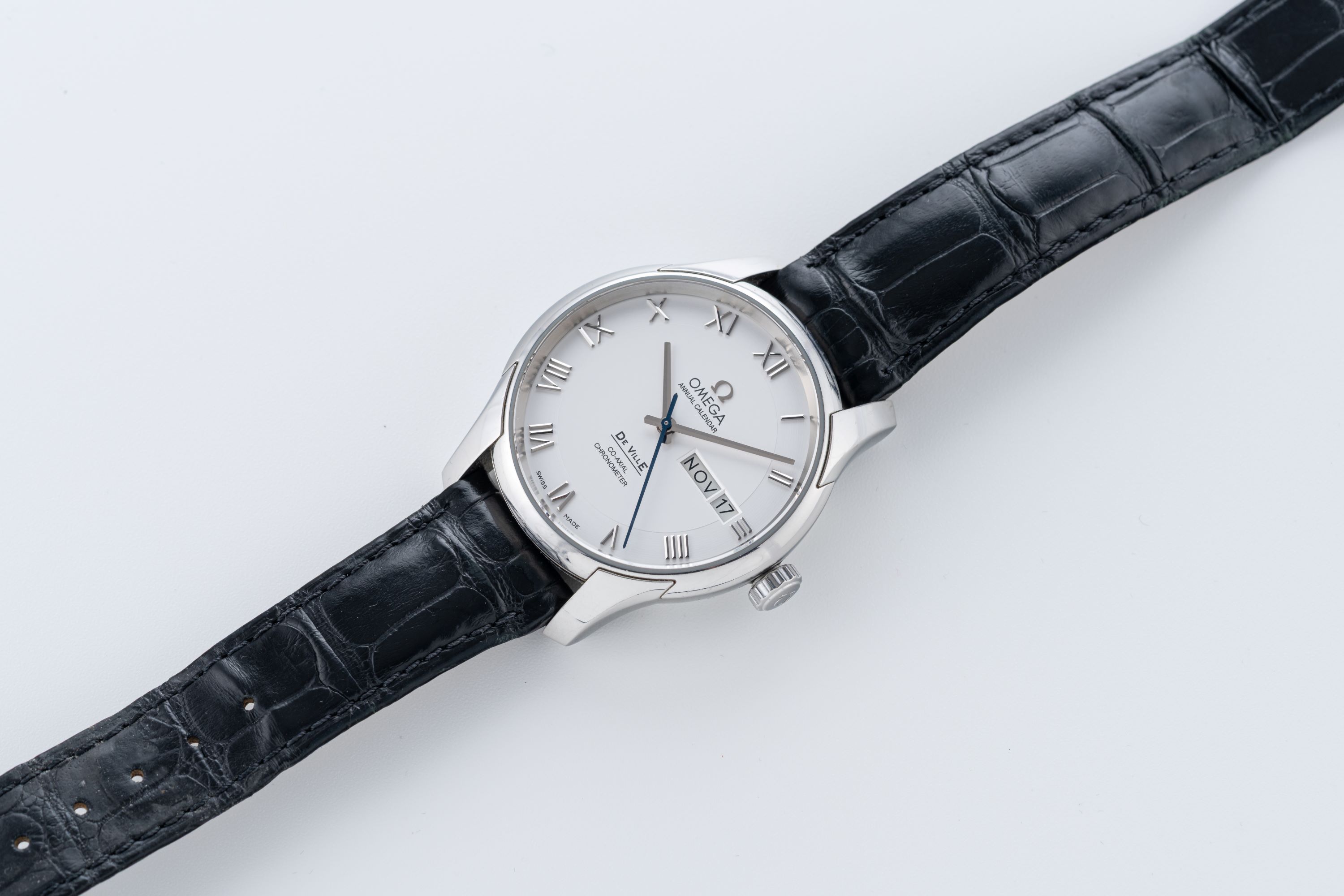 DialSilver-white dial with applied roman numerals, day and date window at 3 o'clock, signed 'Omega' at 12 o'clock