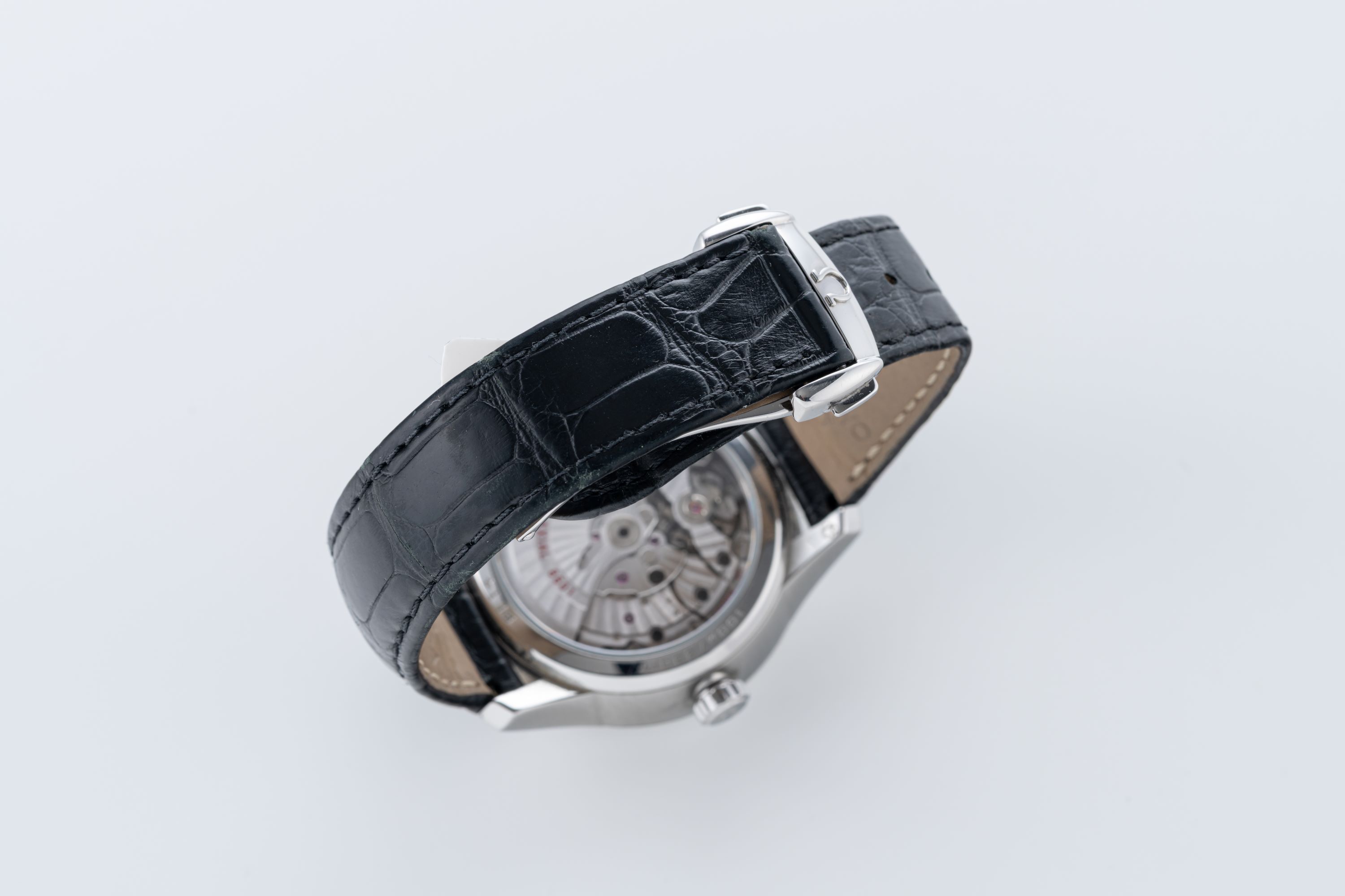 StrapBlack alligator leather strap with Omega deployant clasp in stainless steel