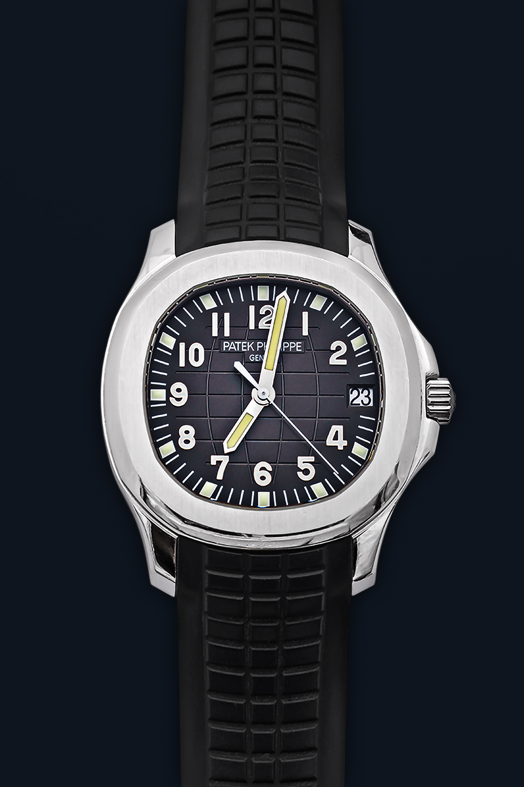 DialBlack dial, with medians and parallels motif in relief, signed ‘Patek Philippe Geneve’, ‘obelisk’ hour and minute hands, luminous, white ‘stick’ central seconds hand, embossed Arabic numerals, outer minute track with luminous hour indexes, date aperture at 3 o’clock