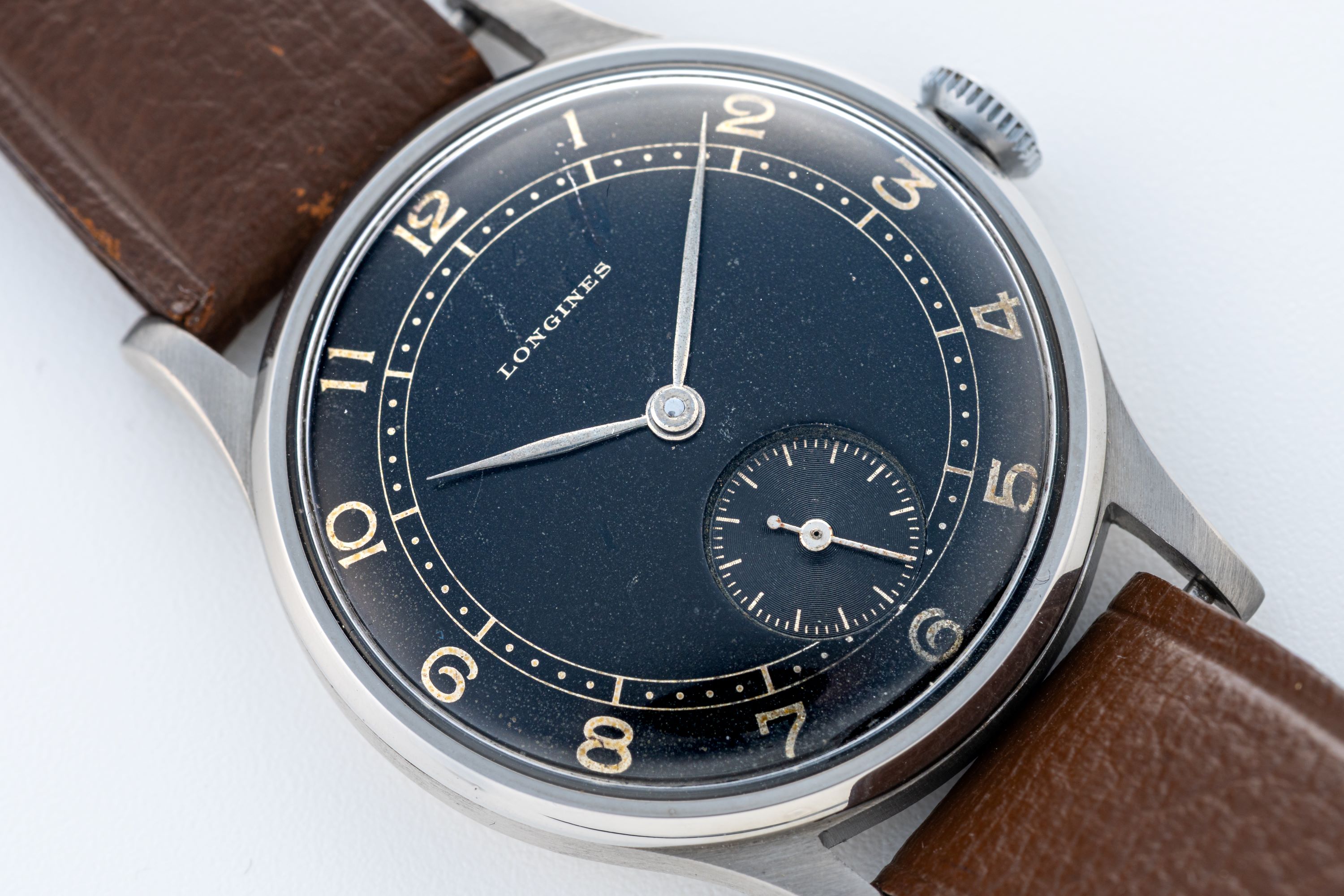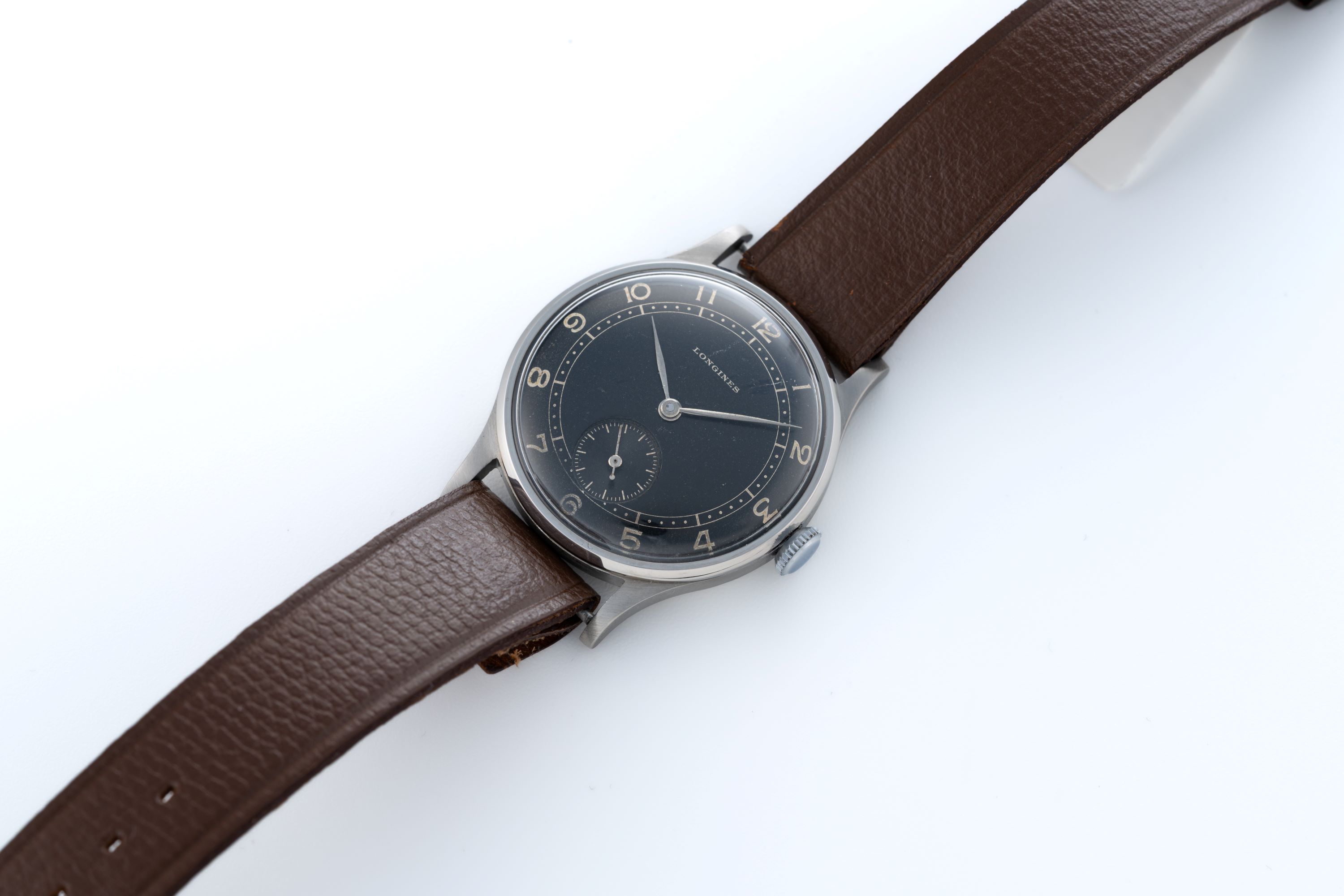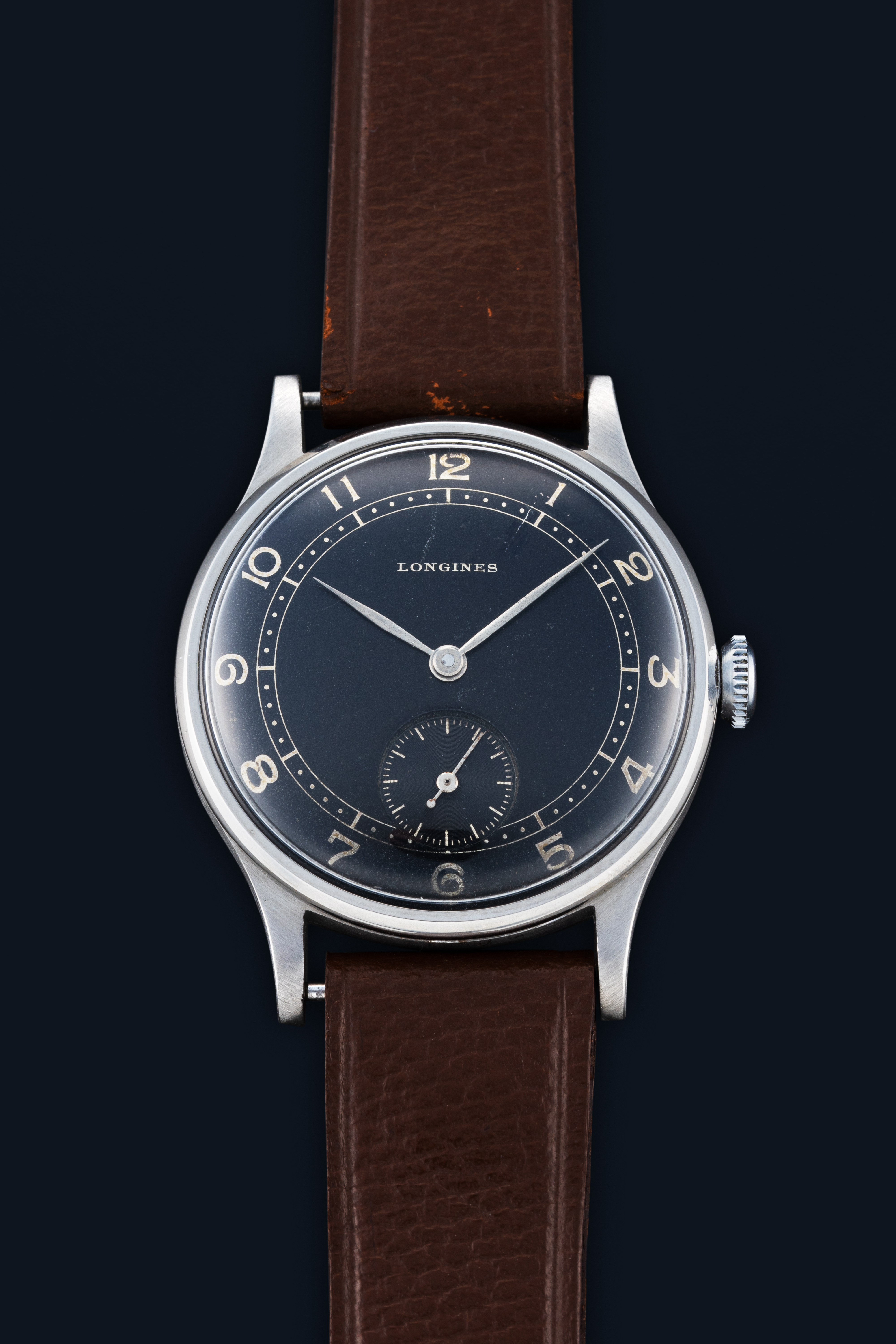 DialBlack dial with gilt numerals, steel leaf hands, small seconds at 6 o'clock, signed 'Longines' at 12 o'clock