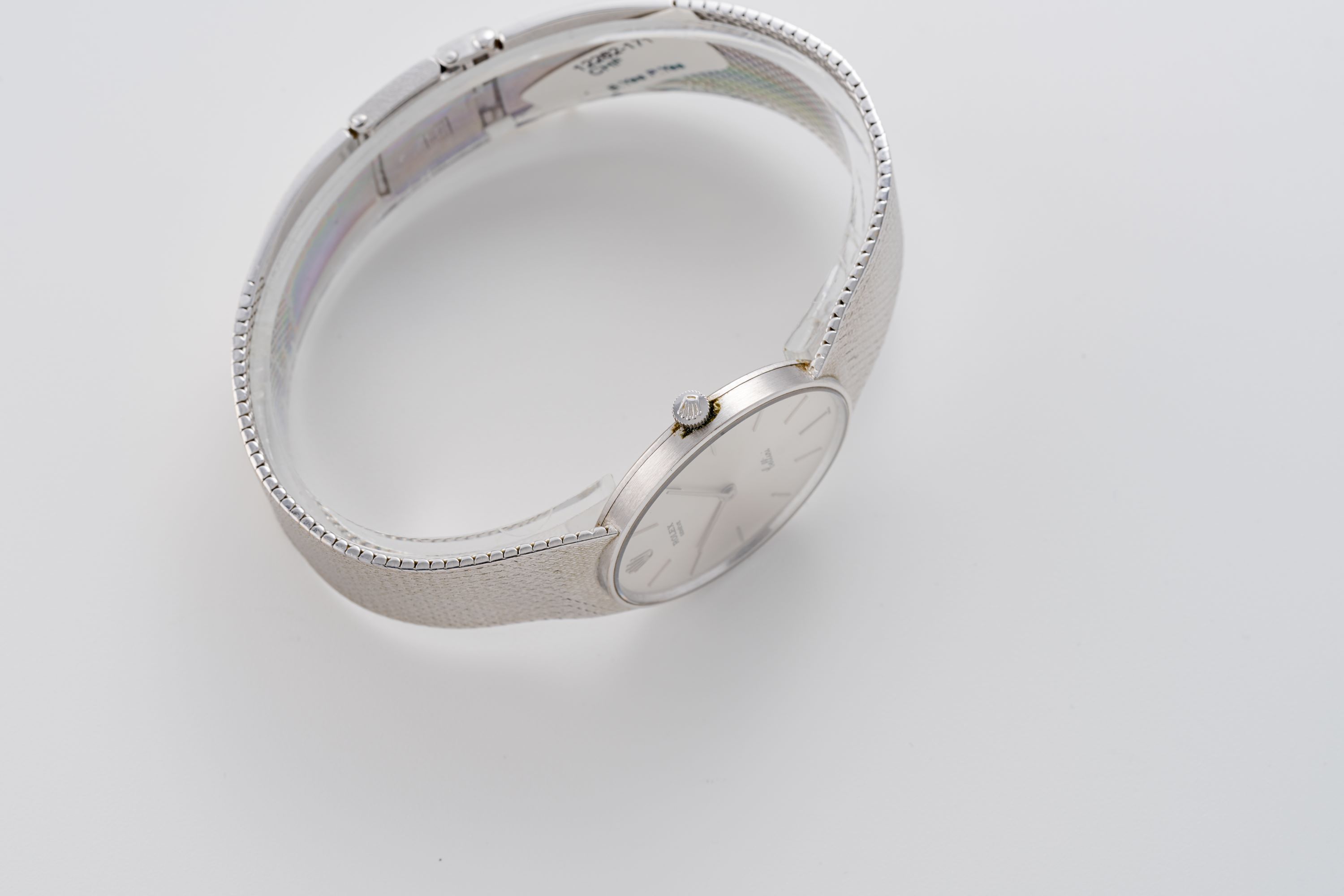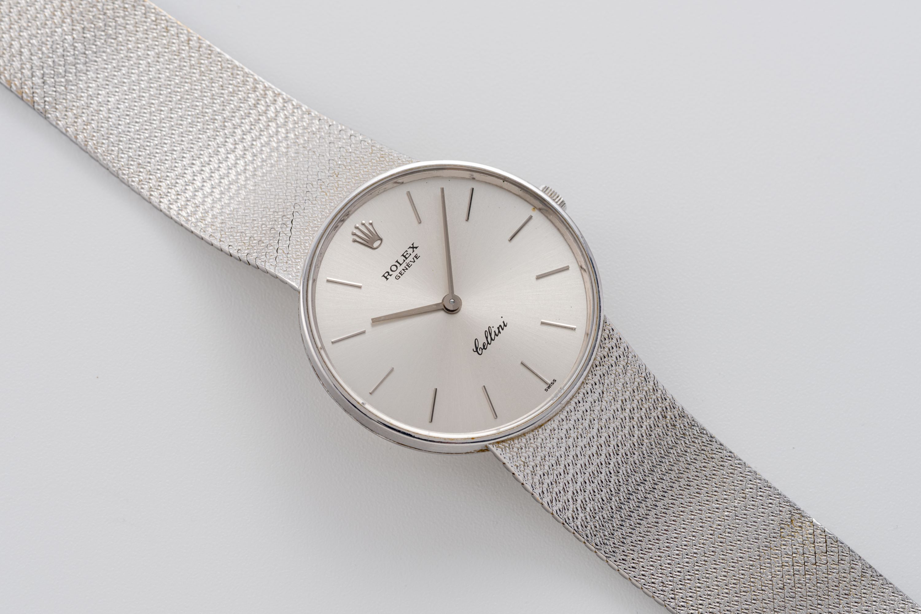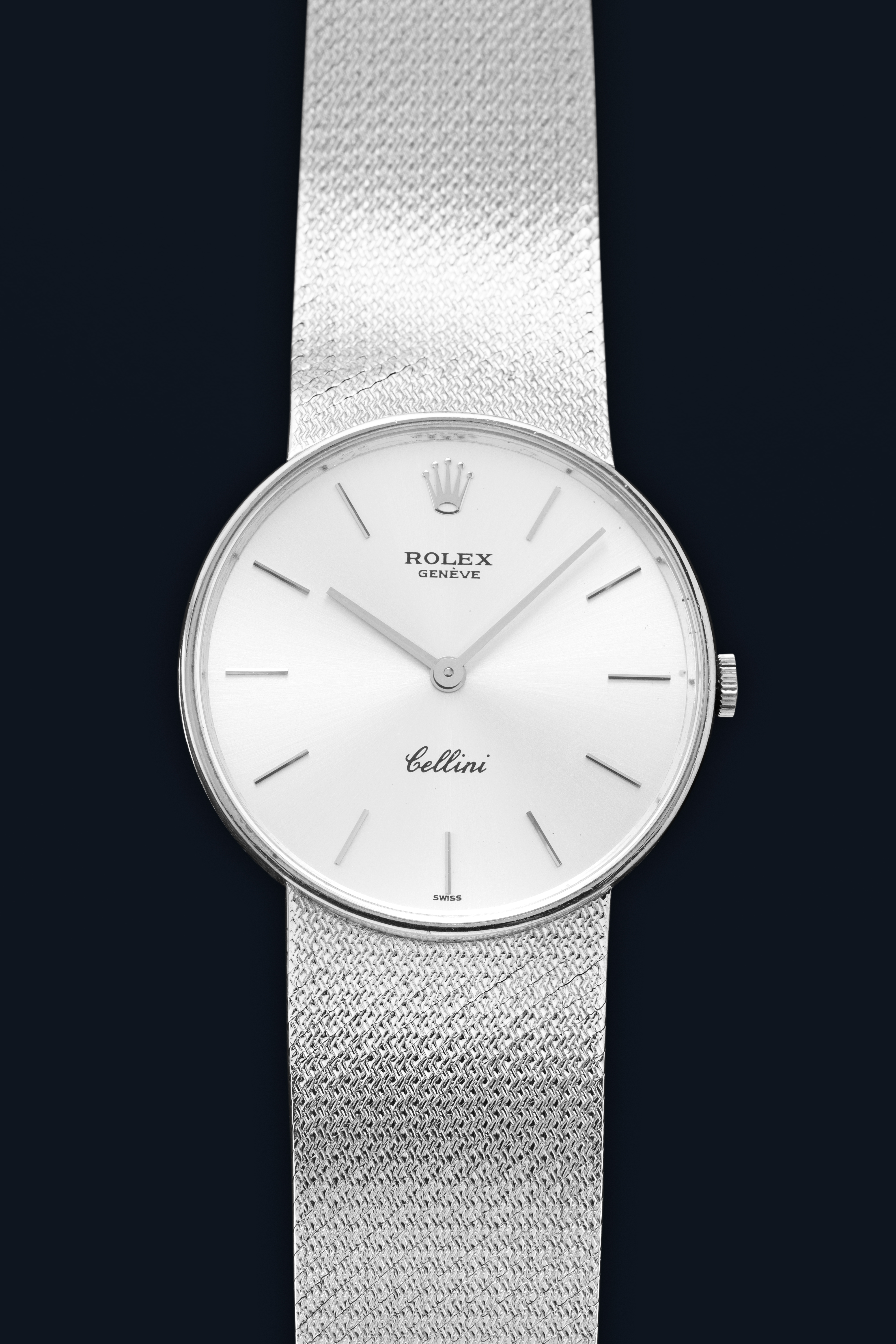 DialSilver sunburst dial with applied white gold indices, white gold hands, signed 'Rolex' at 12 o'clock