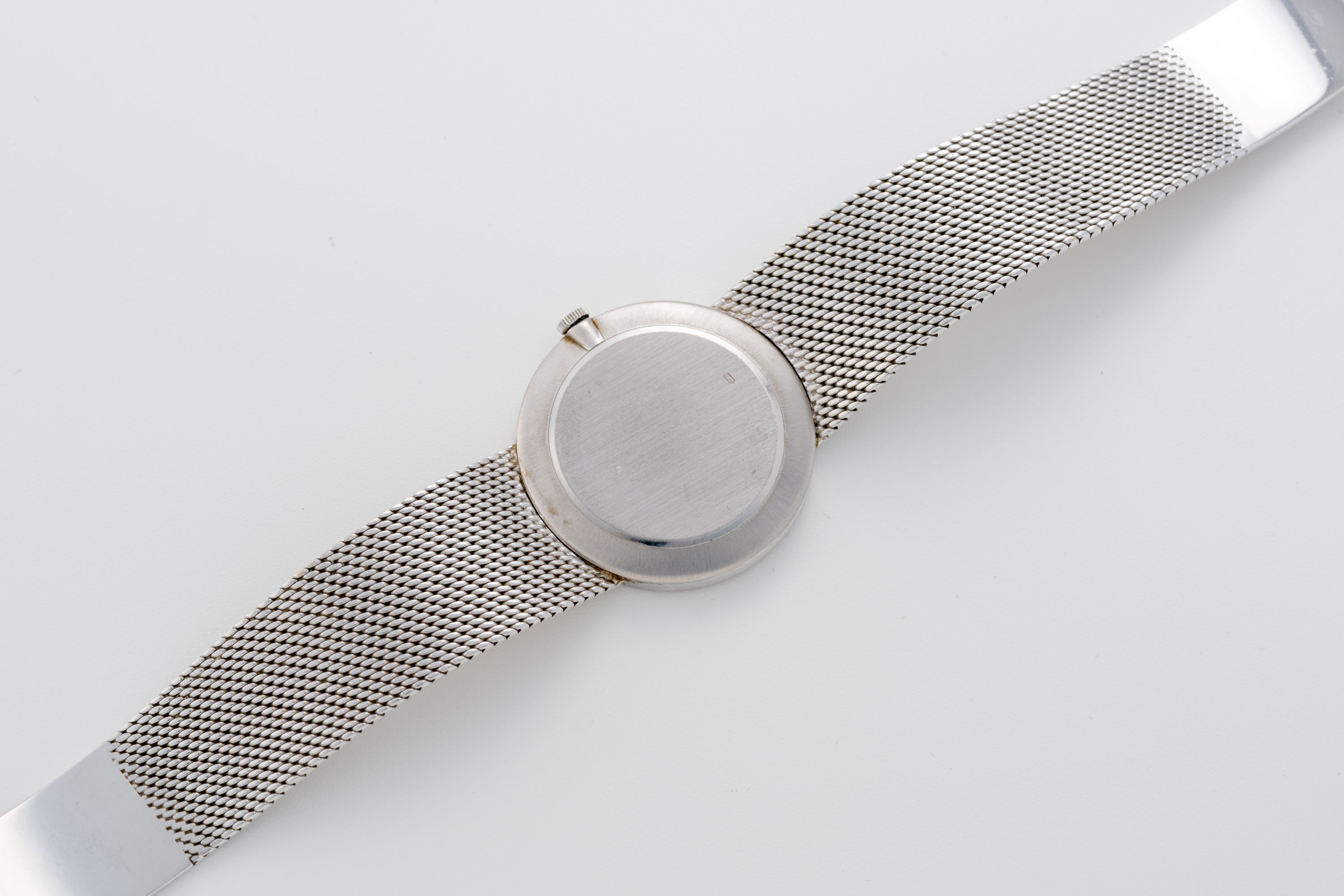 CaseRound case in 18k white gold with crown at 3 o'clock, solid caseback