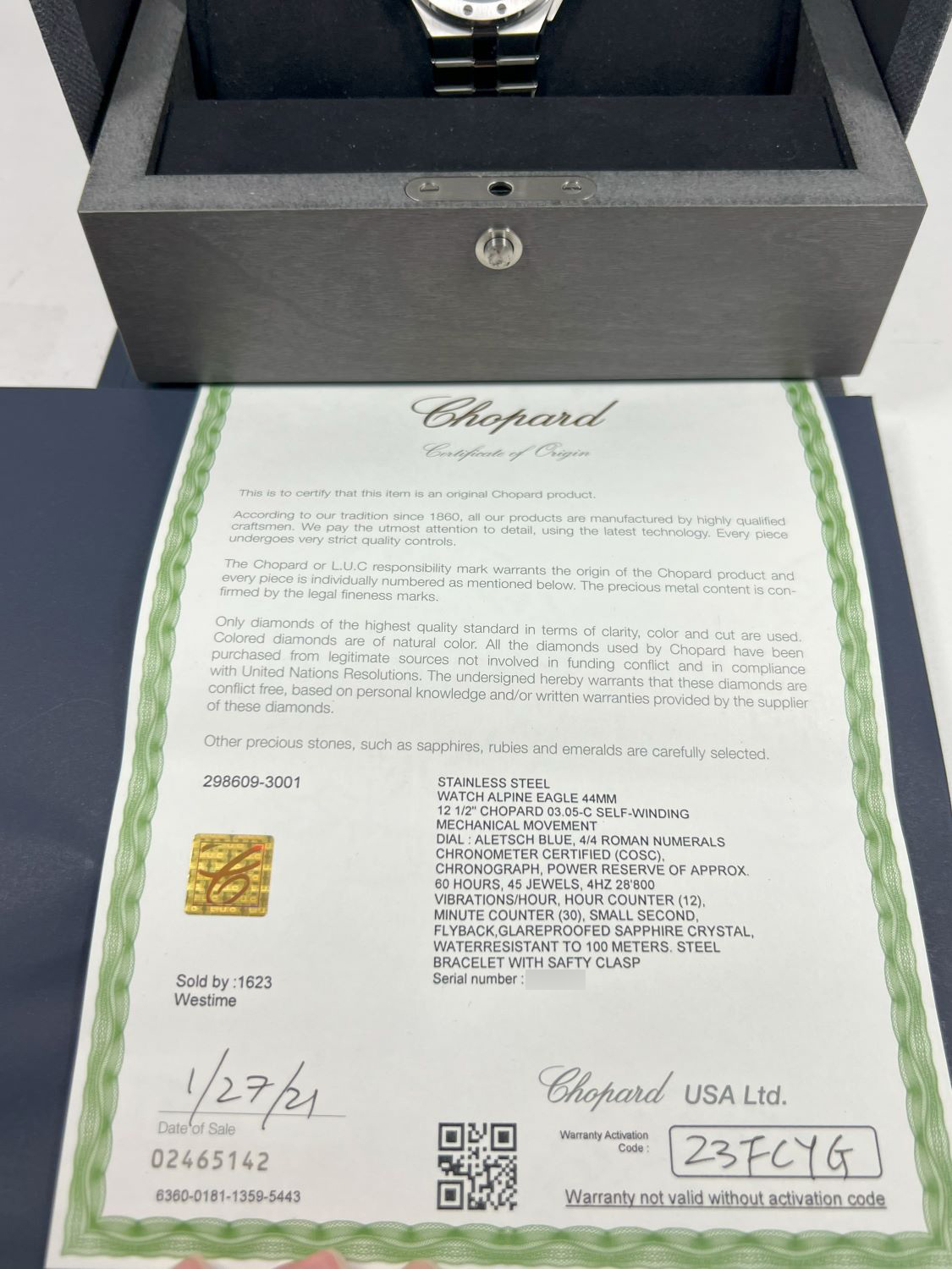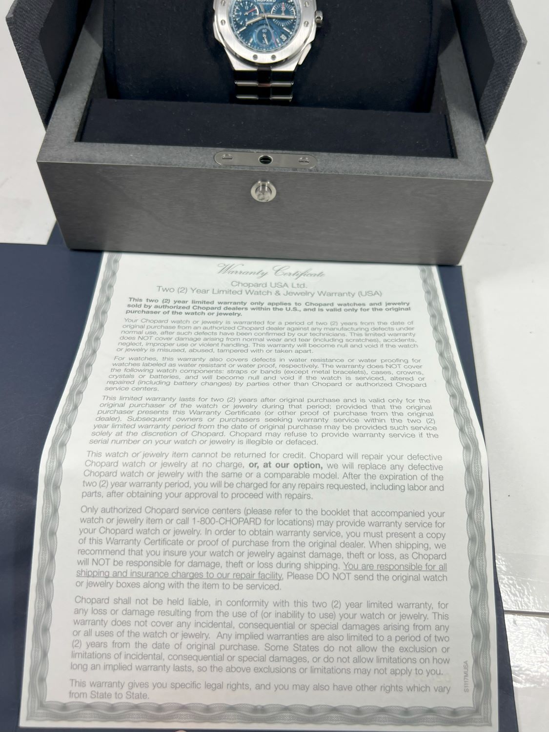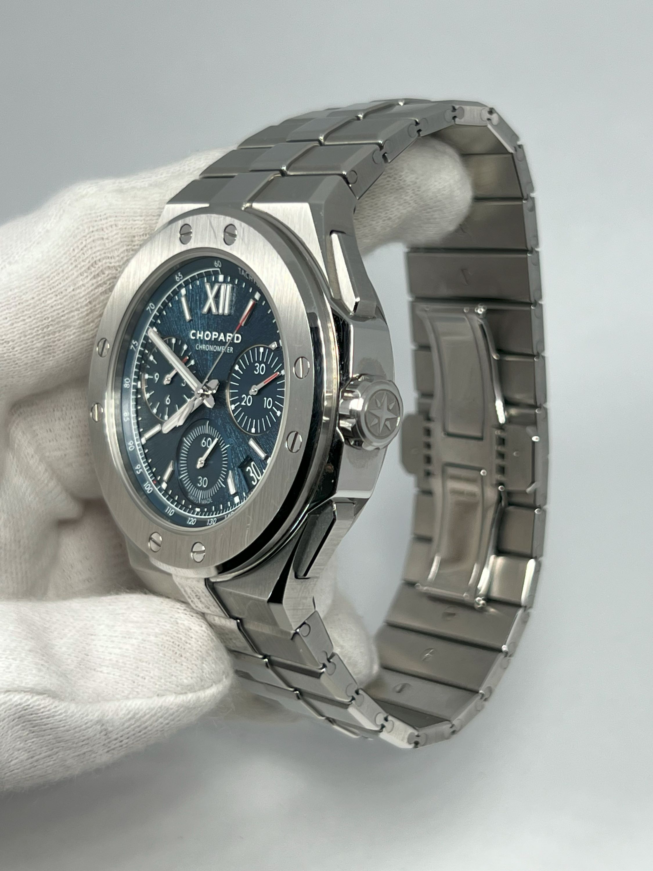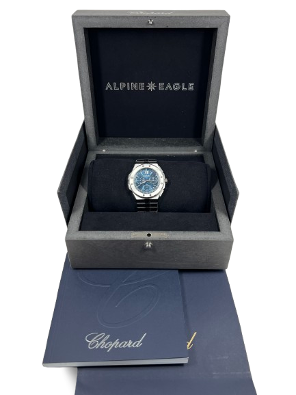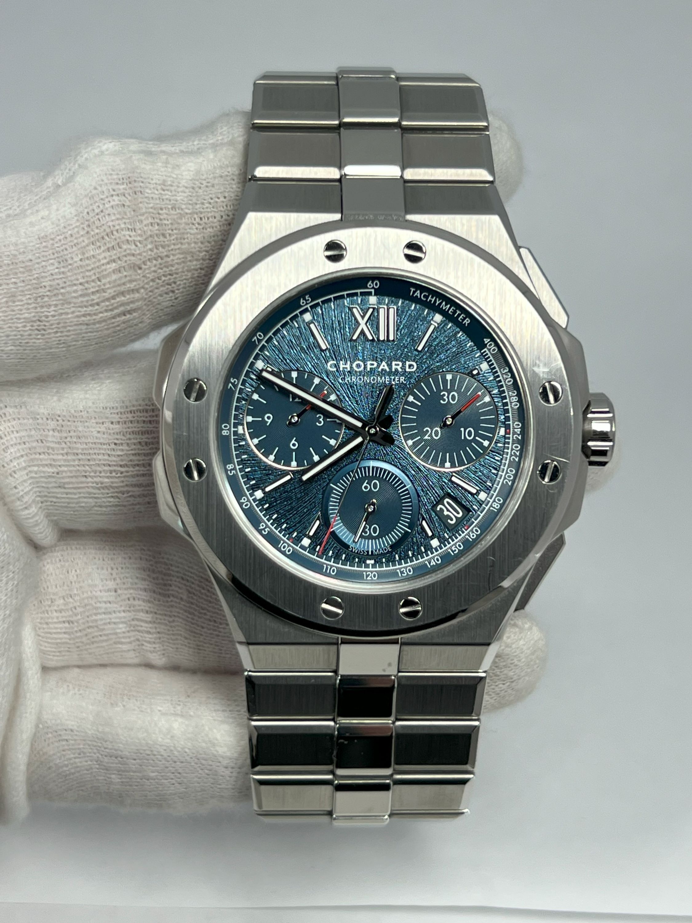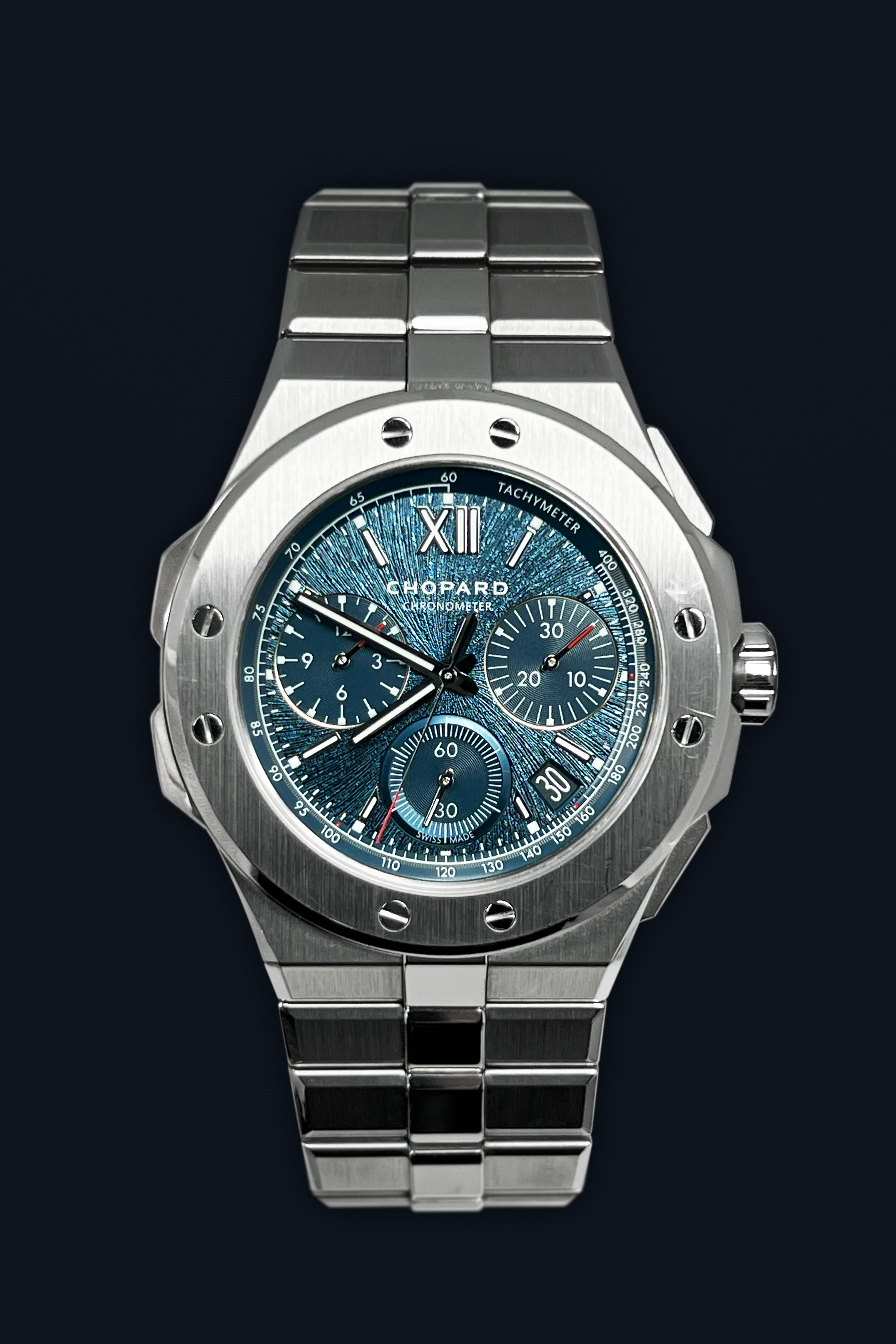 Dial“Aletsch” blue textured dial, signed “Chopard”, luminous “baguette” hands, applied luminous indexes, small seconds at 6 o’clock, 30-minute counter at 3 o’clock, 12-hour counter at 9 o’clock, date between 4 and 5 o’clock