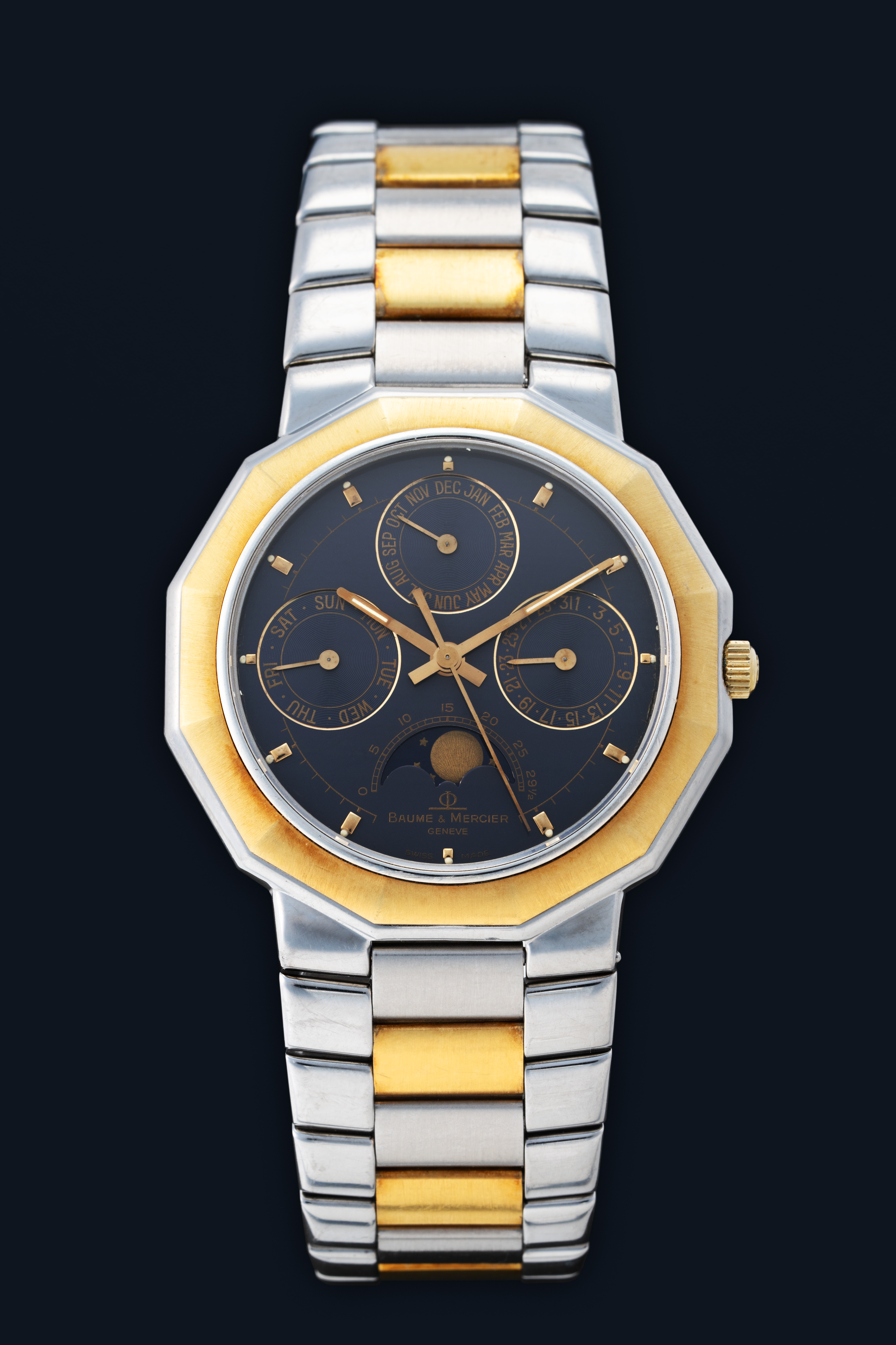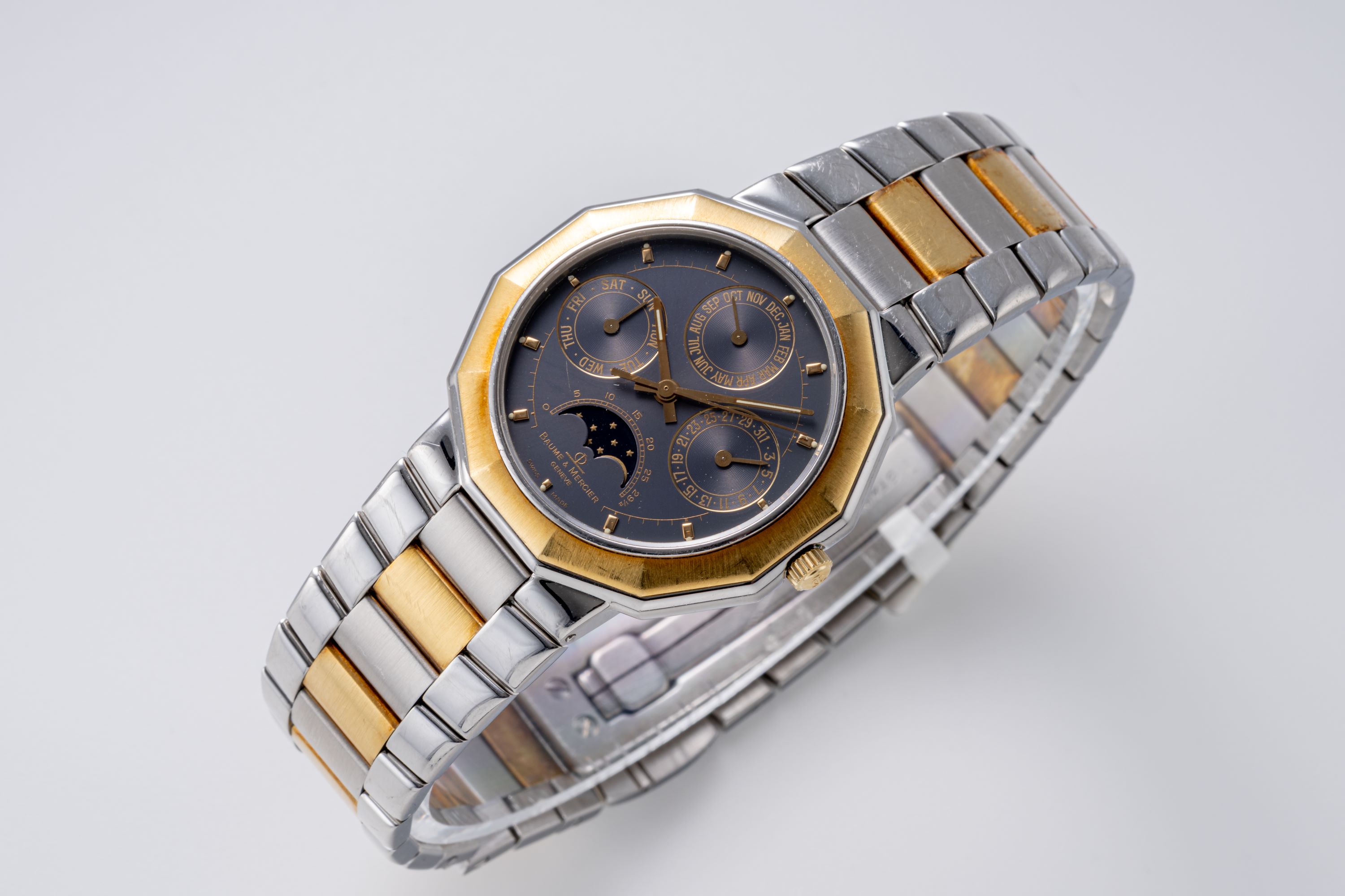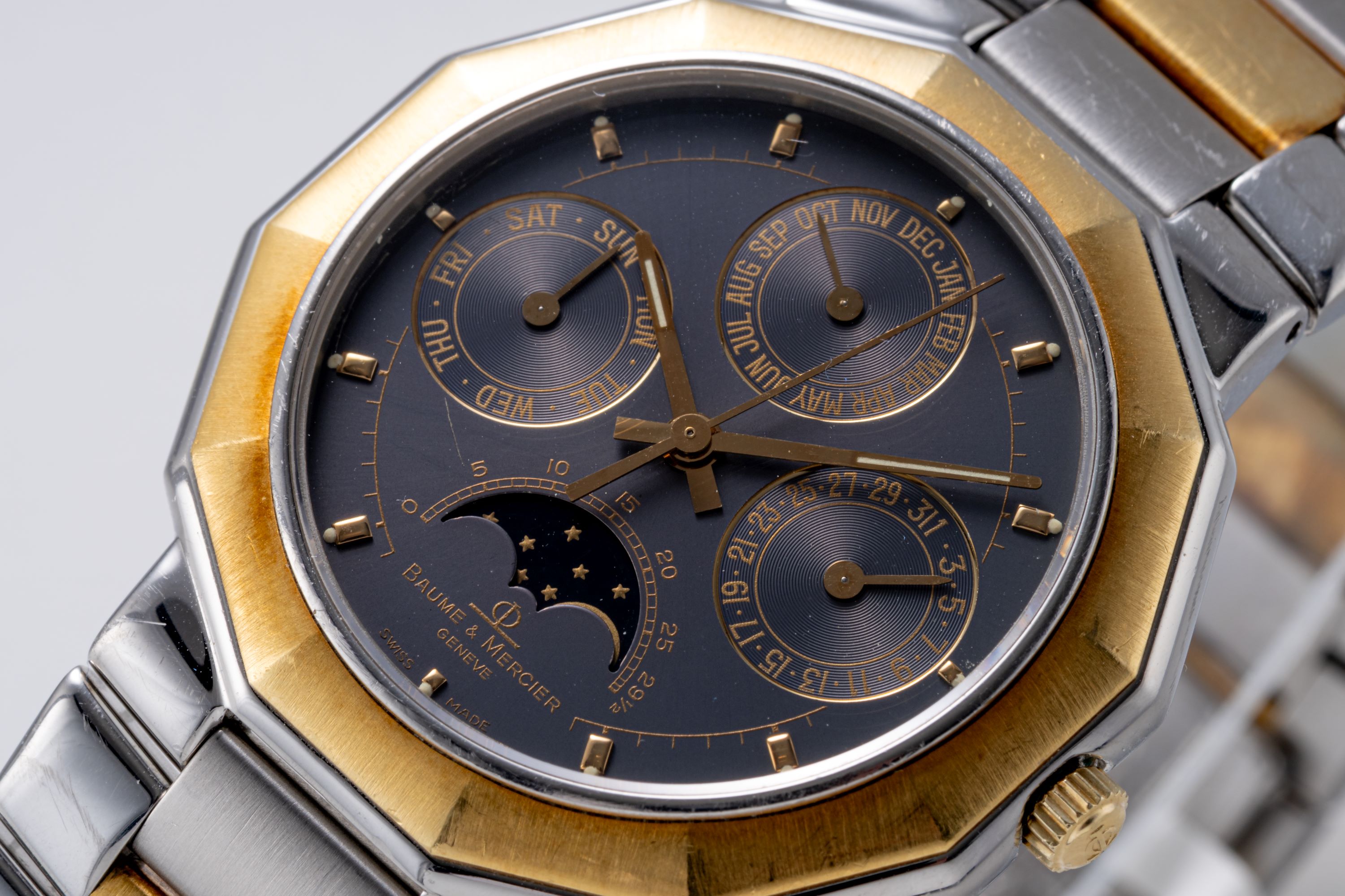 DialGrey dial with gold applied indices, gold hands, moonphase at 6 o'clock, date at 3 o'clock, day at 9 o'clock, month at 12 o'clock, signed 'Baume & Mercier' at 6 o'clock