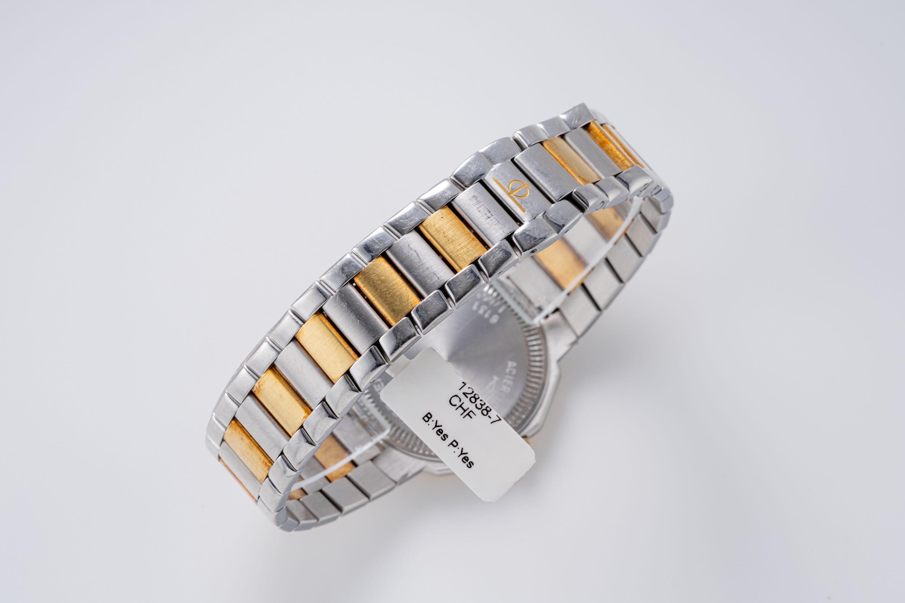 CaseDodecagonal case in stainless steel with fixed bezel in 18k yellow gold, crown at 3 o'clock, solid caseback