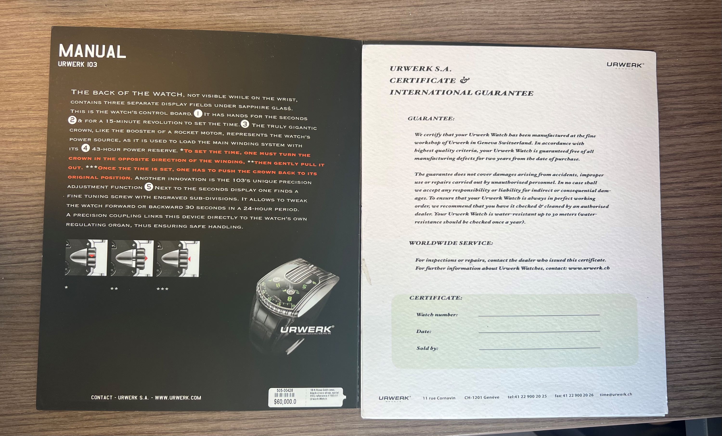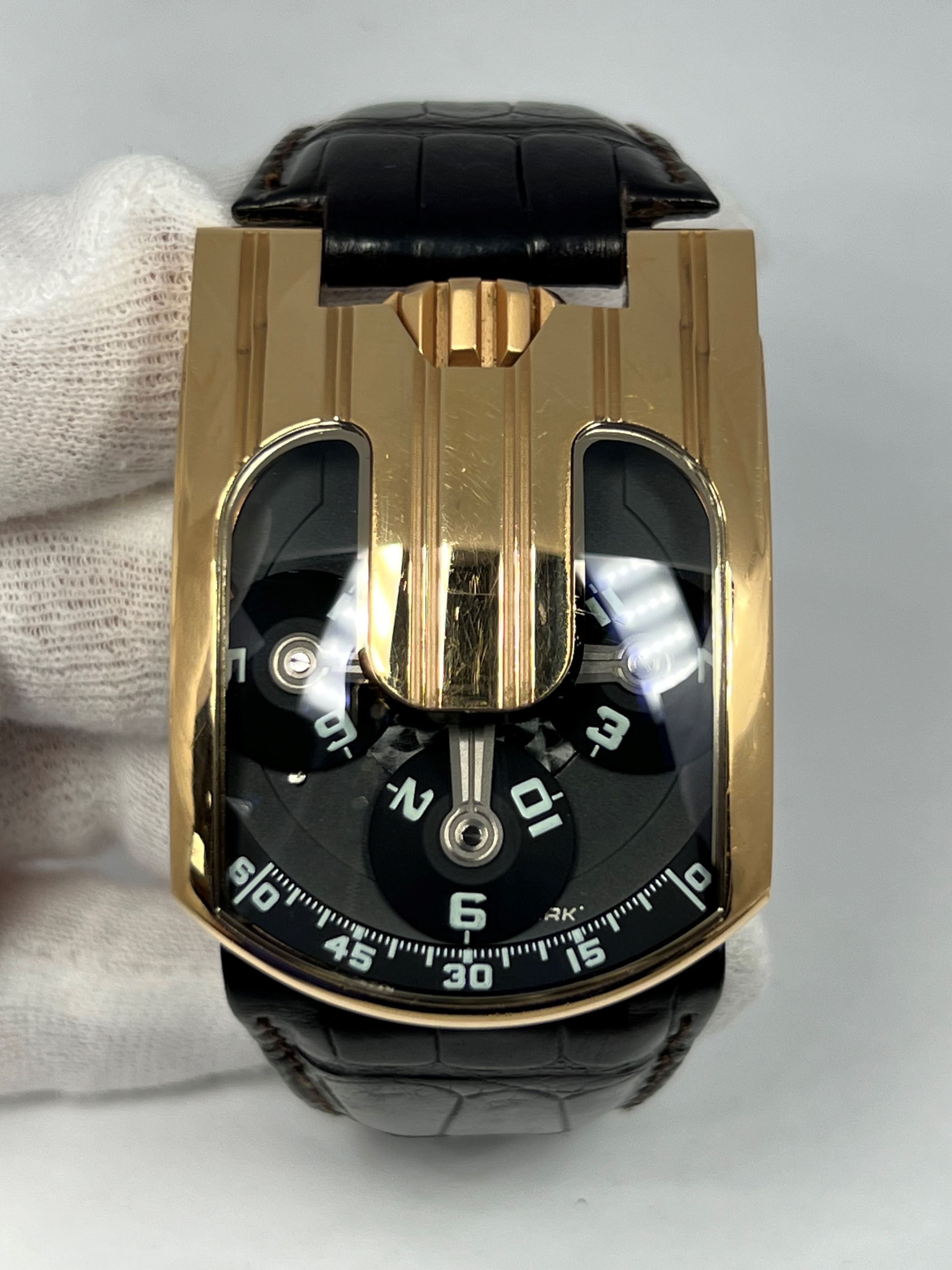 MovementHand-wound mechanical movement, cal. Urwerk UR-3.03, functions: wandering hour, minutes, control board with minutes, seconds, power reserve on caseback