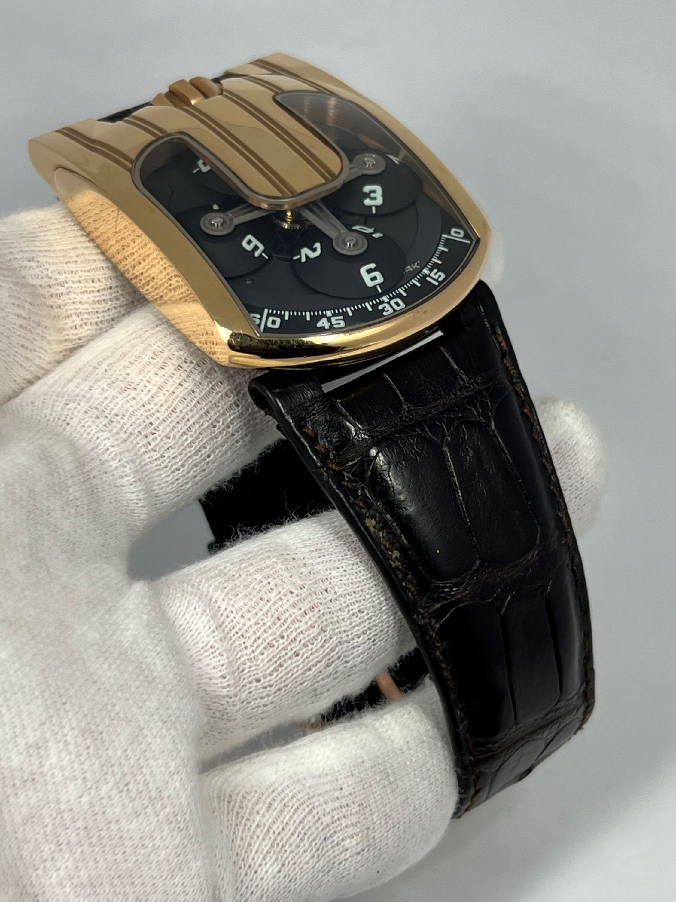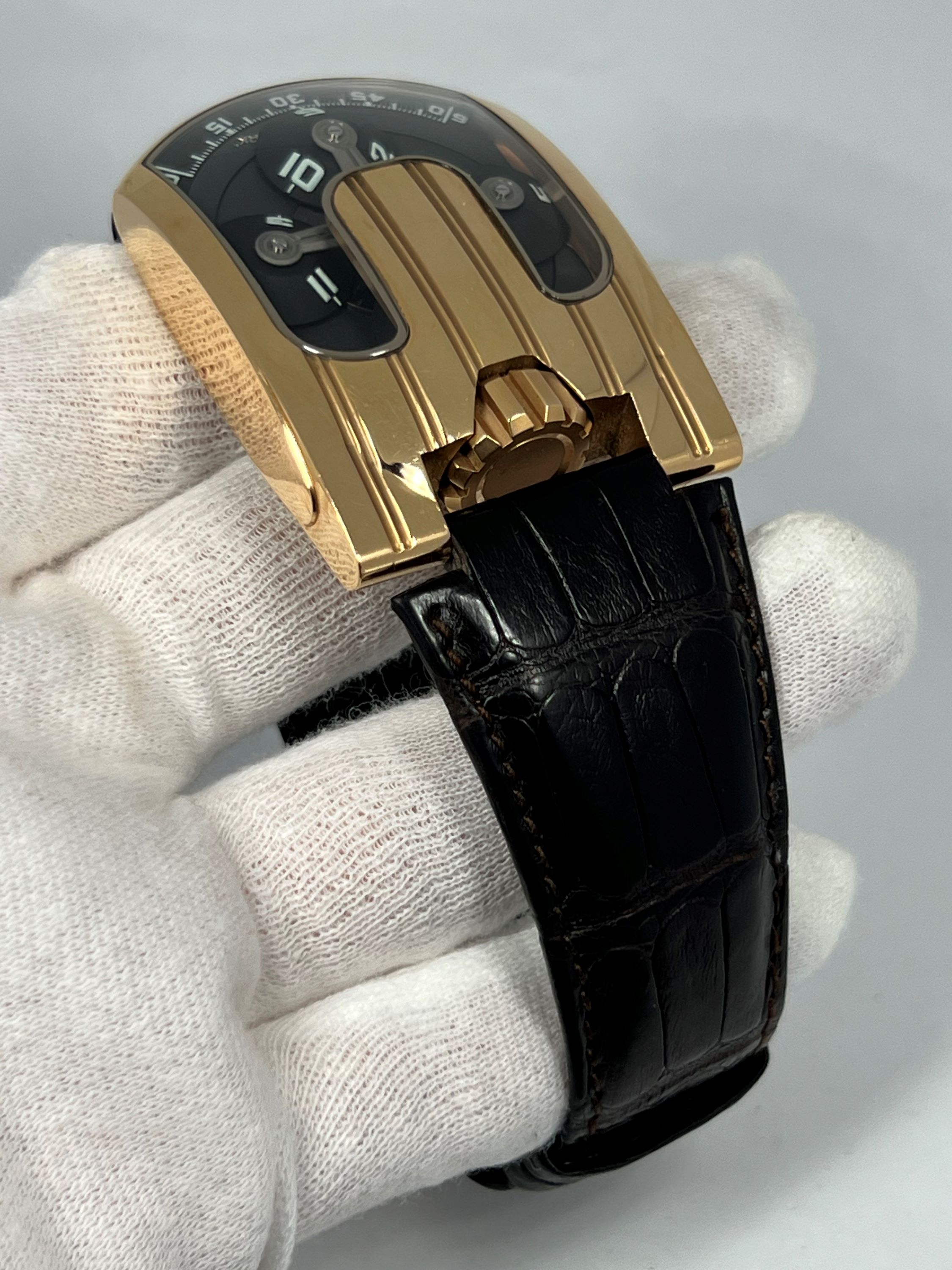 CaseRectangular curved case in 18k rose gold, U-shaped crystal, caseback in blackened titanium with control board with minutes (0-15), seconds, power reserve and with fine tuning screw, large winding crown at 12 o’clock