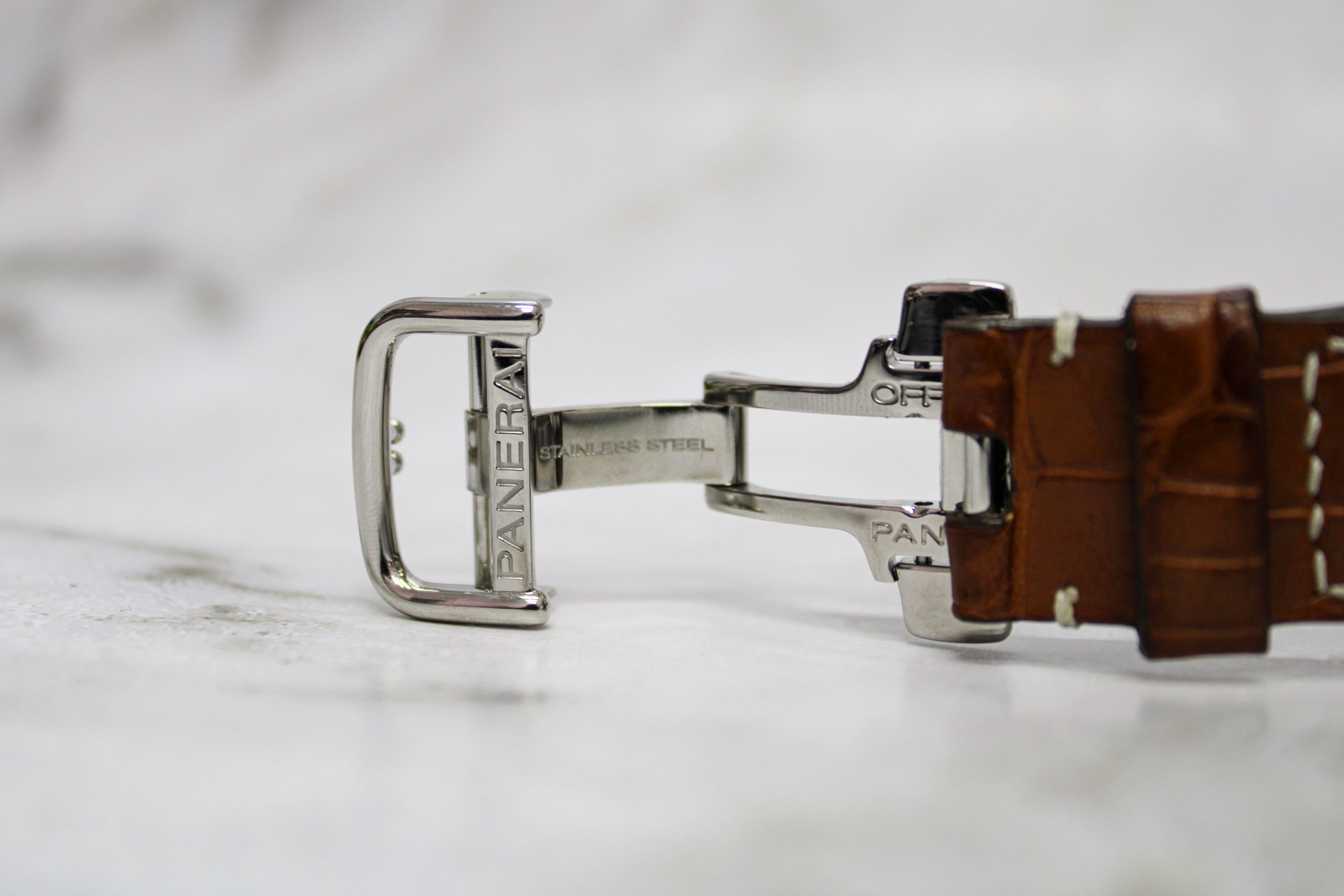 DialMatt black dial signed “Radiomir GMT Panerai”, luminous hour indexes, luminous ‘obelisk’ hour and minute hands, small seconds at 9 o’clock, central 24-hour GMT hand, date at 3 o’clock under lens