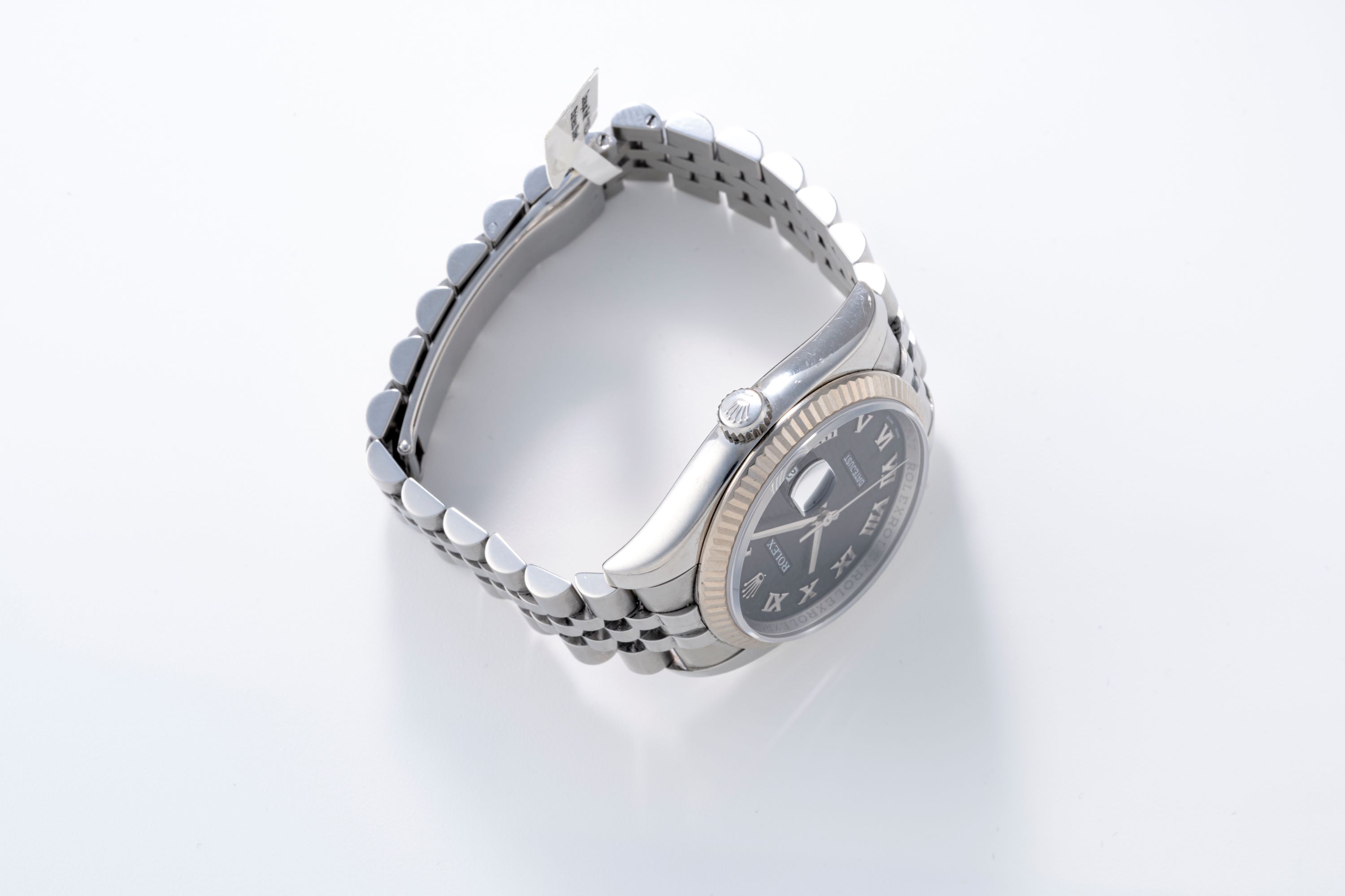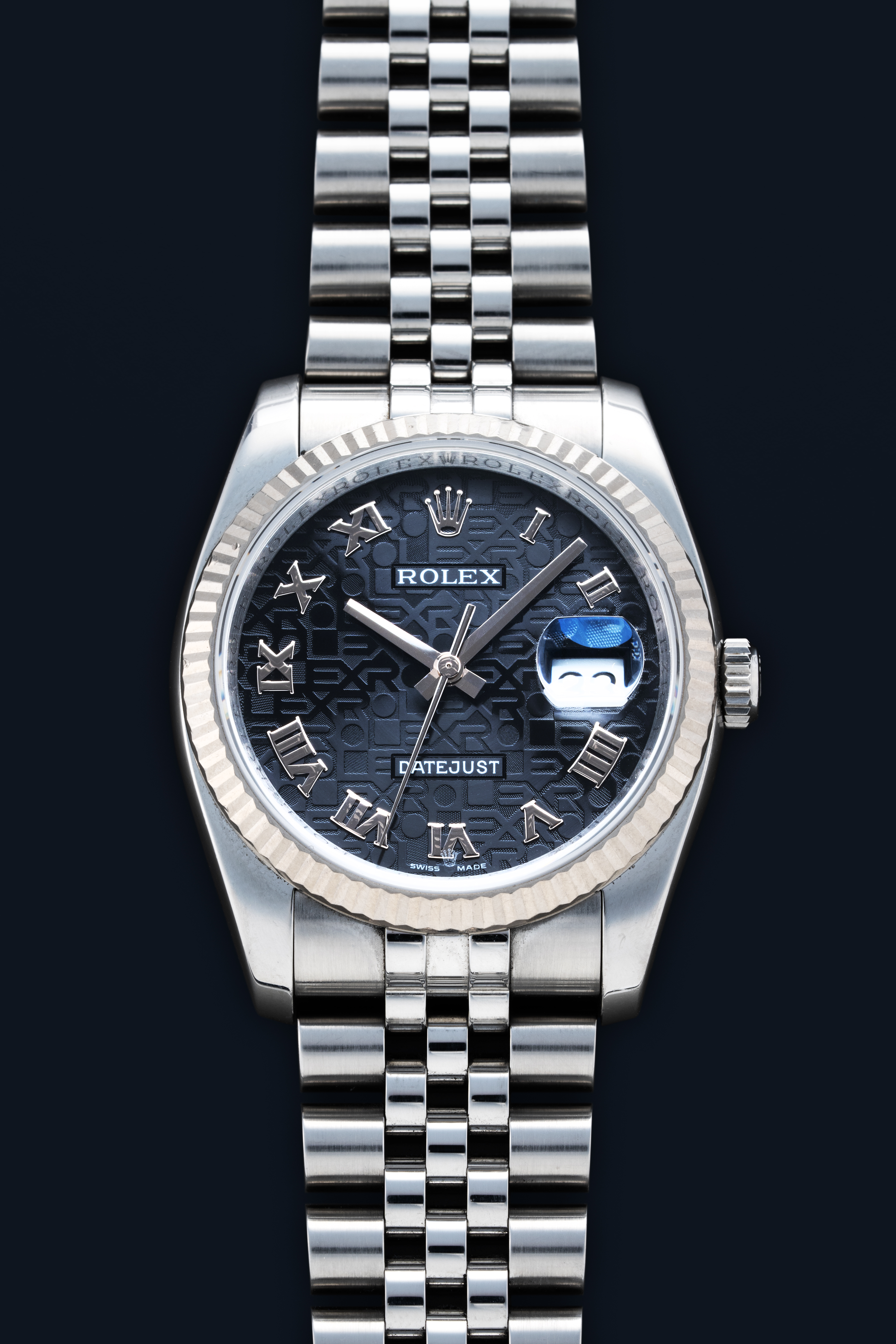 DialBlack dial with repeating 'Rolex' guilloche engraving, applied white gold roman numerals, white gold hands, magnified date window at 3 o'clock, signed 'Rolex' at 12 o'clock