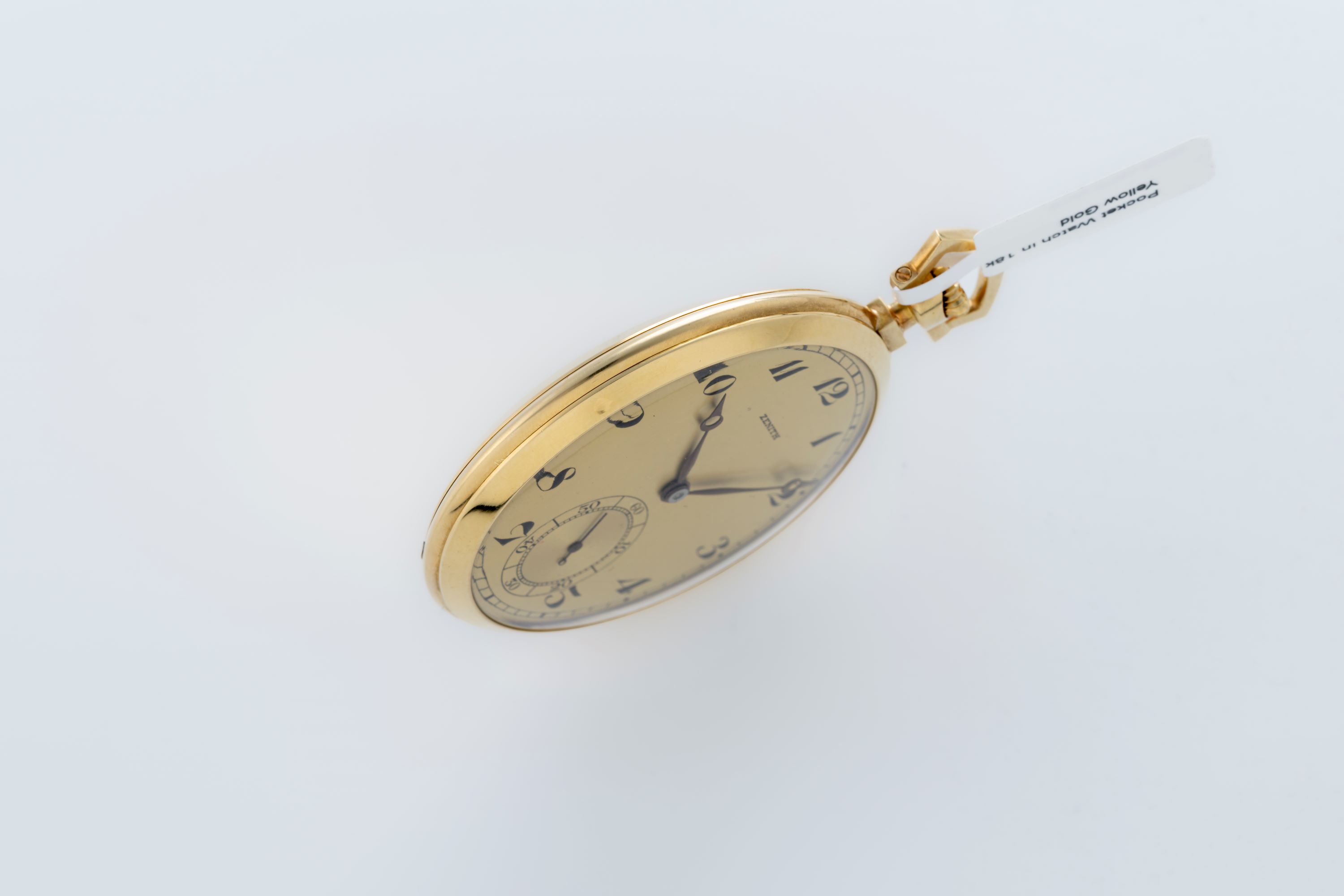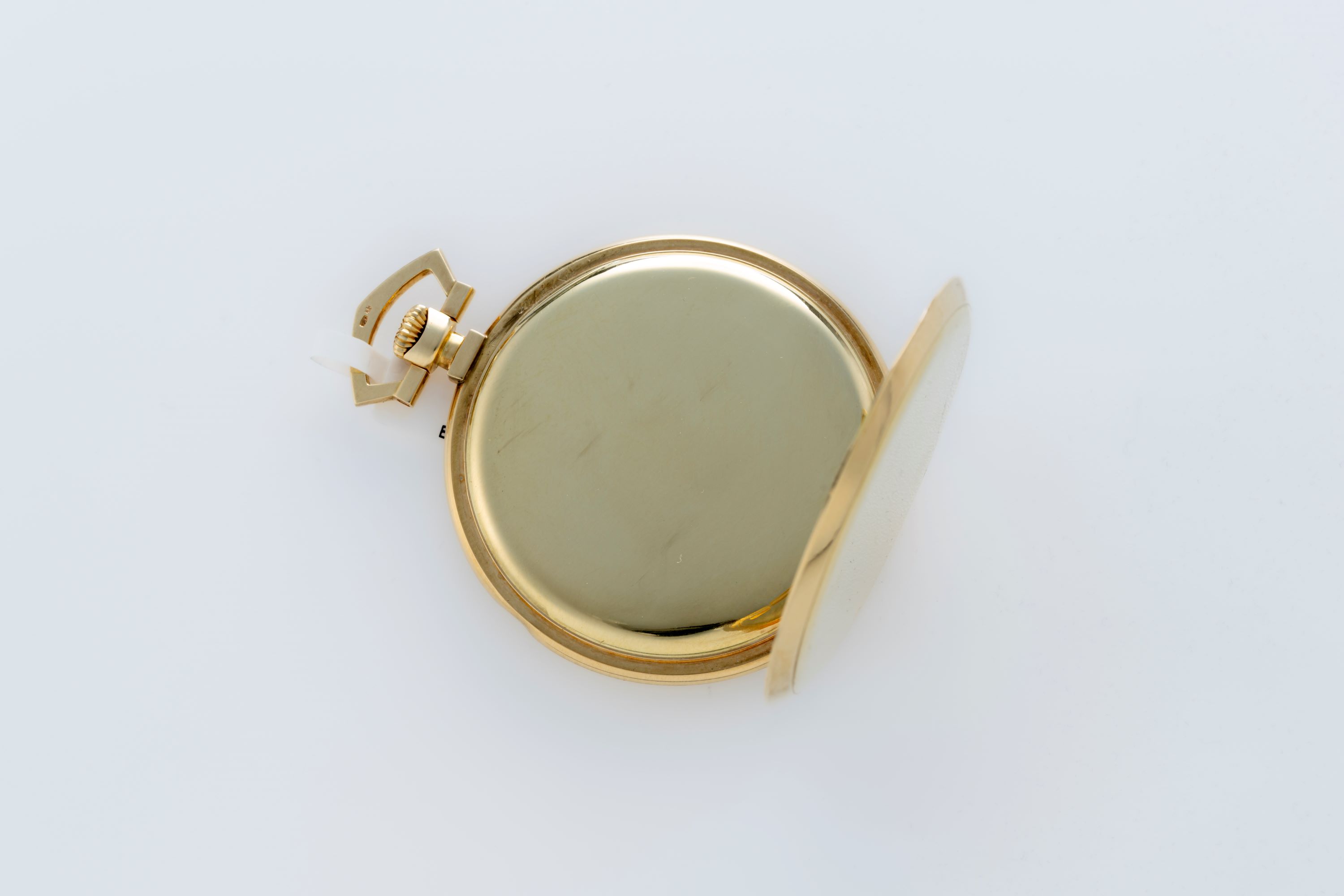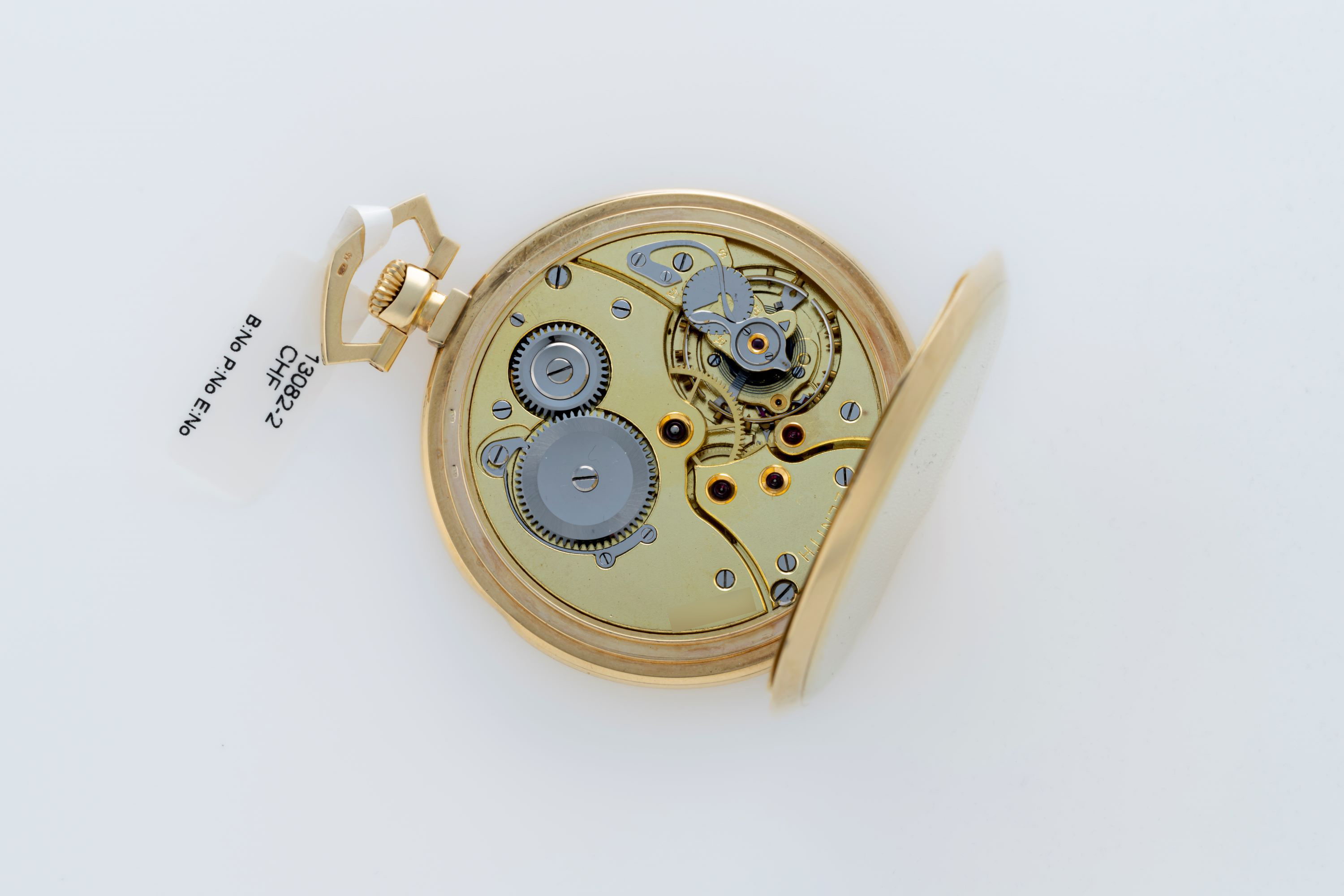 CaseRound case in 18k yellow gold with double lid caseback, chain loop and winding crown at 12 o'clock
