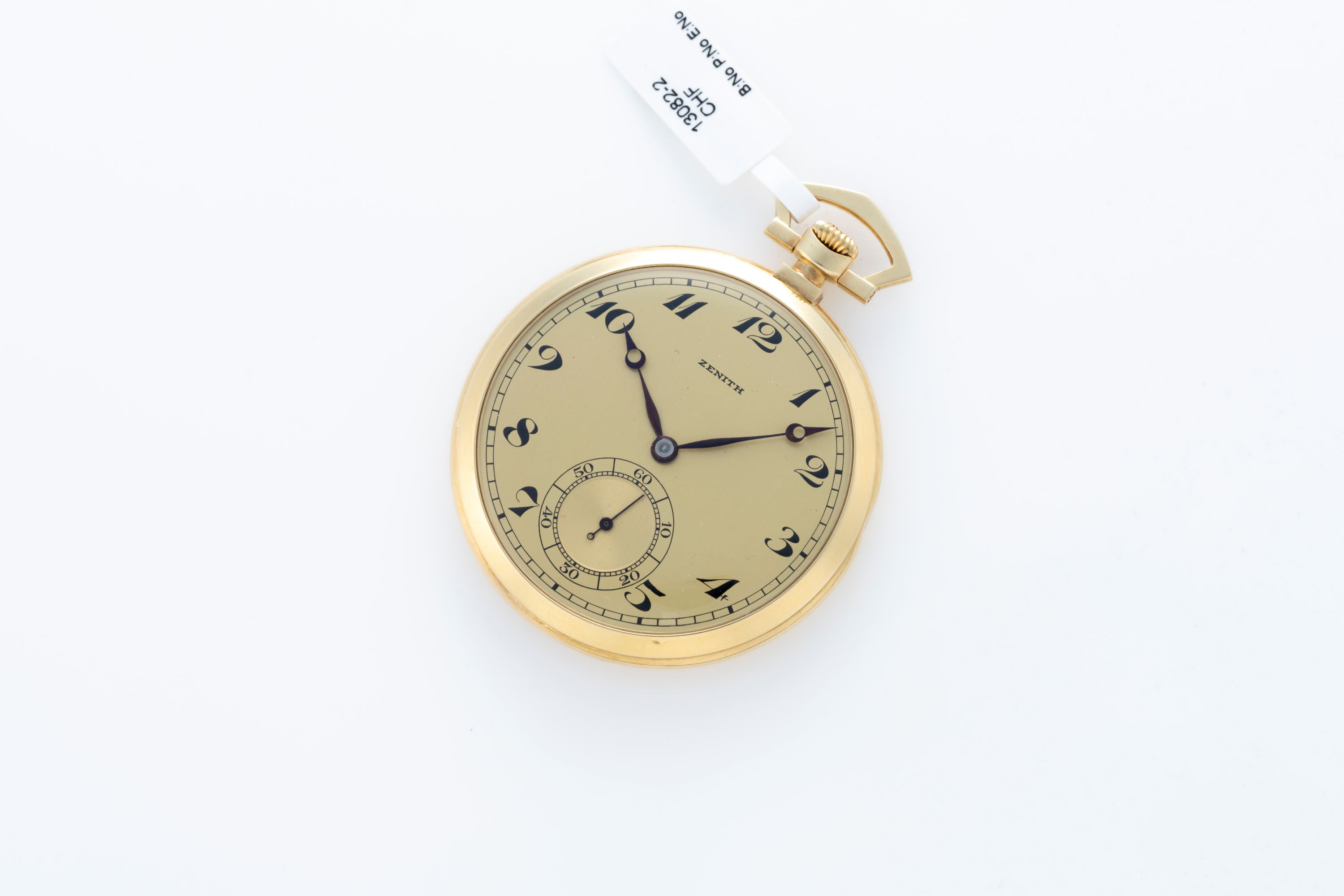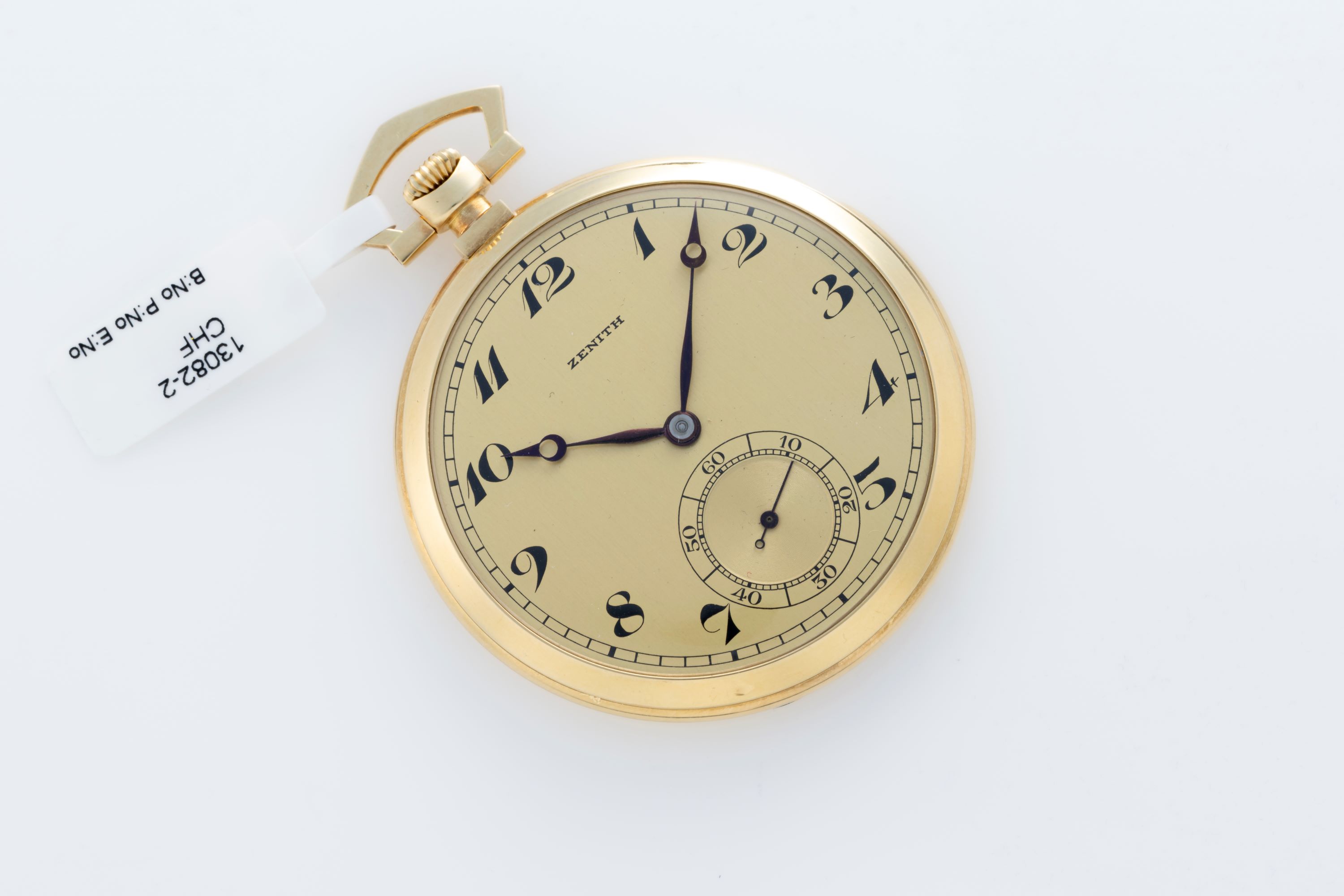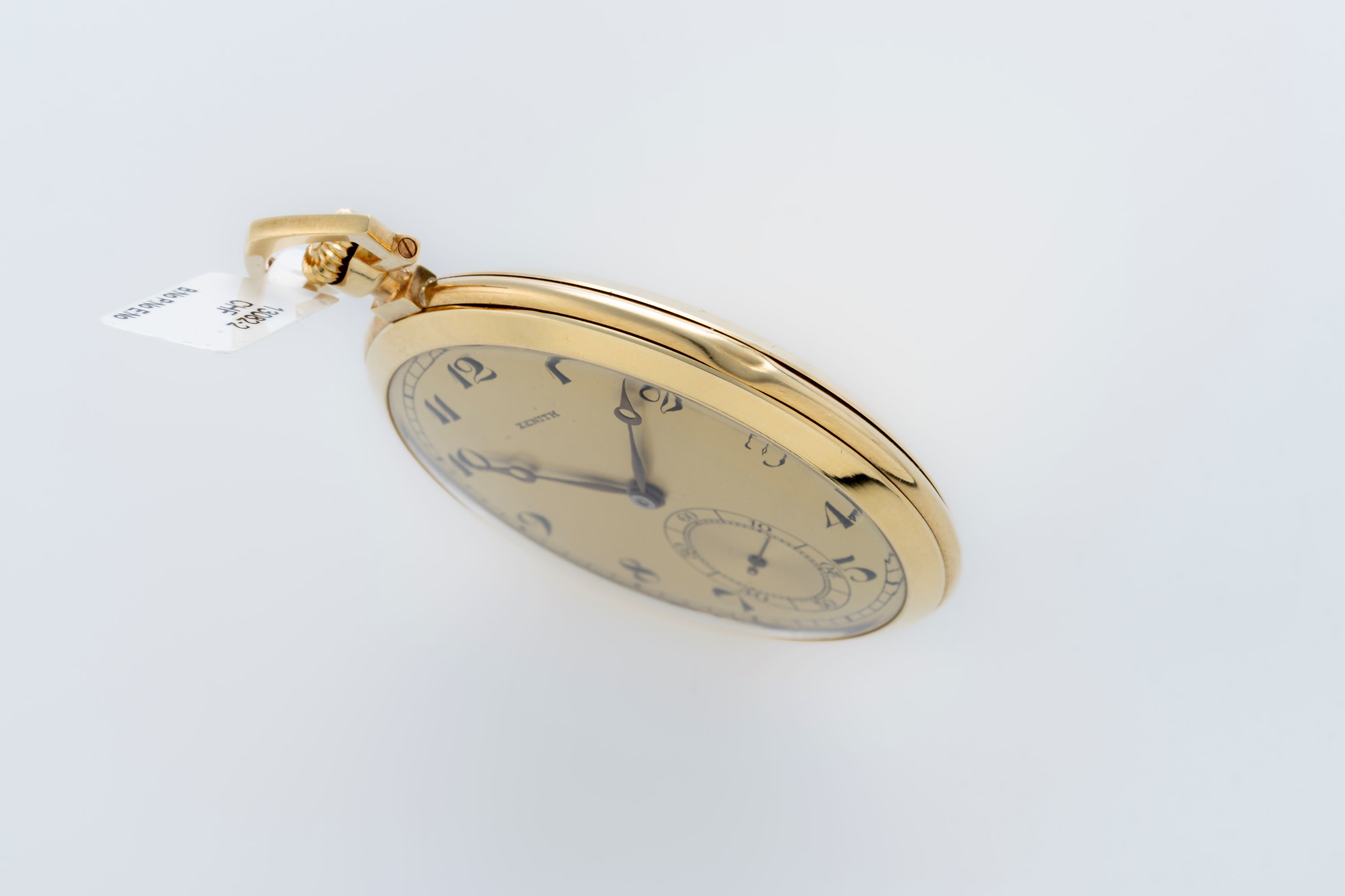 DialVertically brushed gold dial with Breguet numerals, heat-blued Breguet hands, small seconds at 6 o'clock, signed 'Zenith' at 12 o'clock