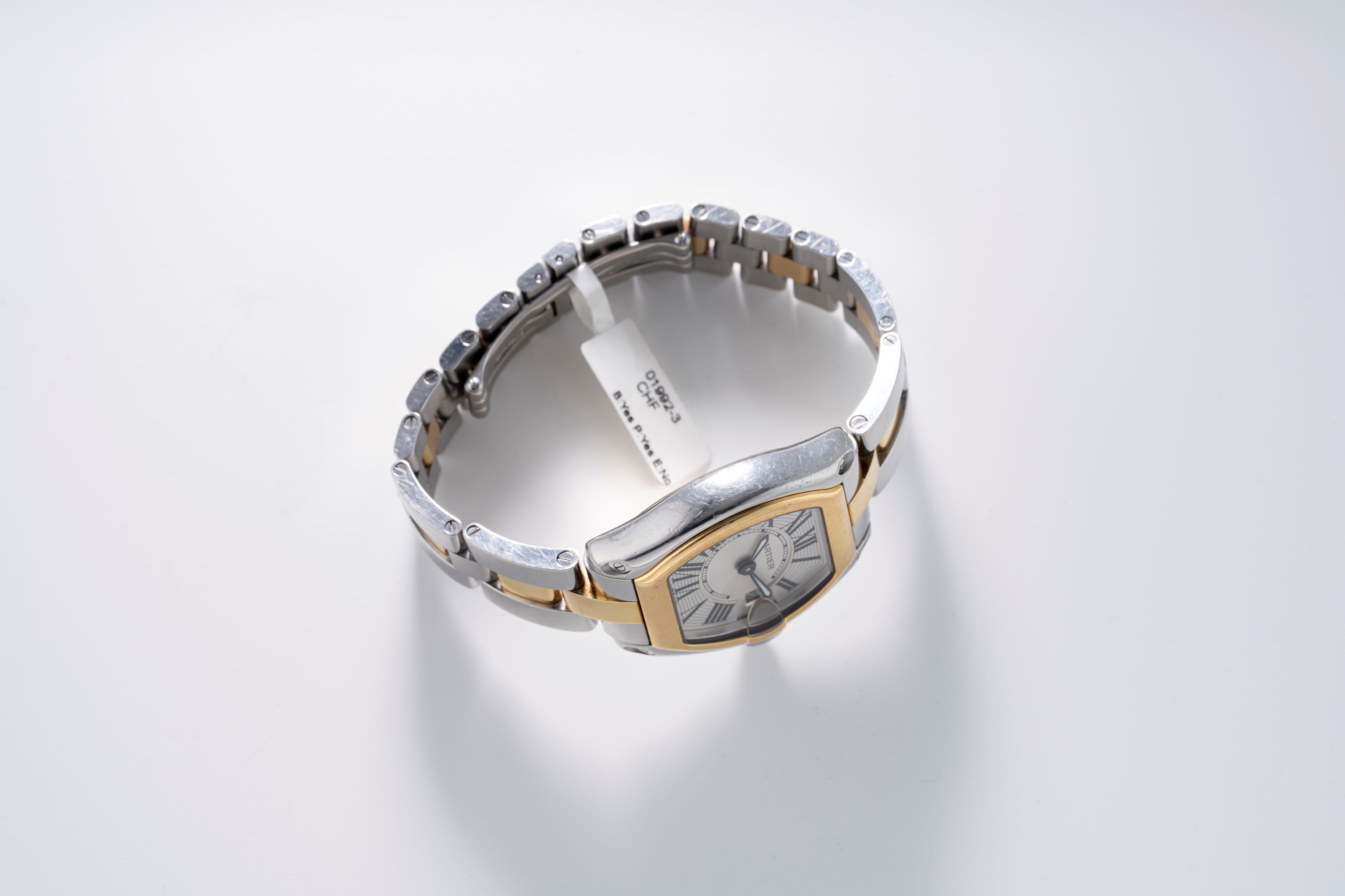 DialSilver dial with large roman numerals, luminous sword hands, magnified date window at 3 o'clock, signed 'Cartier' at 12 o'clock