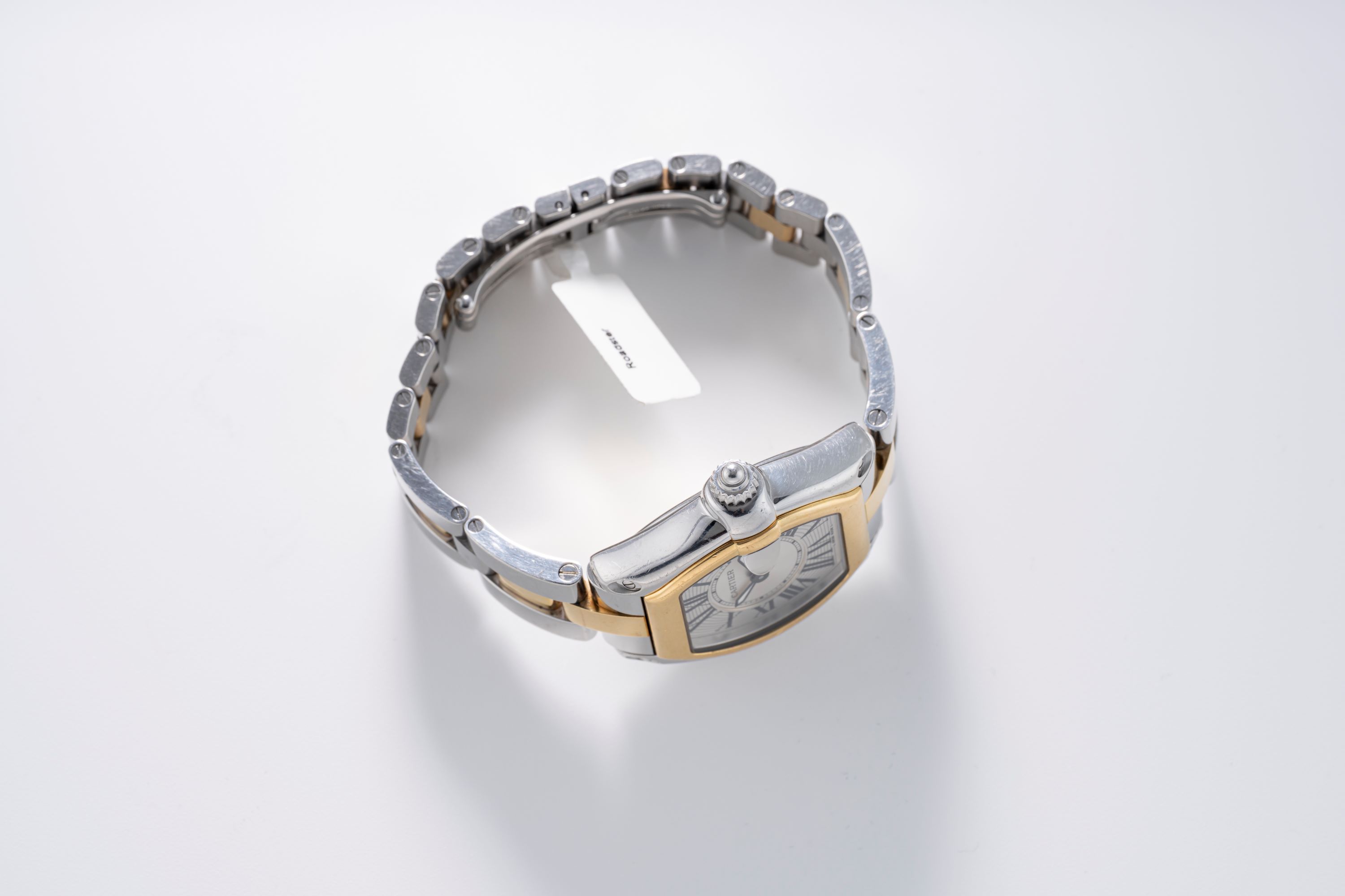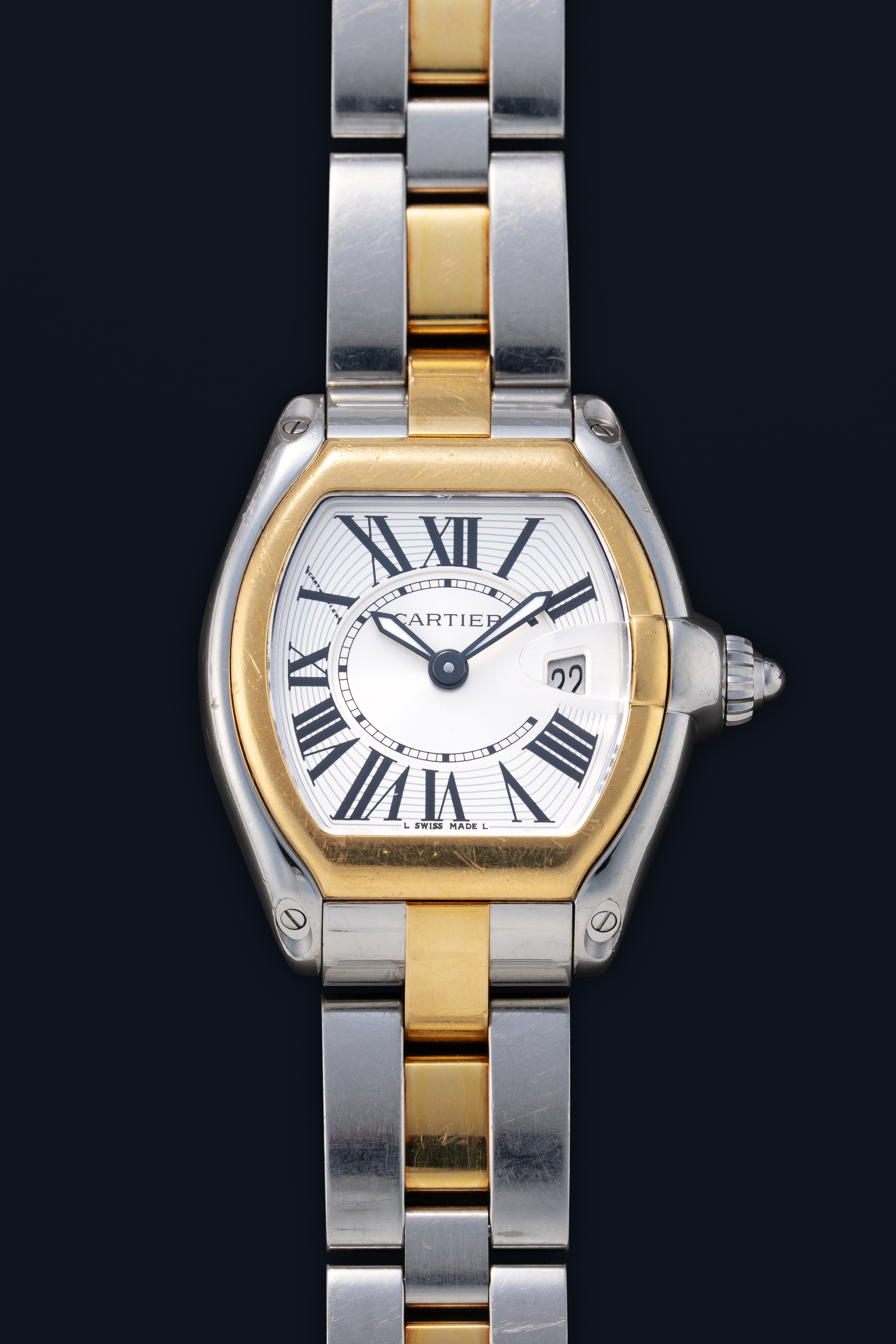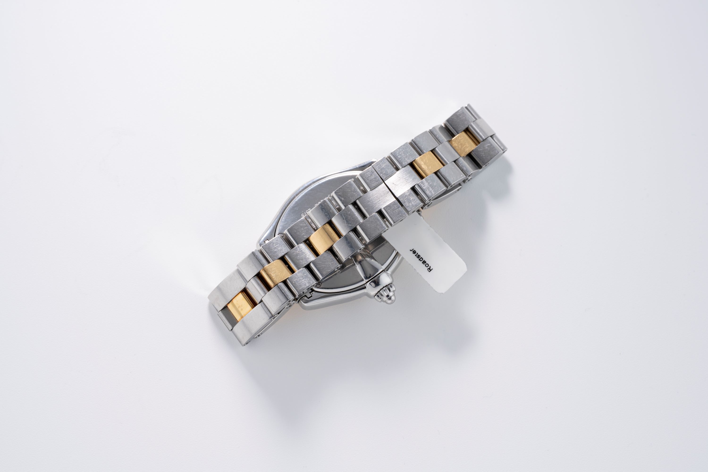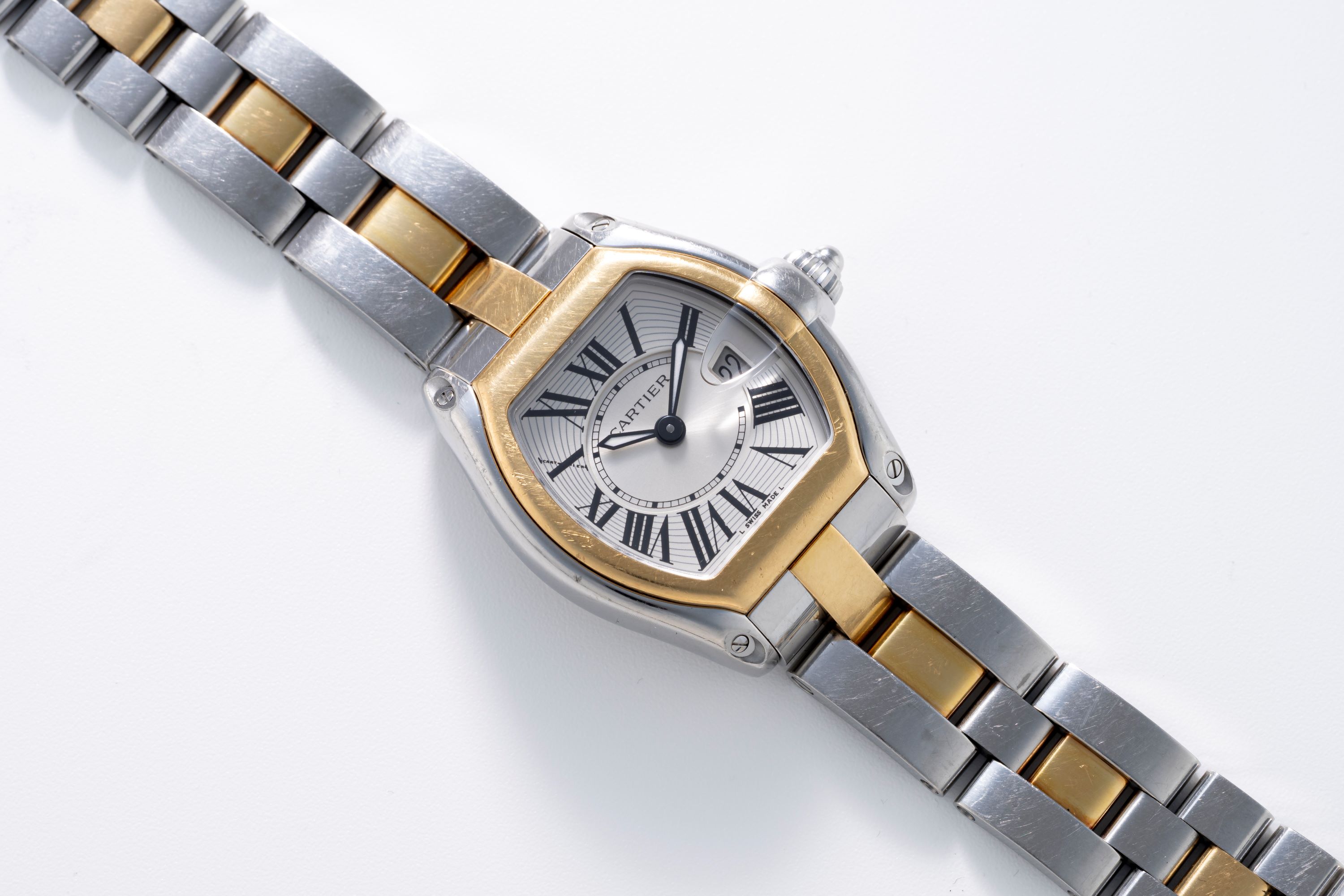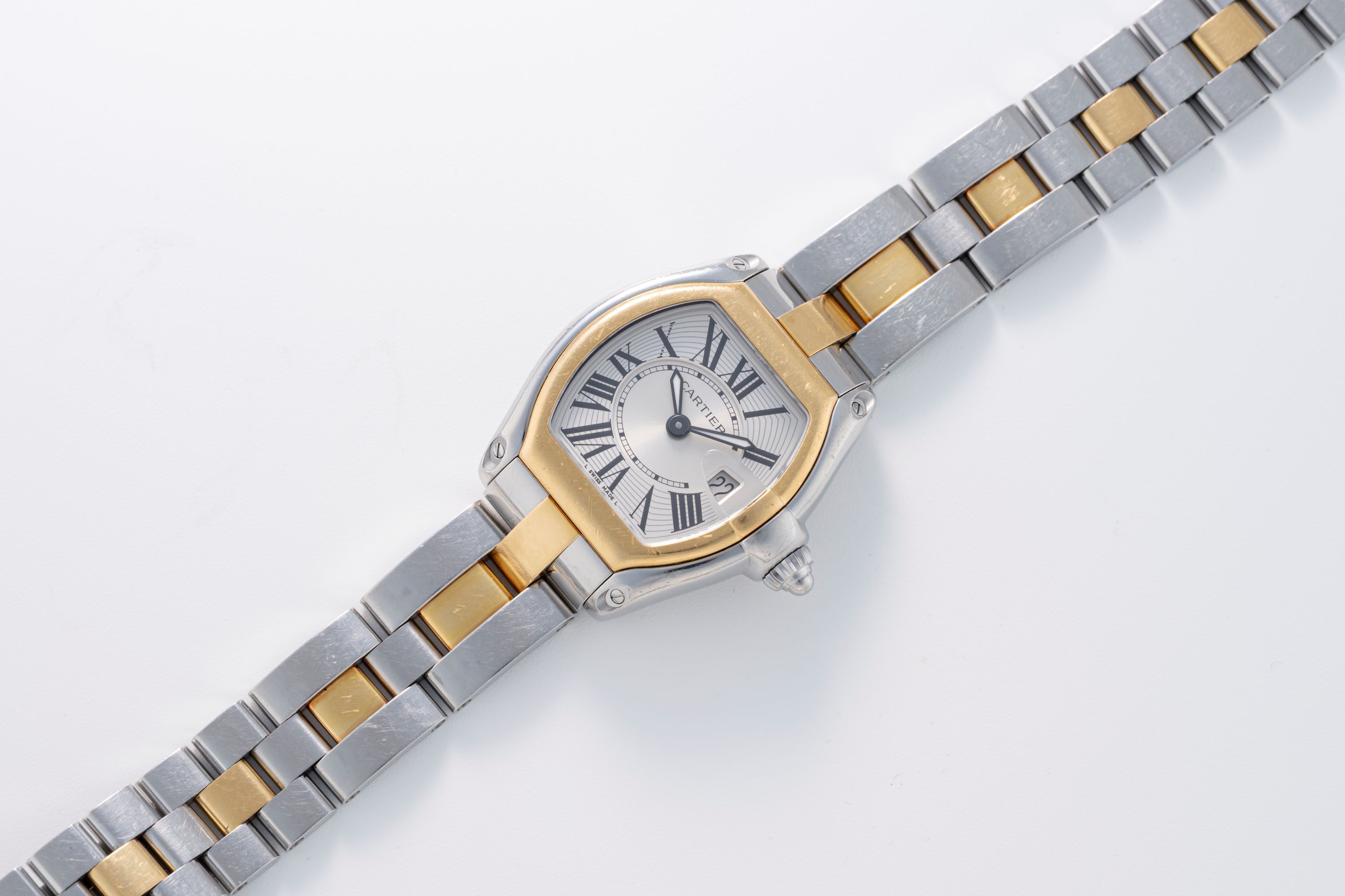 CaseRoadster case in stainless steel with bezel in 18k yellow gold, crown at 3 o'clock with flowing design into the date magnifier
