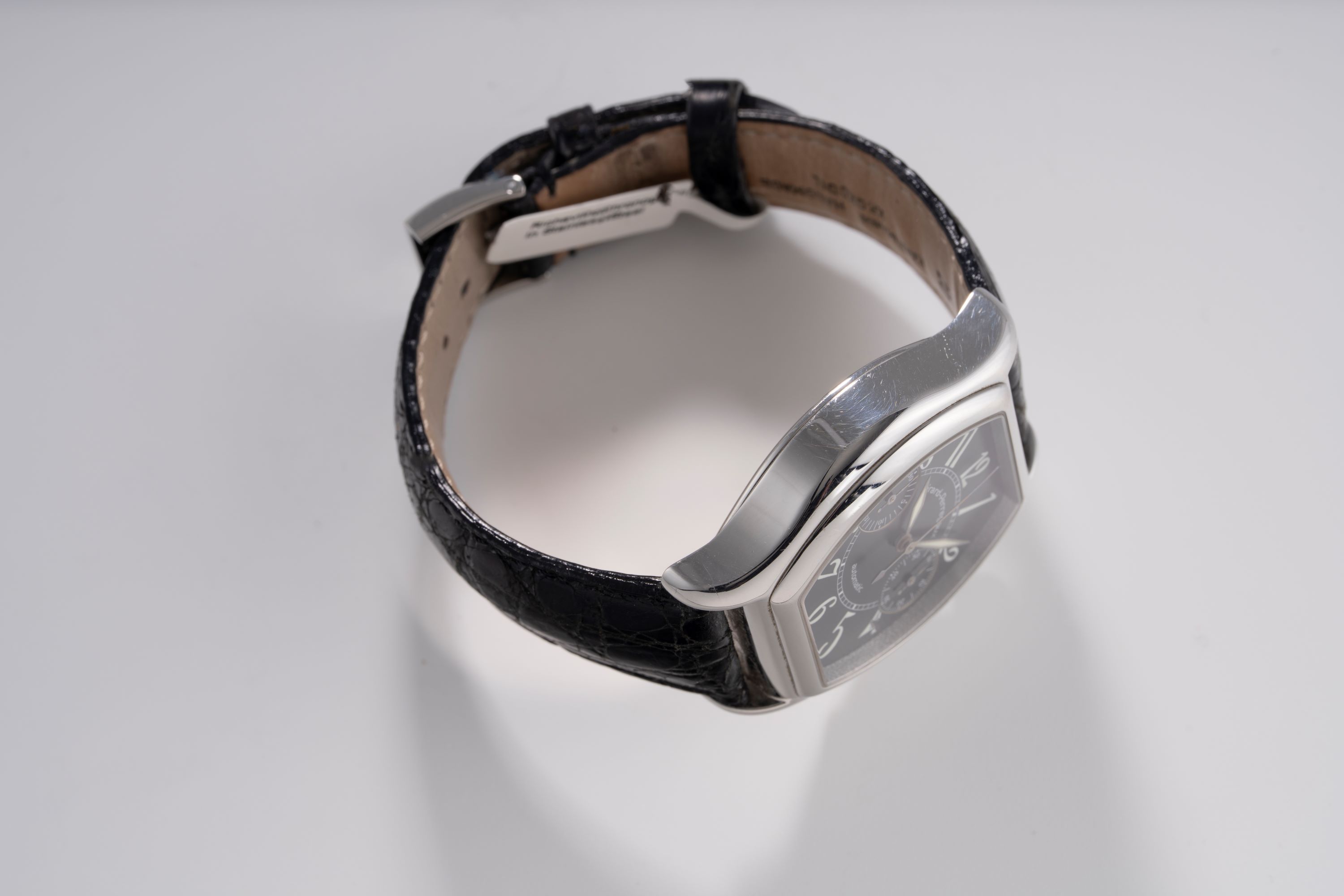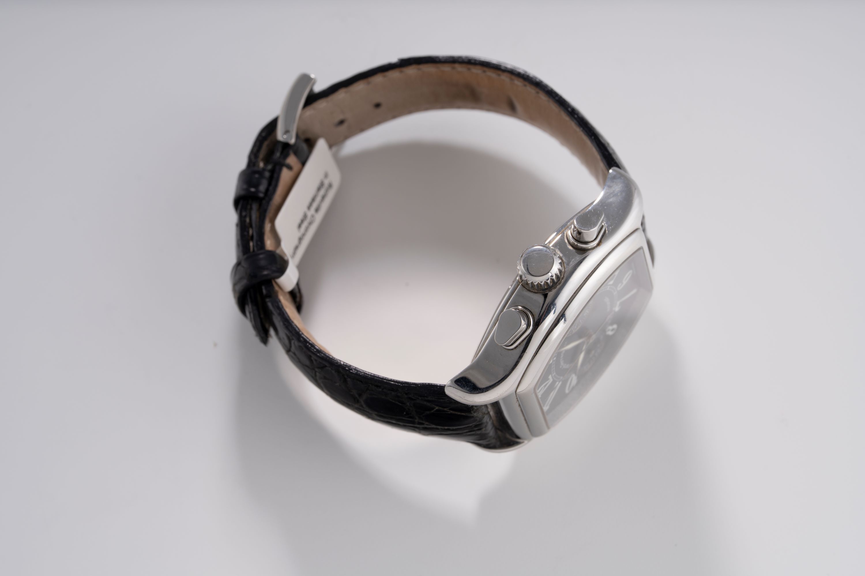 CaseTonneau case in stainless steel with chronograph pushers at 2 and 4 o'clock, crown at 3 o'clock, solid caseback
