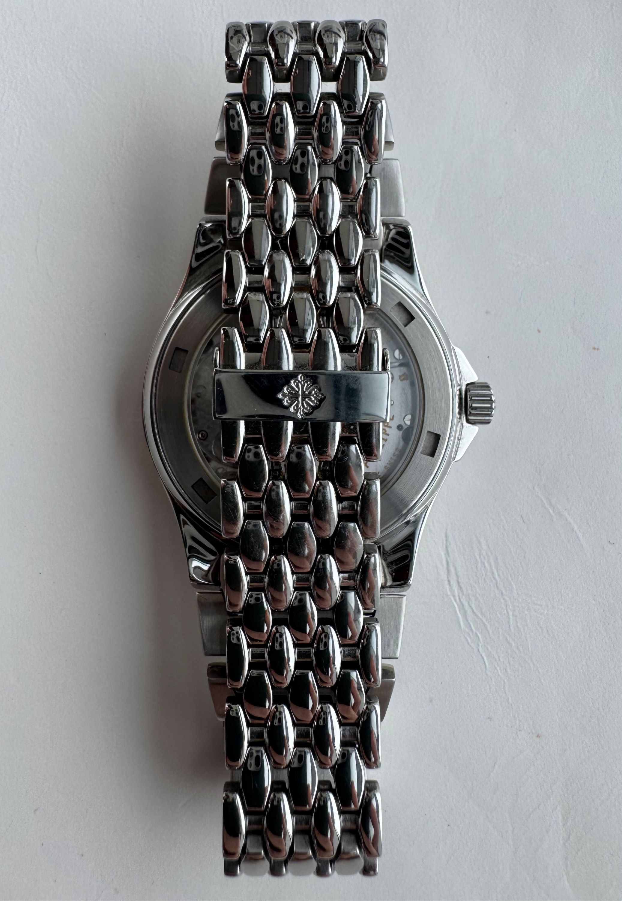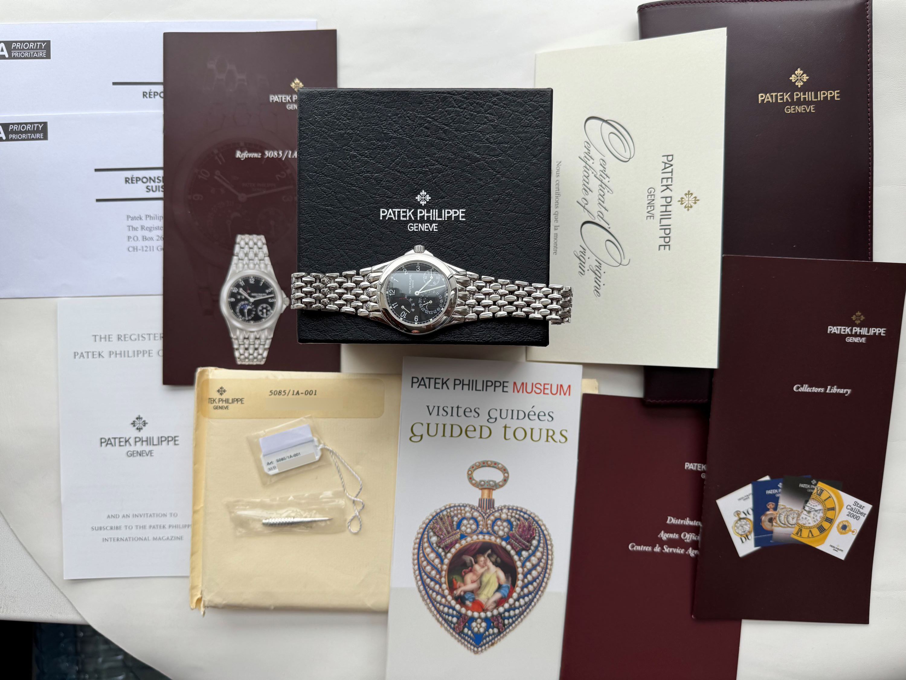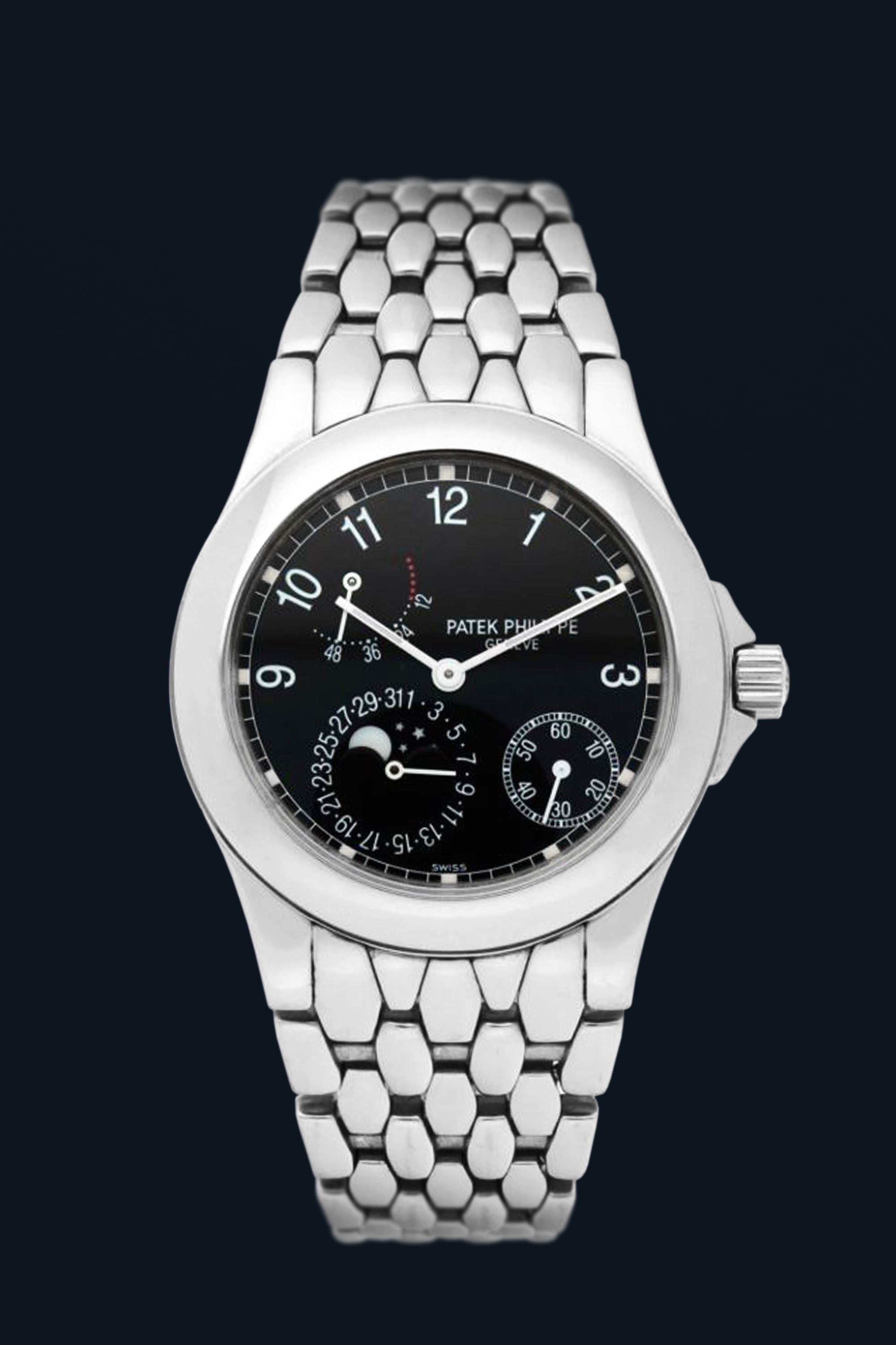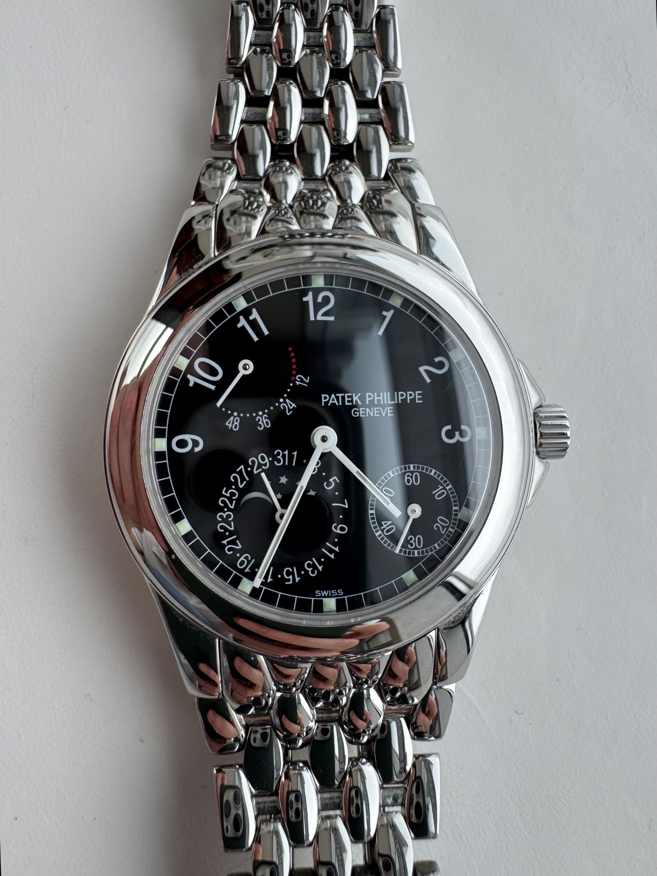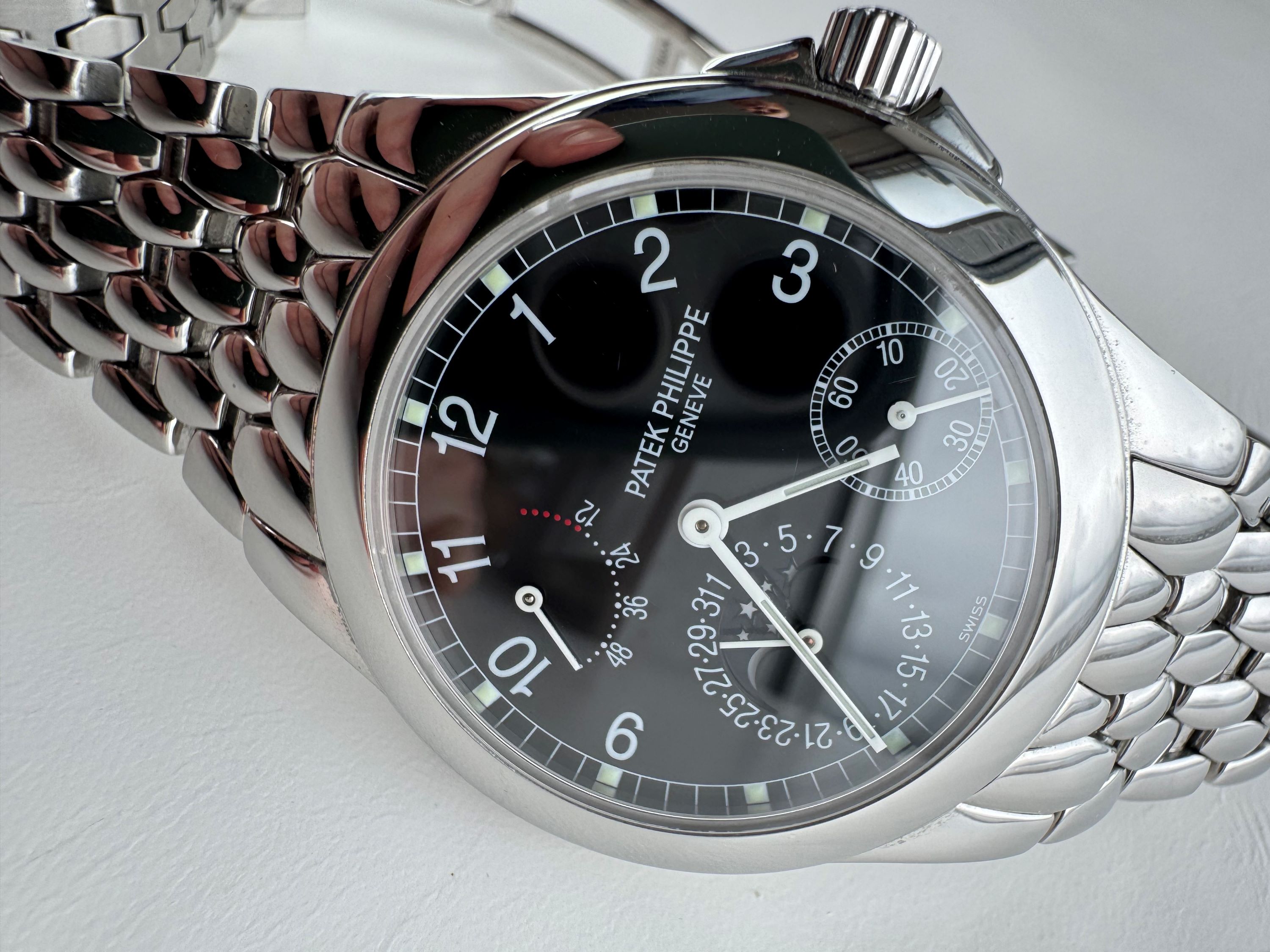 | Dial | Black dial, signed “Patek Philippe Geneve”, white Arabic numerals, square luminous hour indexes on a ‘railway’ minute track, white ‘stick’ hour and minute hands, luminous, small seconds at 5 o’clock, date and moonphase sub-dial at 7 o’clock, power reserve indicator at 10 o’clock |