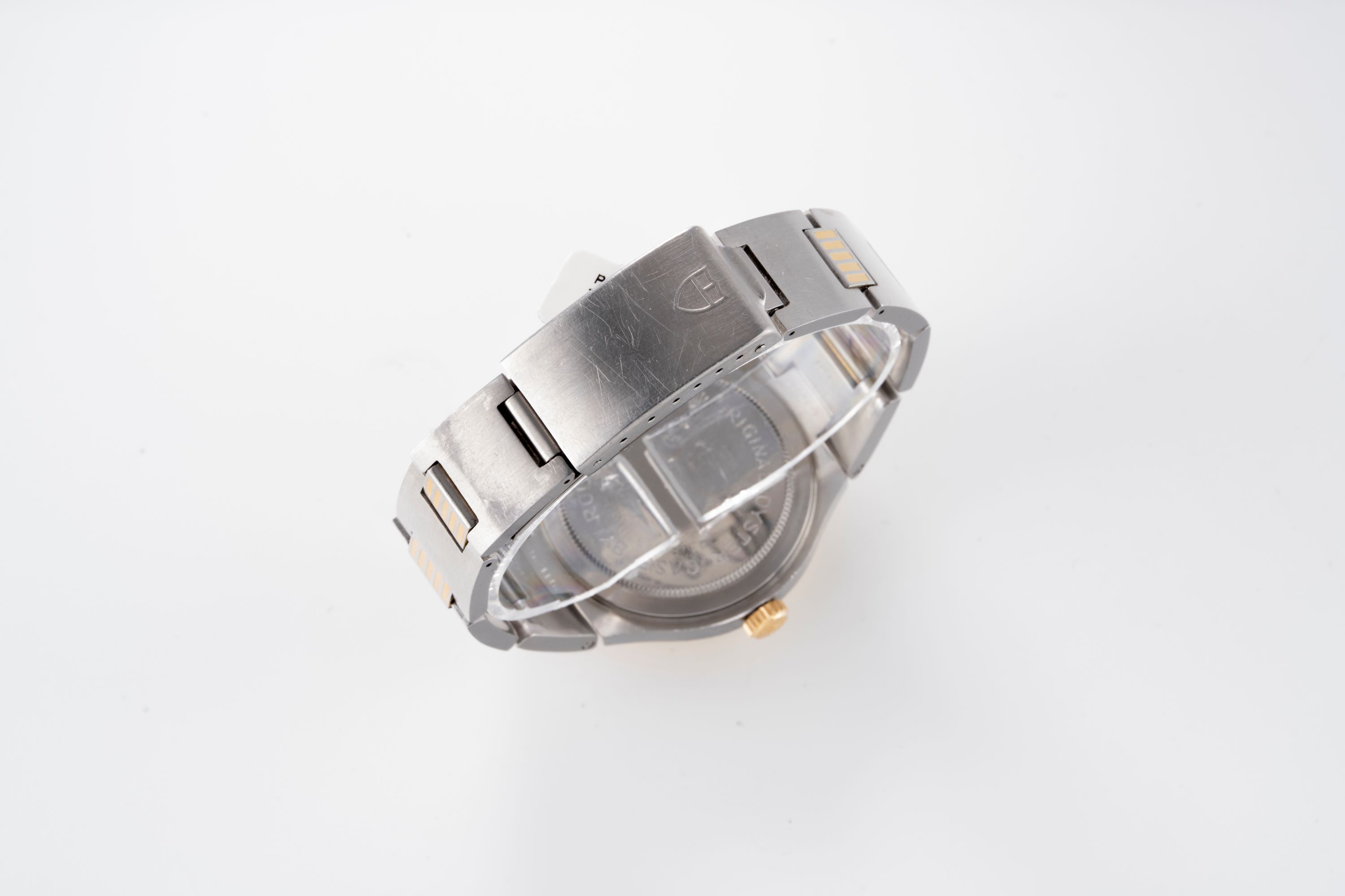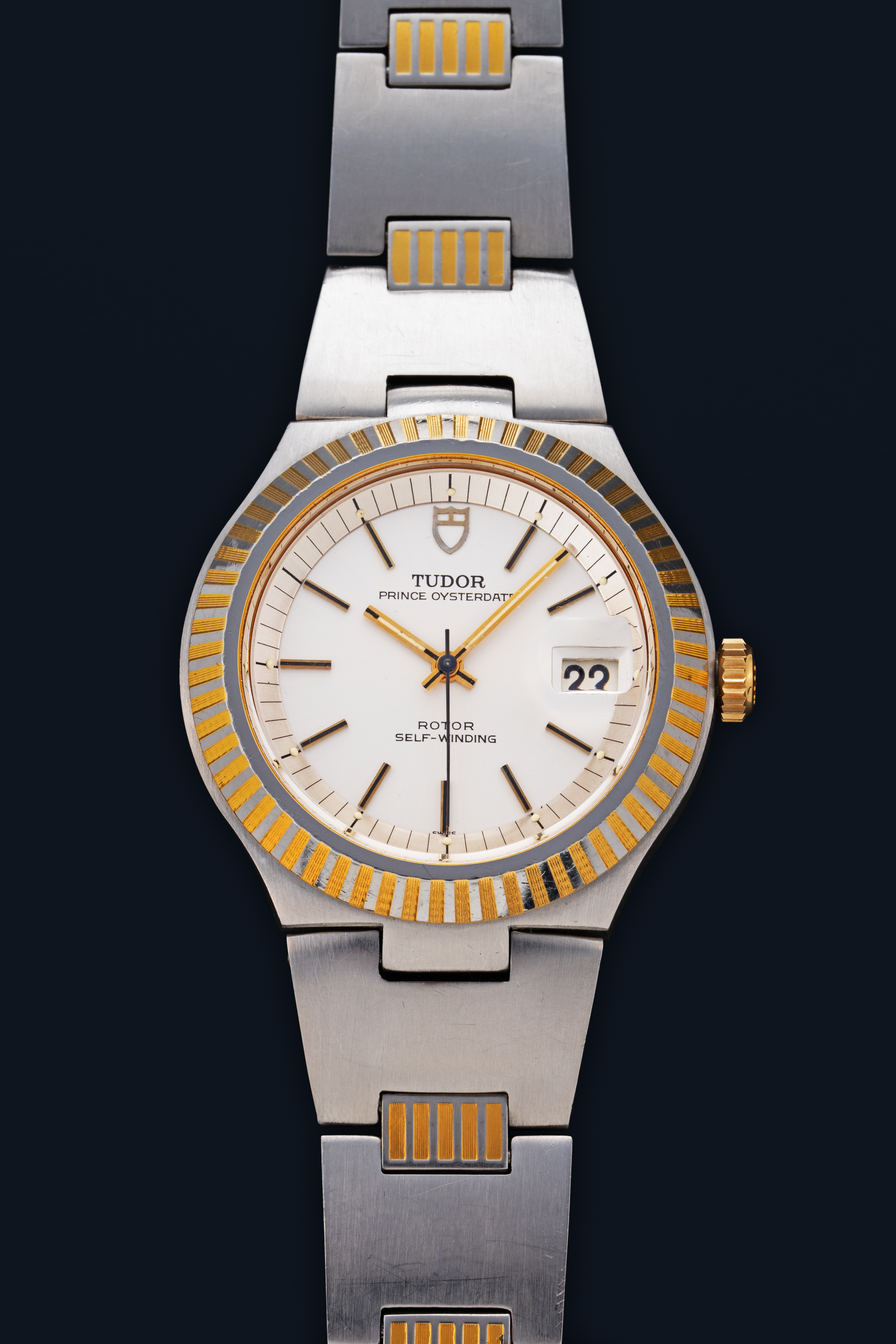 DialSilver dial with applied indices, gold luminous hands, date window at 3 o'clock, signed 'Tudor' at 12 o'clock