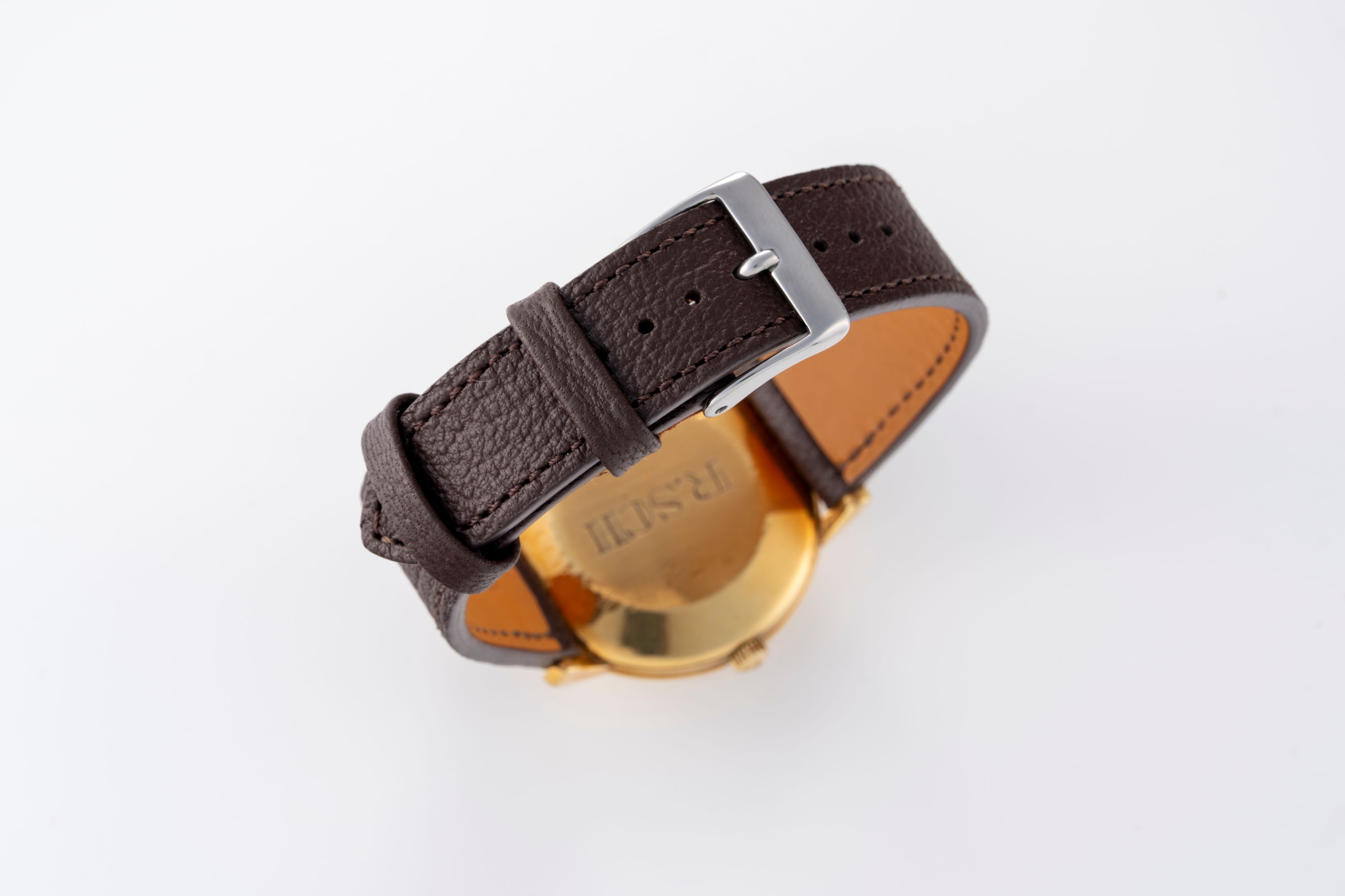 CaseRound case in 18k yellow gold with crown at 3 o'clock, solid caseback with personalized engraving