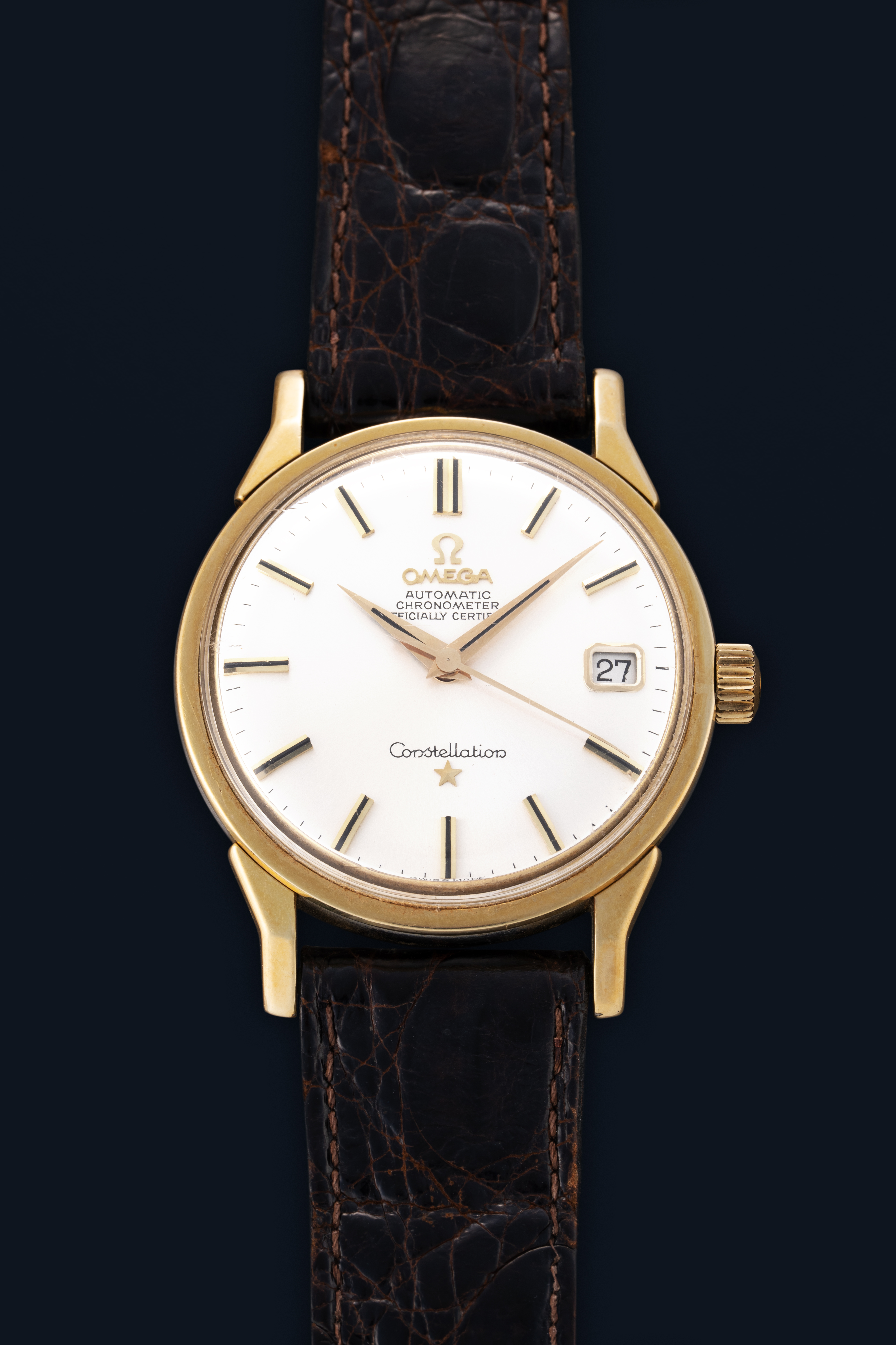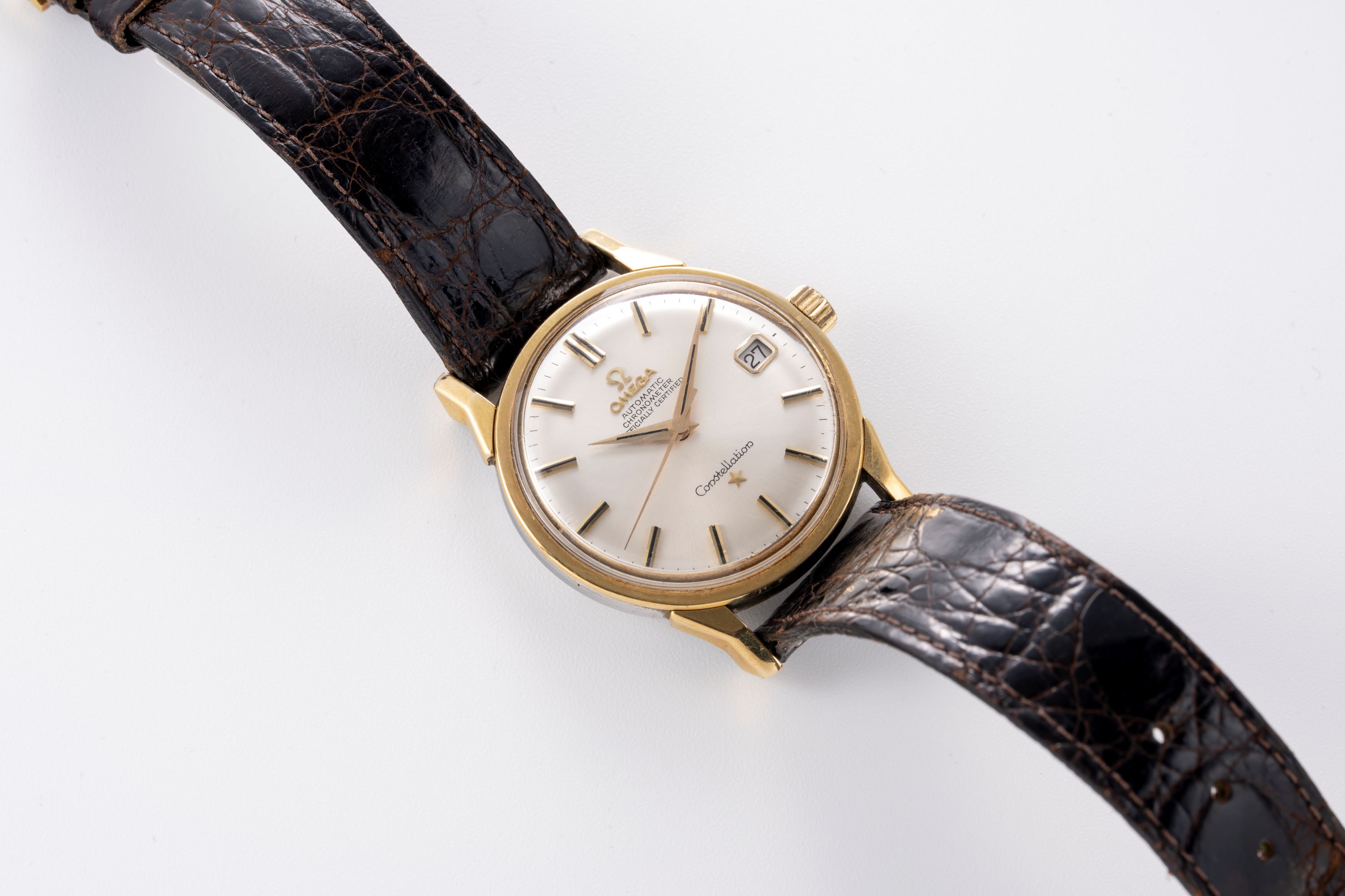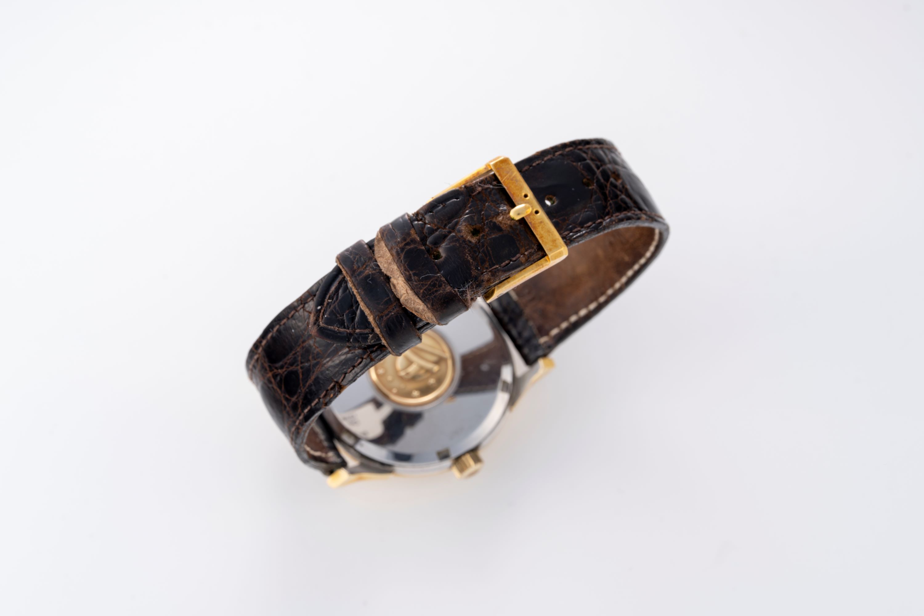 DialSilver dial with applied indices, gold hands, date window at 3 o'clock, signed 'Omega' at 12 o'clock