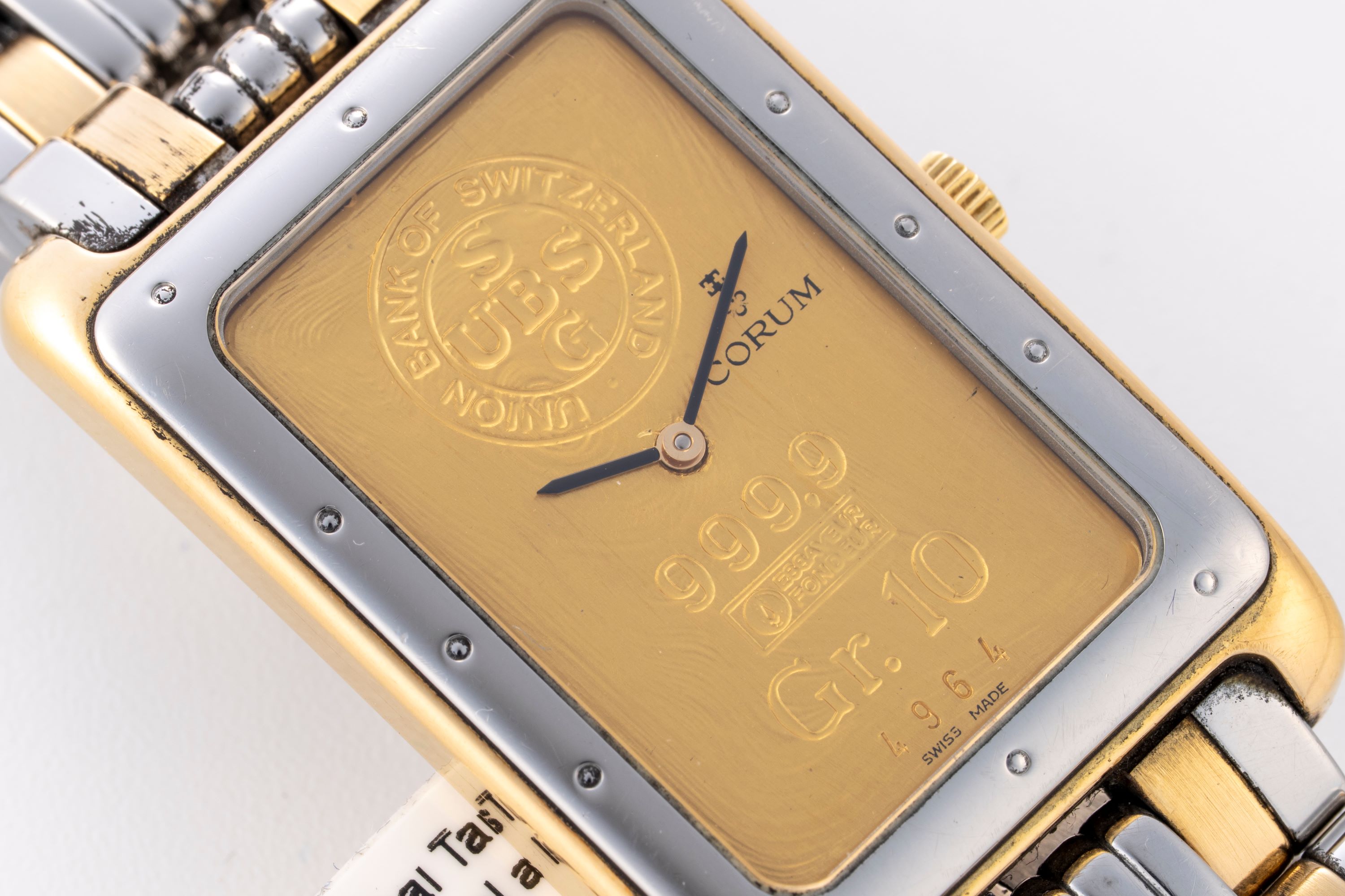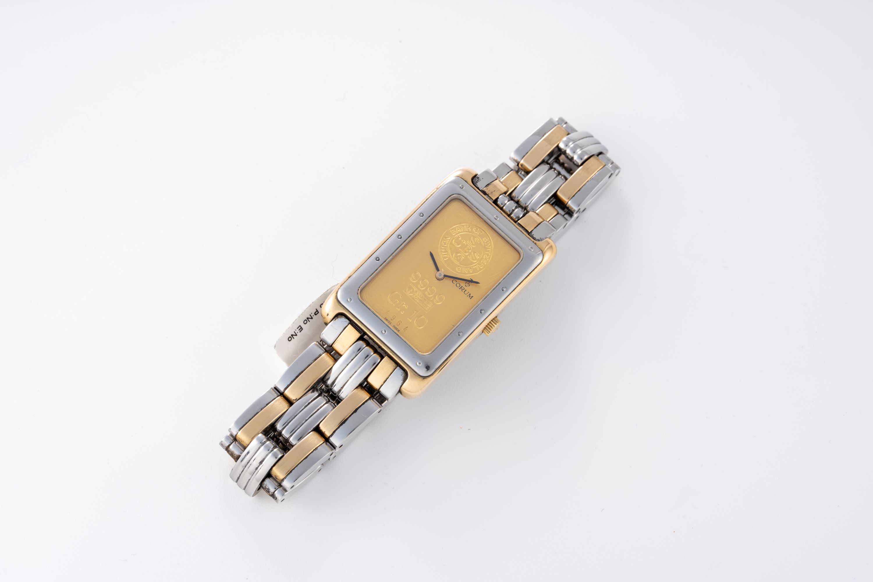 Dial10g 24k gold bar dial with black stick hands, signed 'Corum' at 12 o'clock