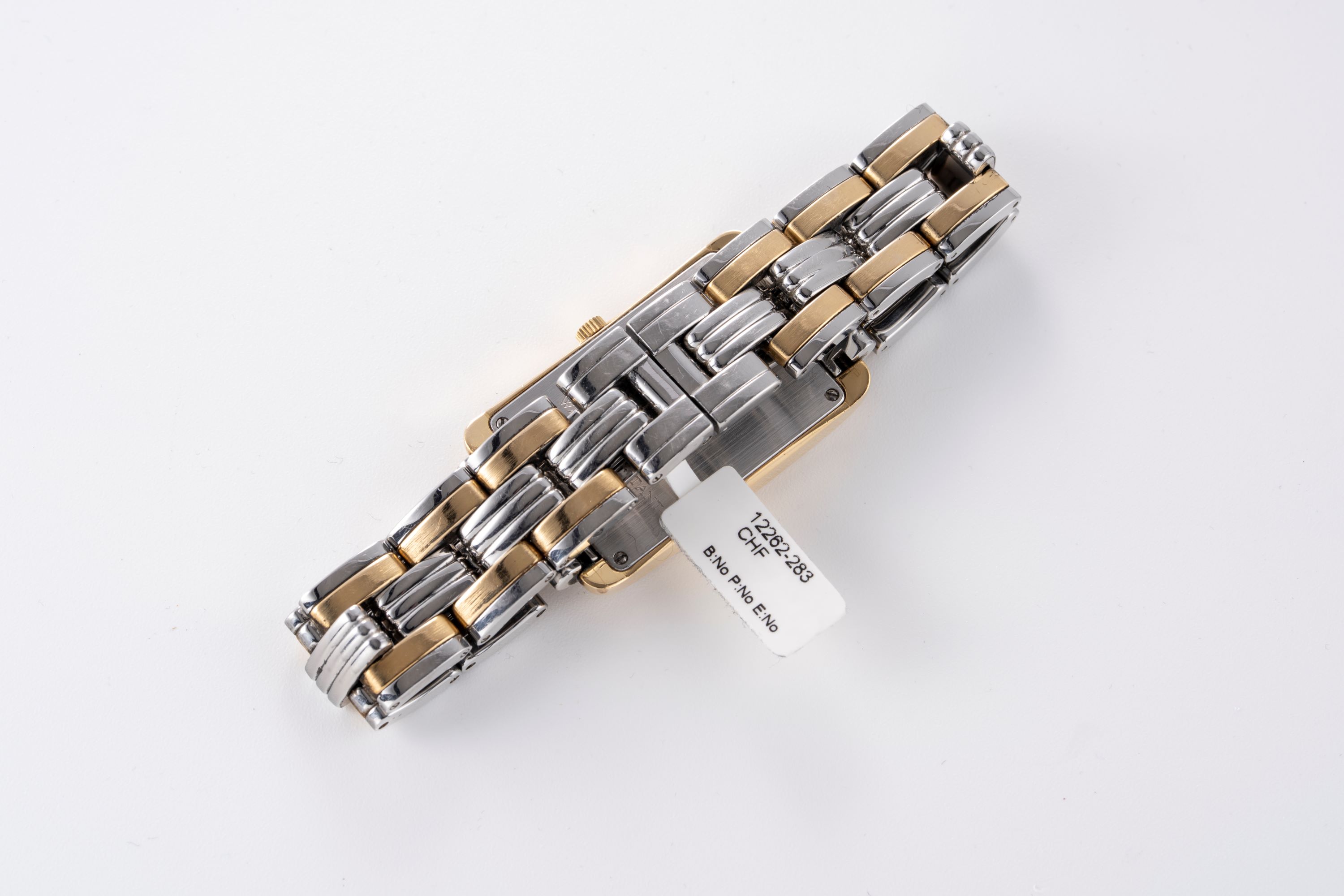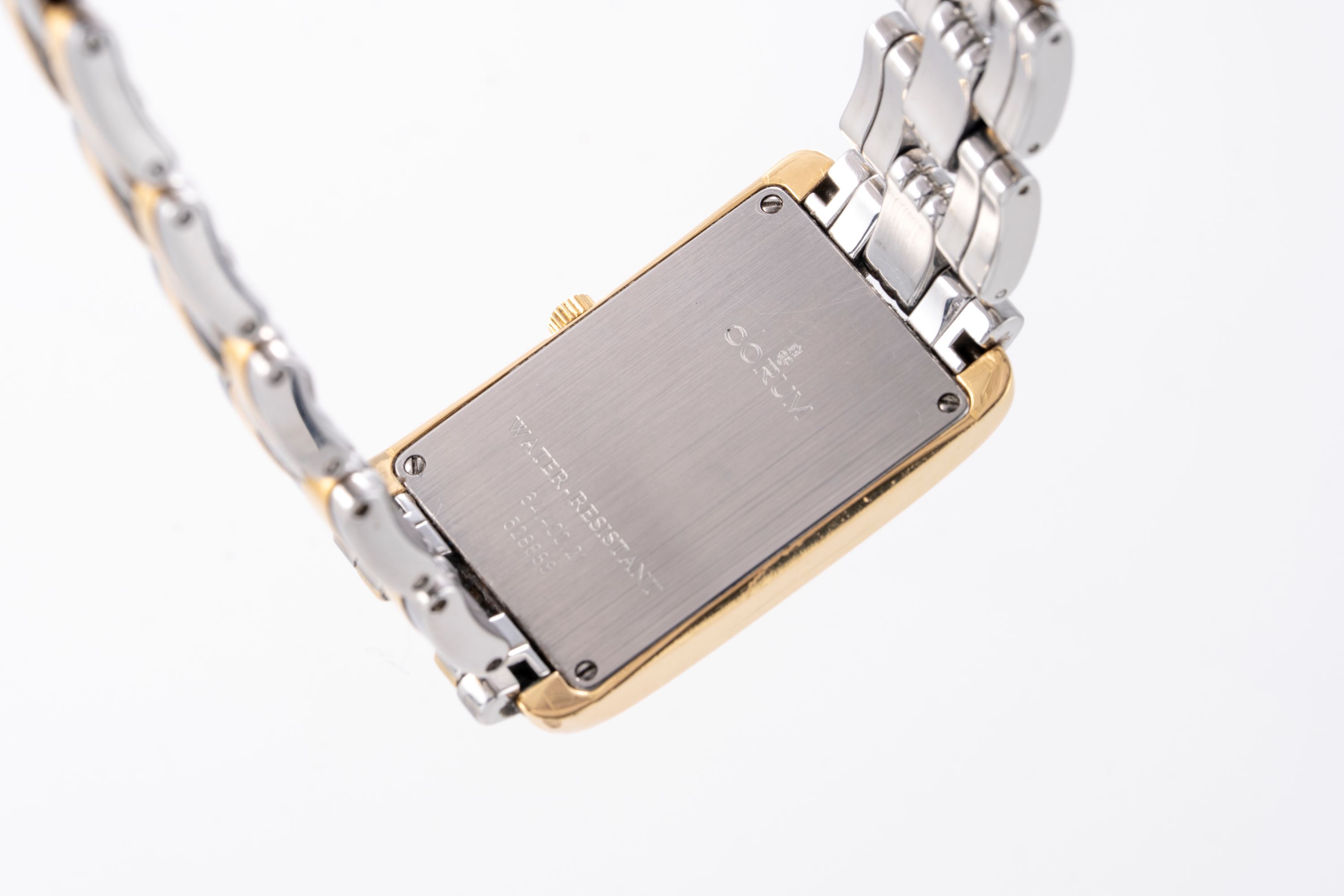 CaseRectangular case in stainless steel and gold plated flanks, solid caseback