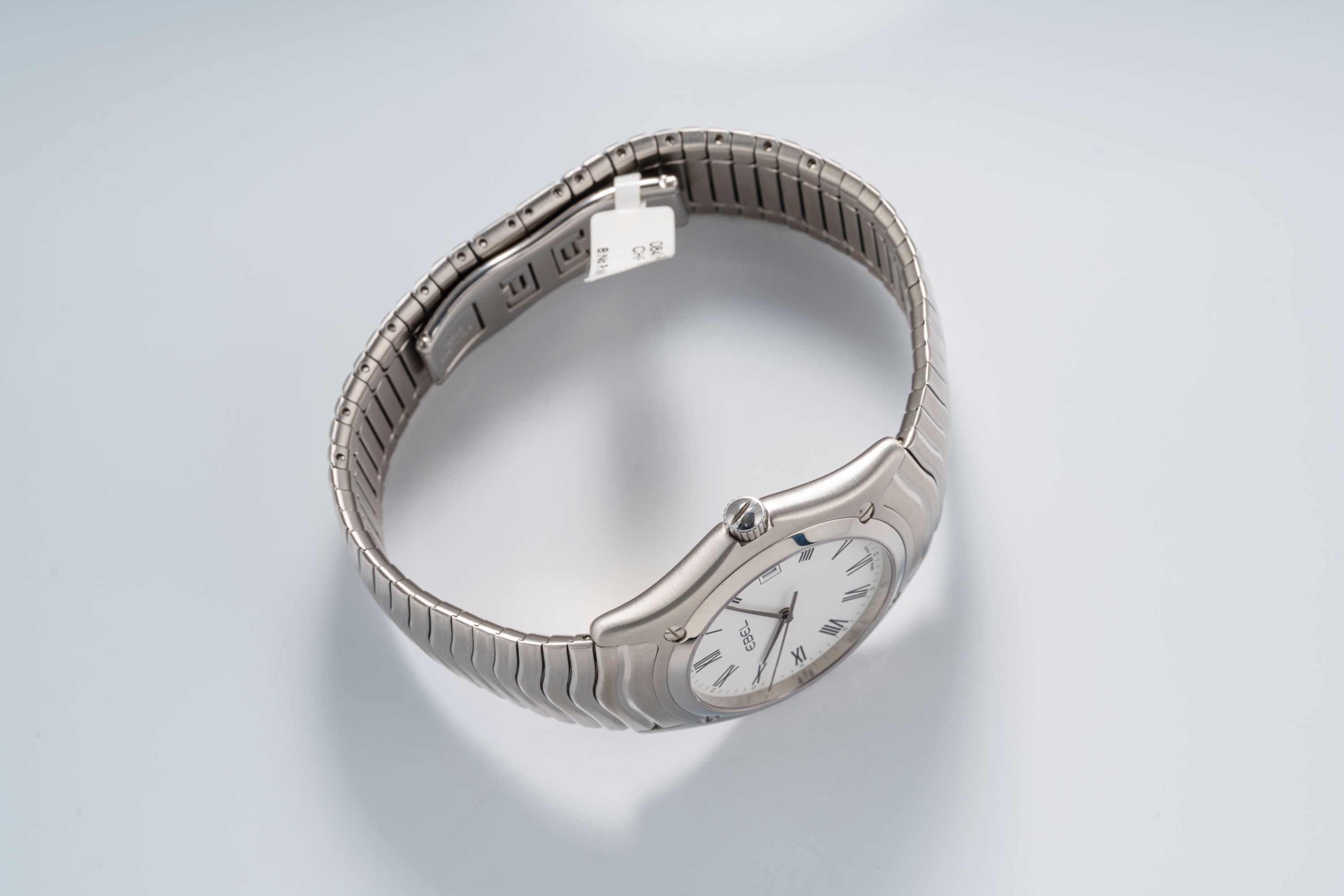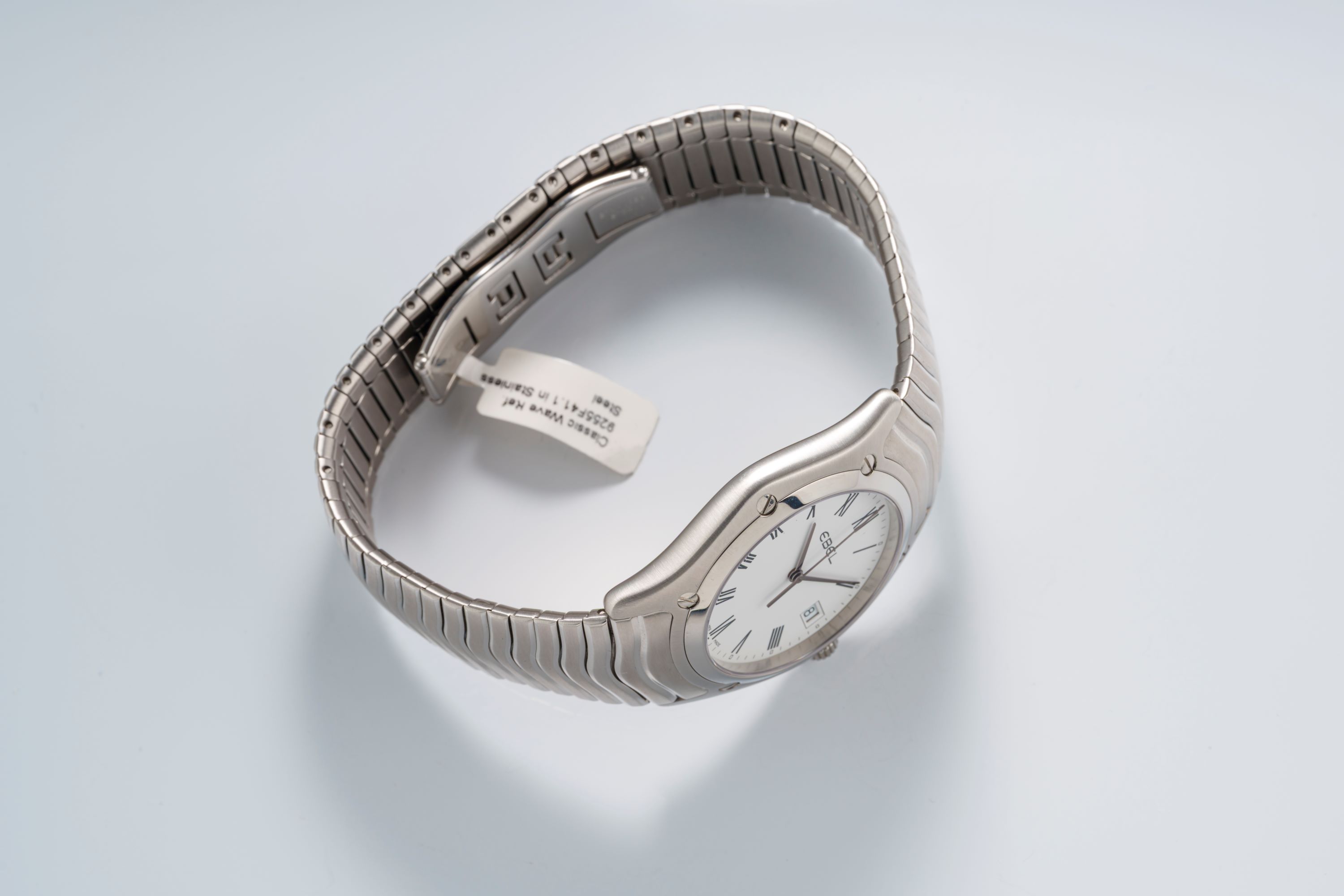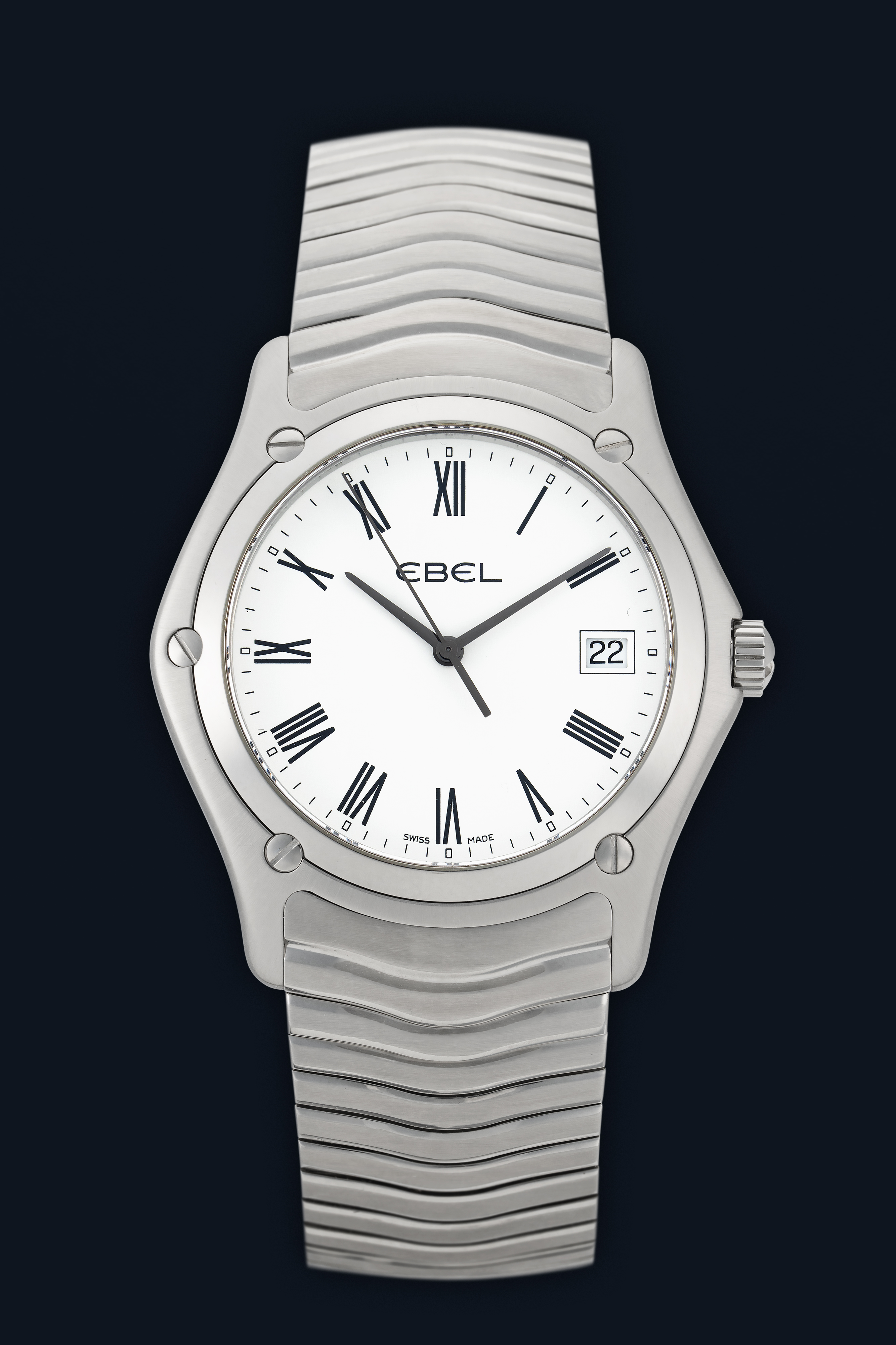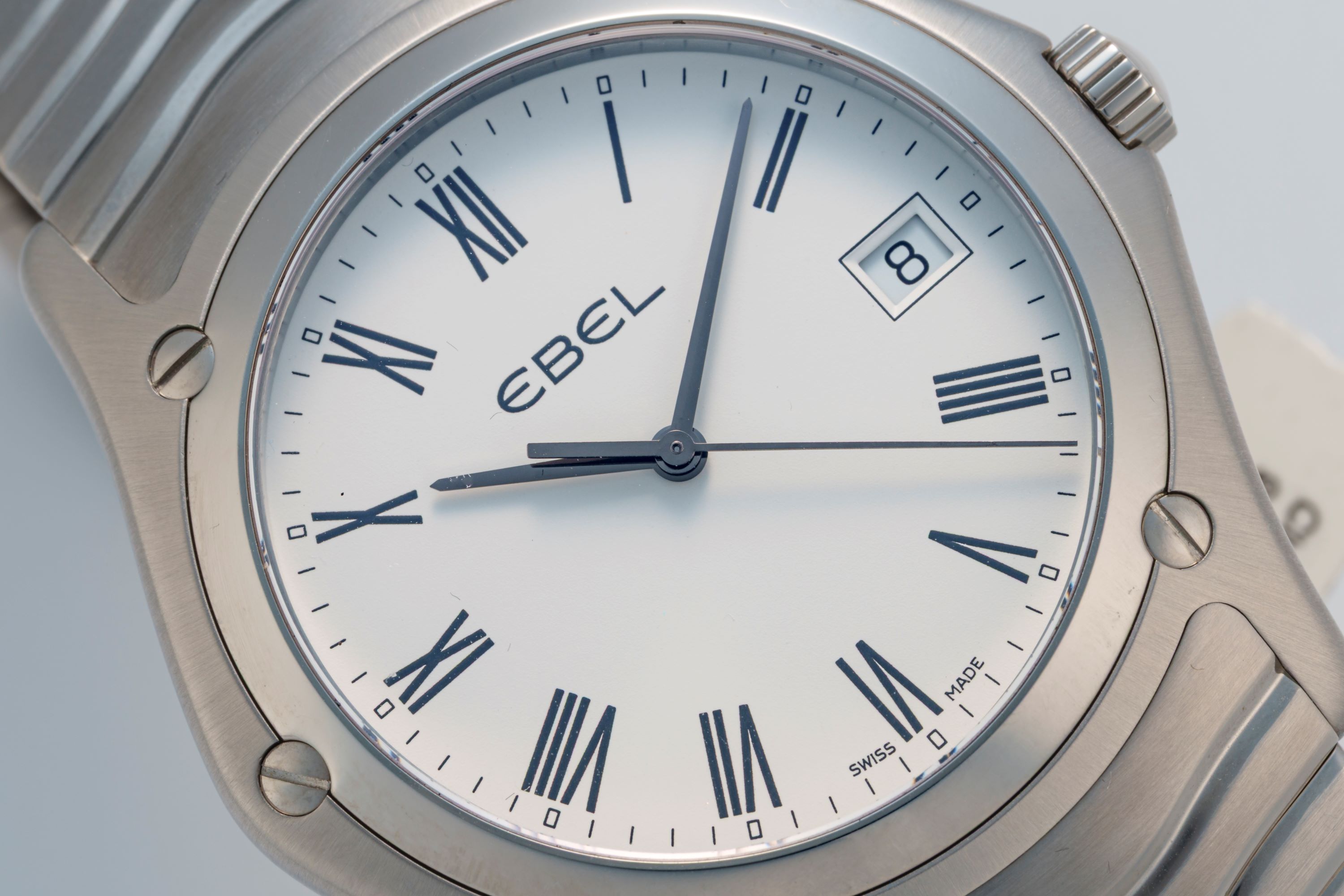 DialWhite dial with Roman numerals, date window at 3 o'clock, signed 'Ebel' at 12 o'clock