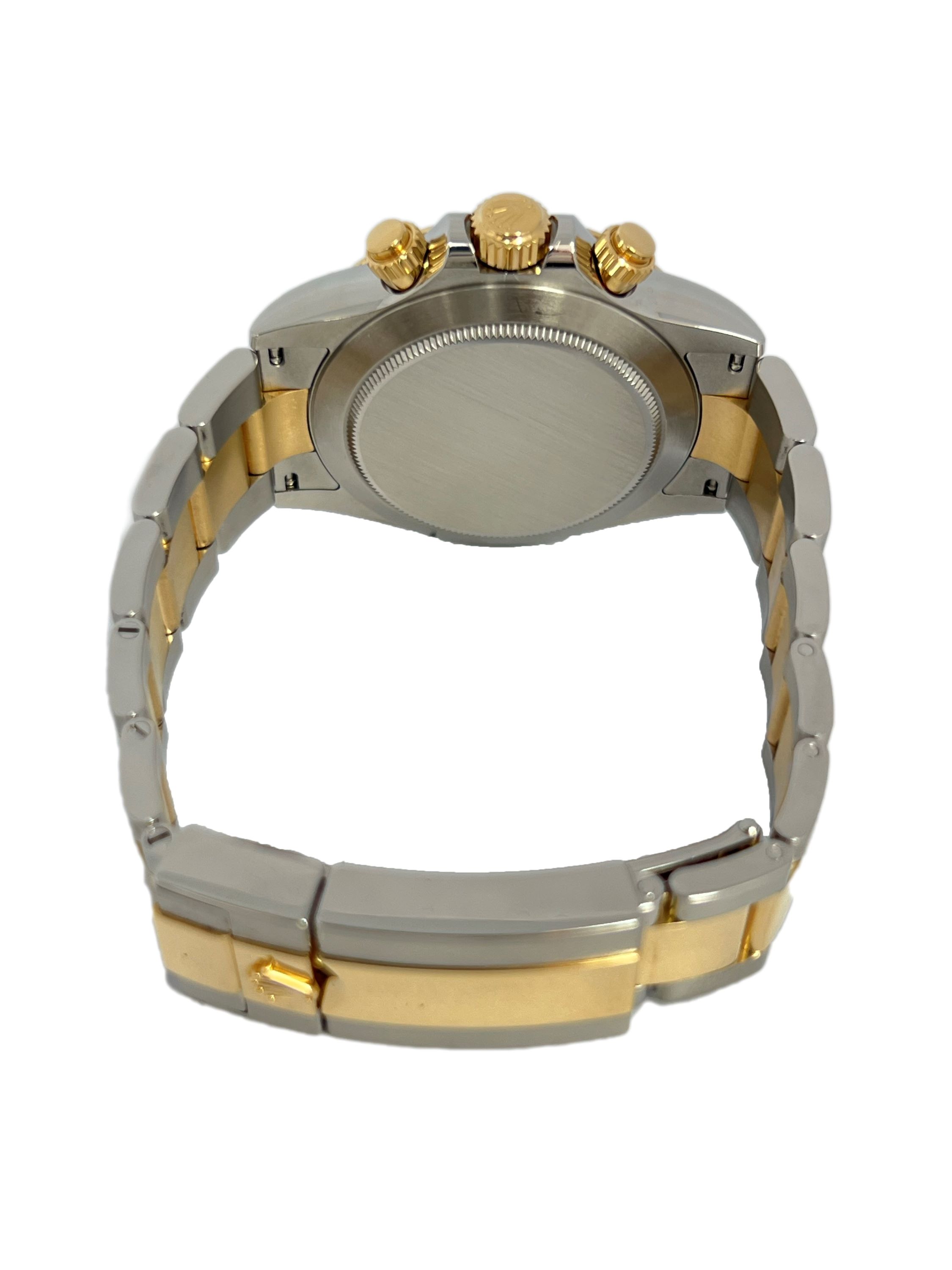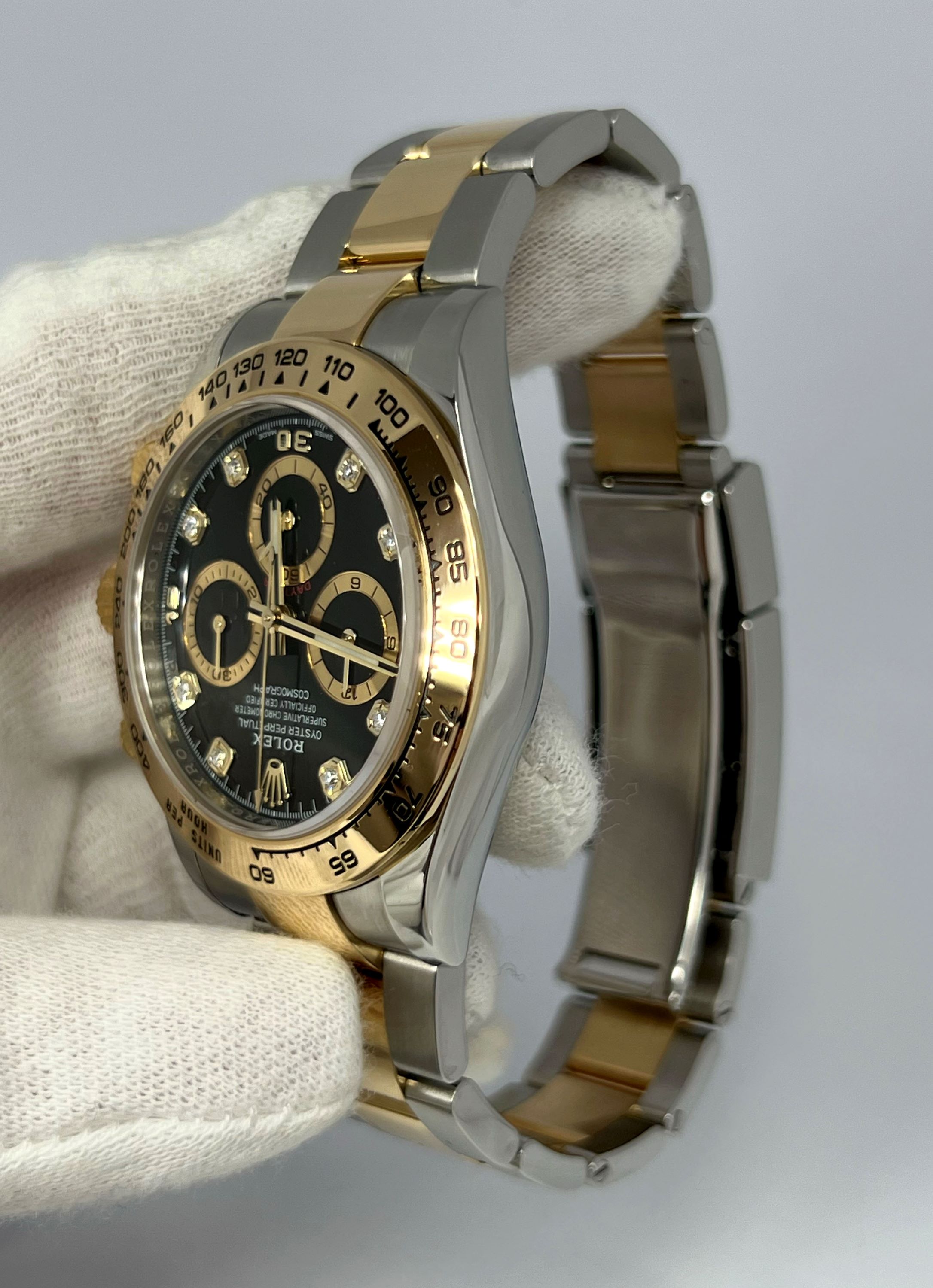 DialBlack dial, signed “Rolex”, 8 applied gold diamond indexes, luminous hour and minute hands, chrono central seconds hand, counters with gold toned outline: small seconds at 6 o’clock, 30-minute counter at 3 o’clock, 12-hour counter at 9 o’clock