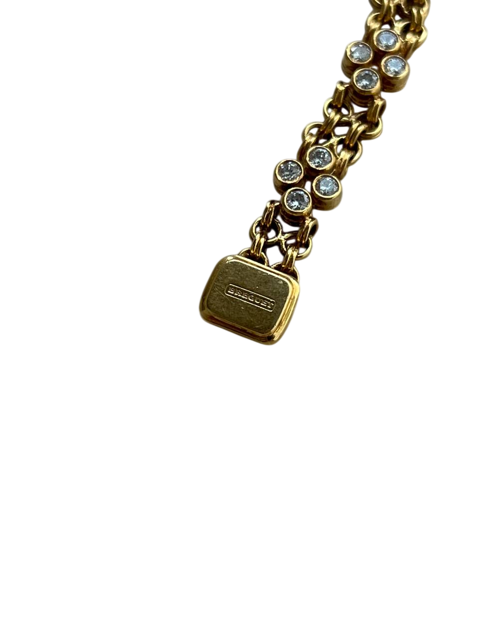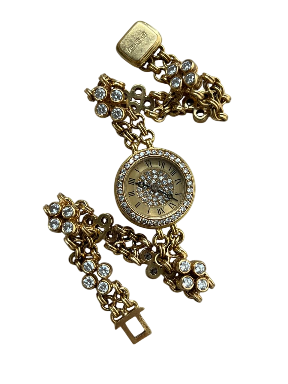 CaseRound case in 18k yellow gold, diamond-set bezel, solid gold caseback, concealed winding crown on the caseback
