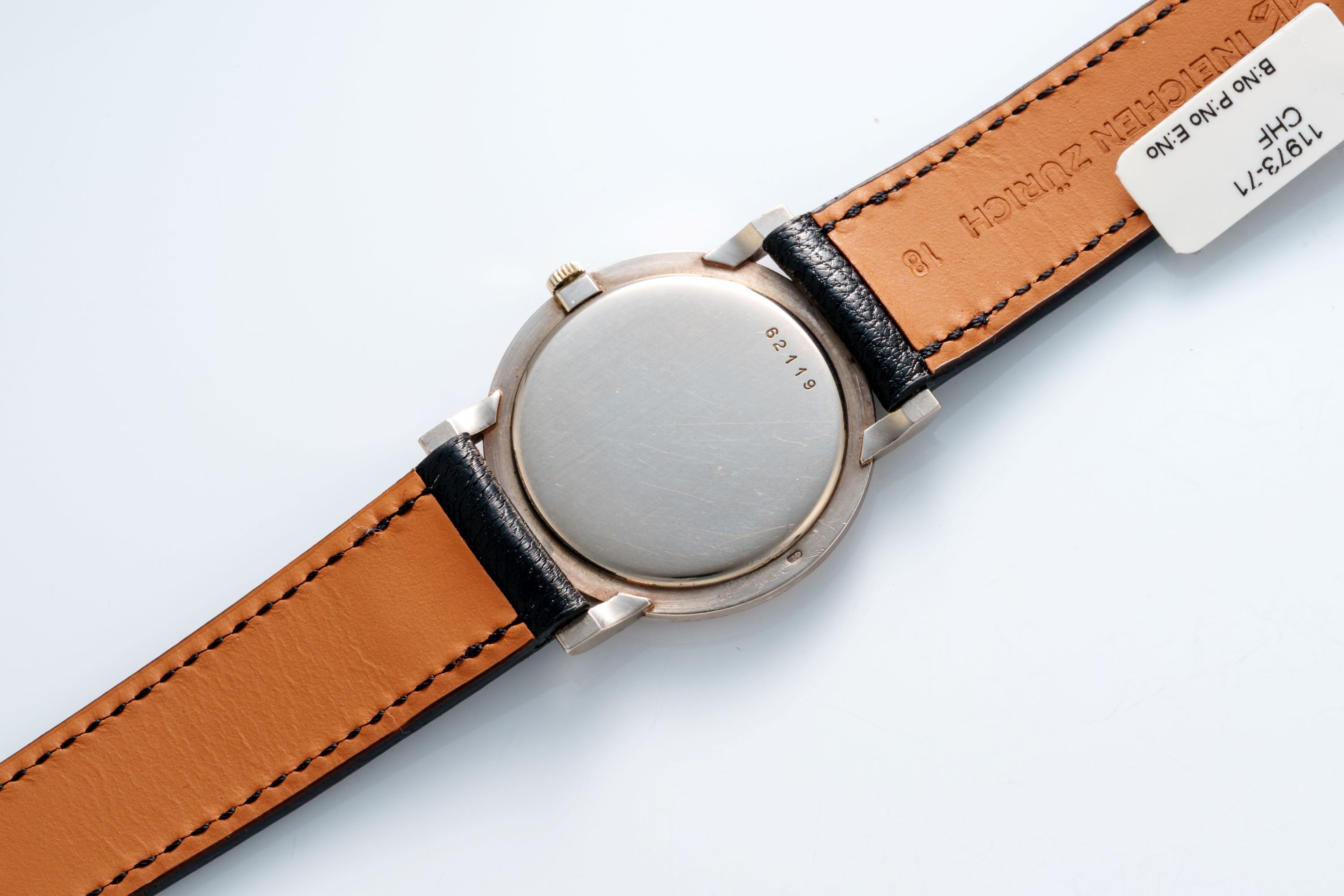 CaseRound case in 18k white gold with winding crown at 3 o'clock, solid caseback