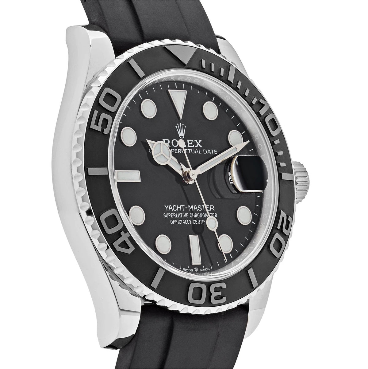 Case42mm 18K white gold case, screw-down crown with triplock triple waterproofness system, bidirectional rotatable 60-minute graduated bezel with matt black Cerachrom insert in ceramic, scratch-resistant sapphire crystal