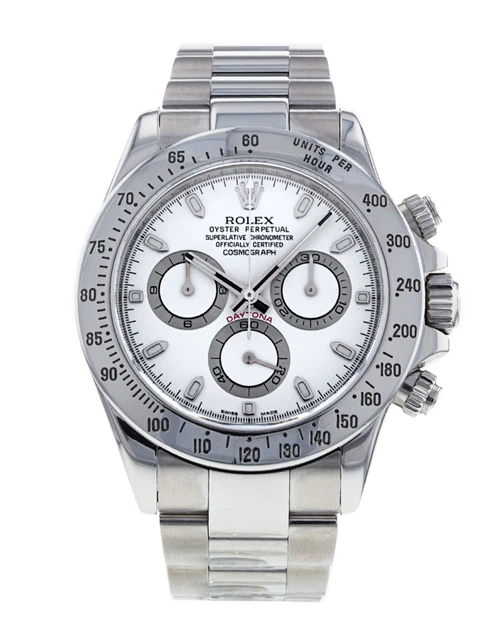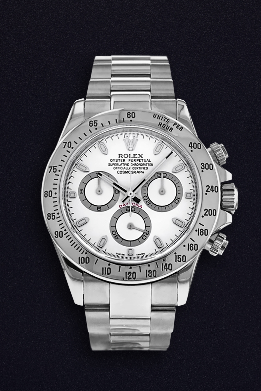 DialWhite dial with silver ring sub dials and applied, framed, luminescent-filled stick hour markers, and luminescent-filled hands.