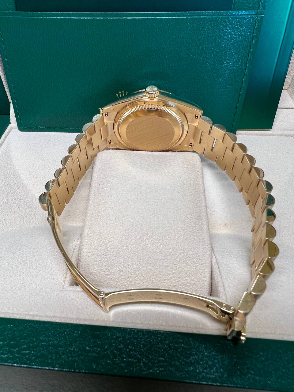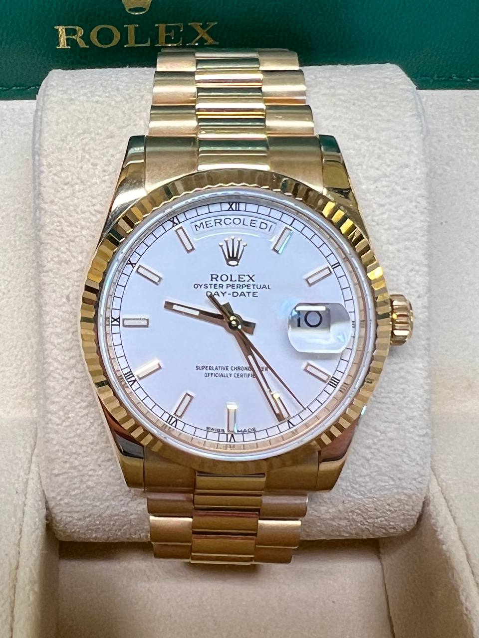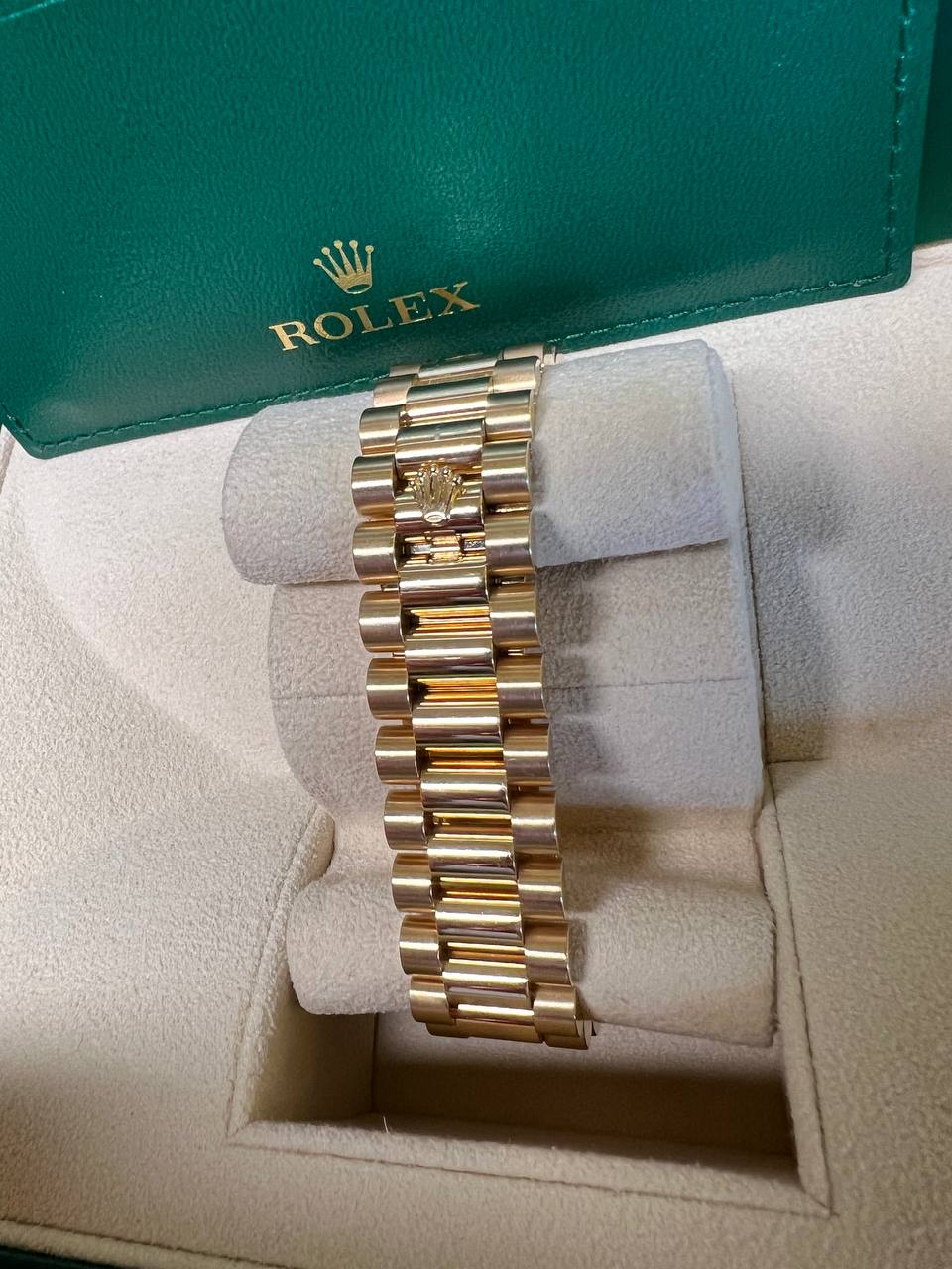 Dial‘Ivory’ dial, signed Rolex Oyster Perpetual Day-Date, applied Rolex coronet at 12 o’clock, polished and facetted baguette hour, minute and seconds hands, hour and minute hands luminous, date aperture at 3 o’clock under Cyclops lens, day of the week aperture at 12 o’clock, rectangular gold applied indexes, luminous, outer ‘railway’ hour, minute and seconds track with small Roman numerals