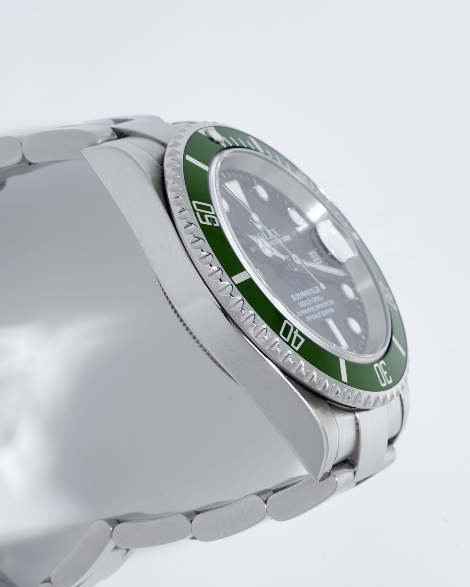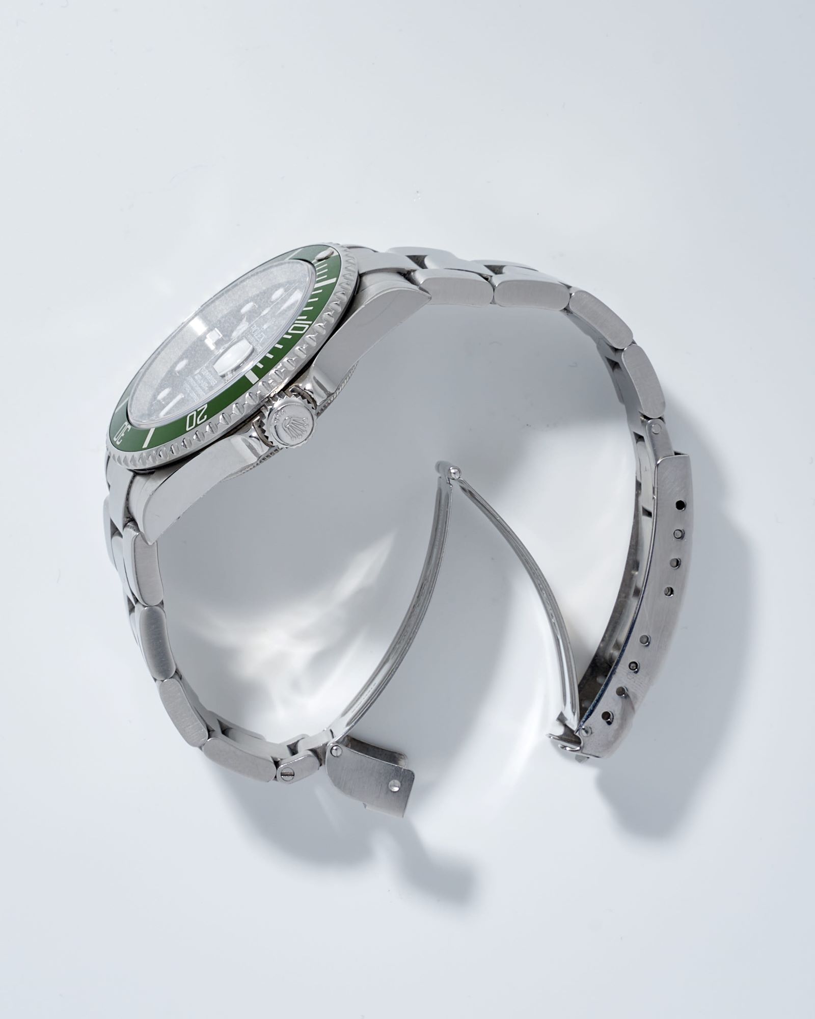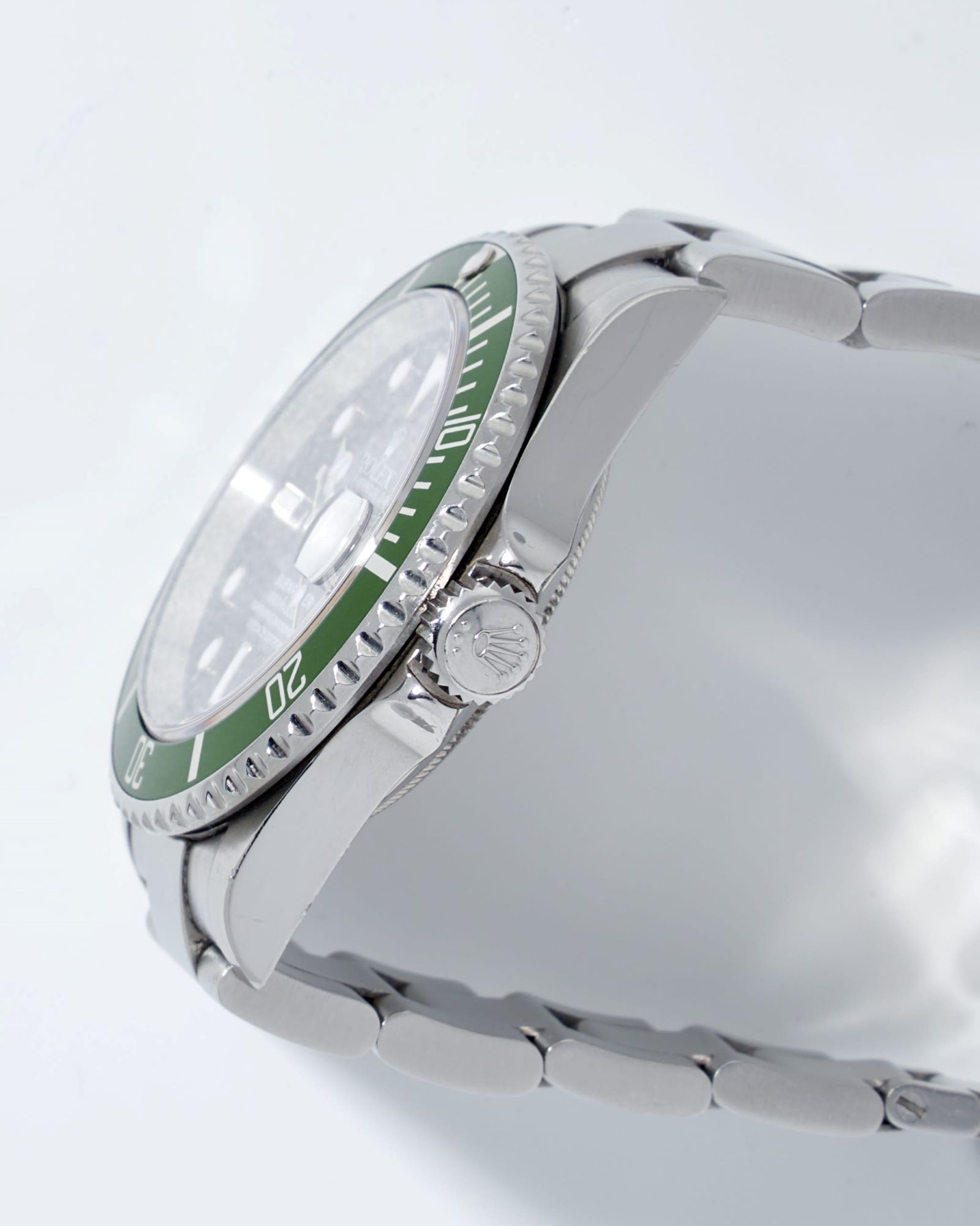 CaseRound case in stainless steel, brushed and polished, screw down Oyster crown at 3 o’clock with embossed Rolex coronet, unidirectional bezel with a green aluminum insert, 60-minute scale and luminous zero marker, screwed solid caseback in stainless steel